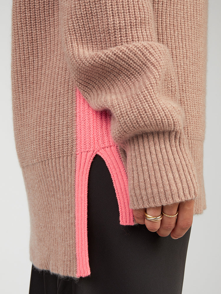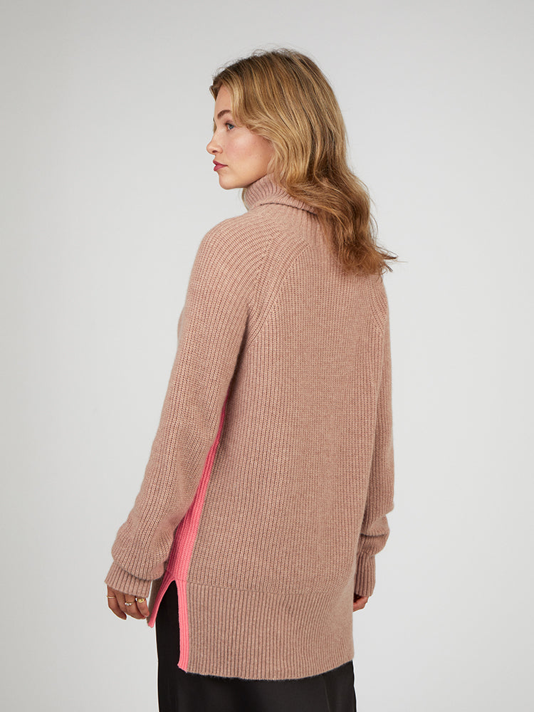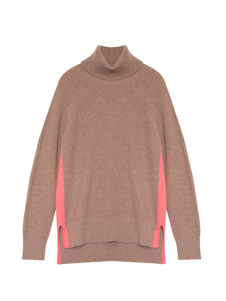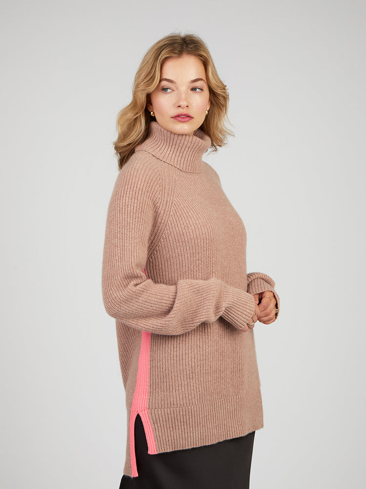 Effortlessly chic, the longline Etta jumper features subtle contrast colour and fashioning details along the side seams. Designed with a relaxed, boxy fit, raglan sleeves, and a warm roll neck, it’s finished with a stepped hem and side slits for ease and movement, perfect for layering in style.