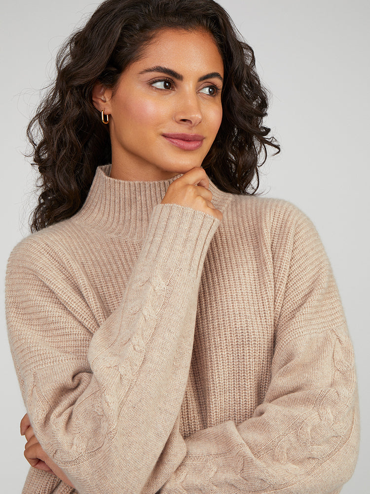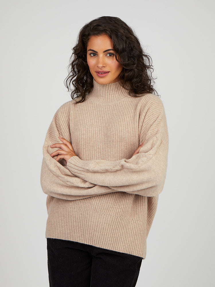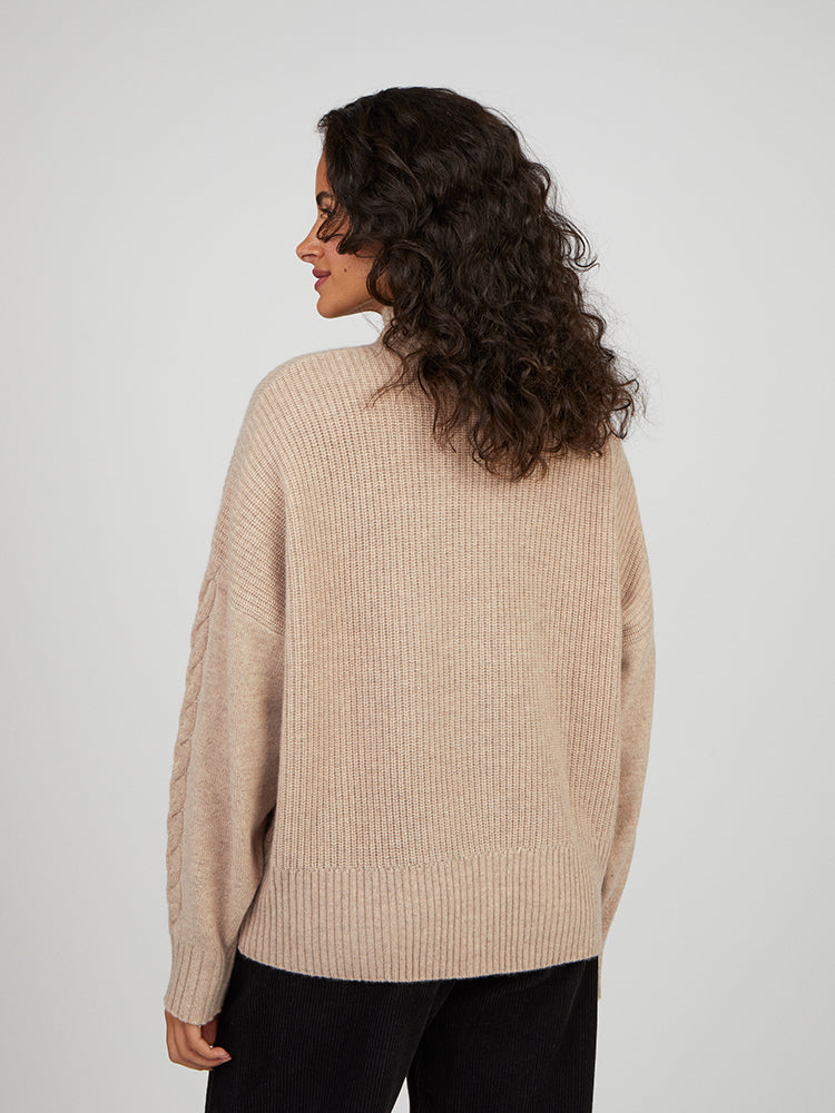 Crafted from soft melange cashmere, the Ines jumper blends a relaxed silhouette with elevated detail. Featuring a chunky rib knit with a subtle cable running along the overarm, it’s designed with a high neck, drop shoulders, and a slightly longer back for an effortlessly flattering shape. A modern wardrobe staple with a luxurious twist.