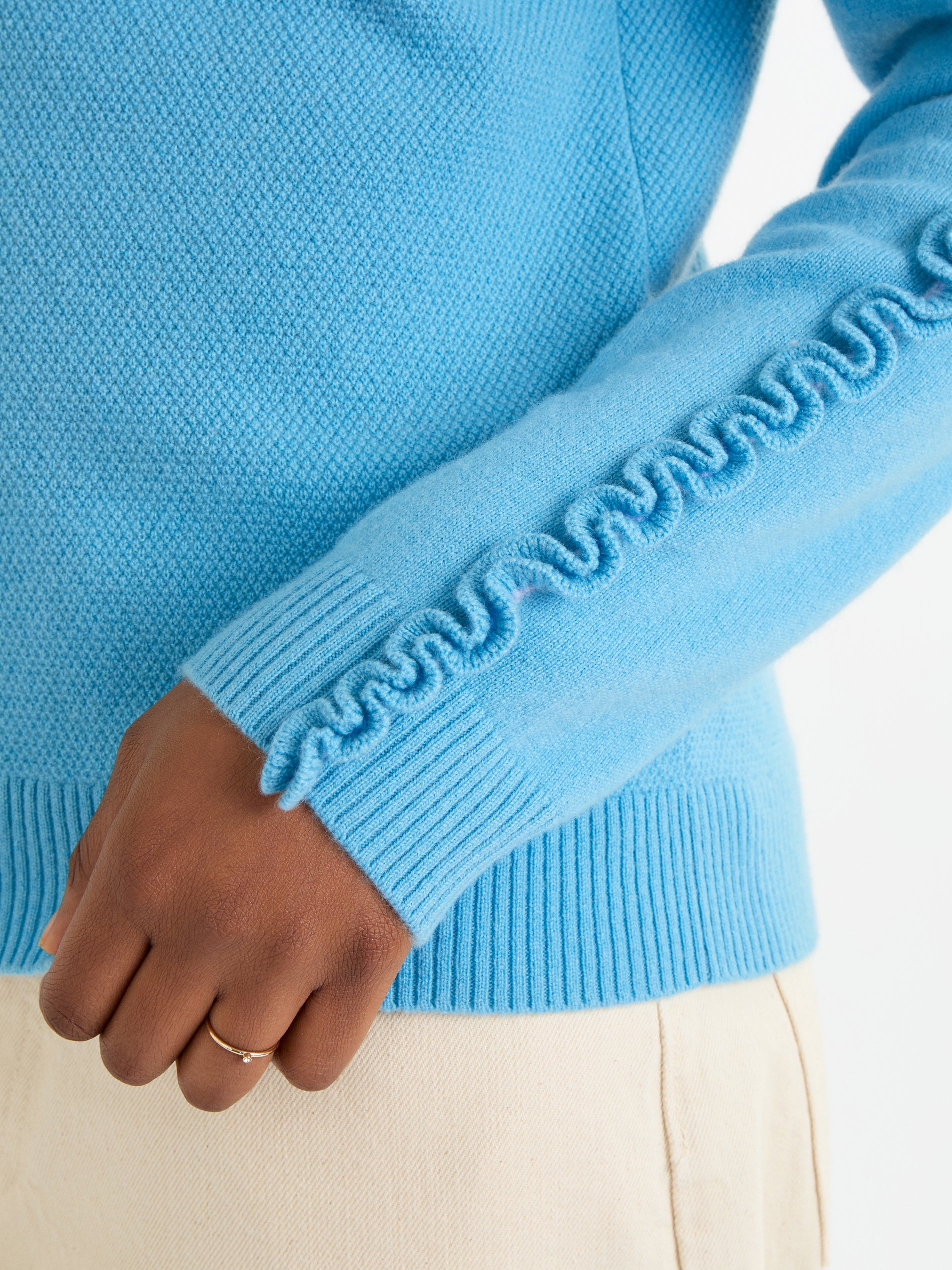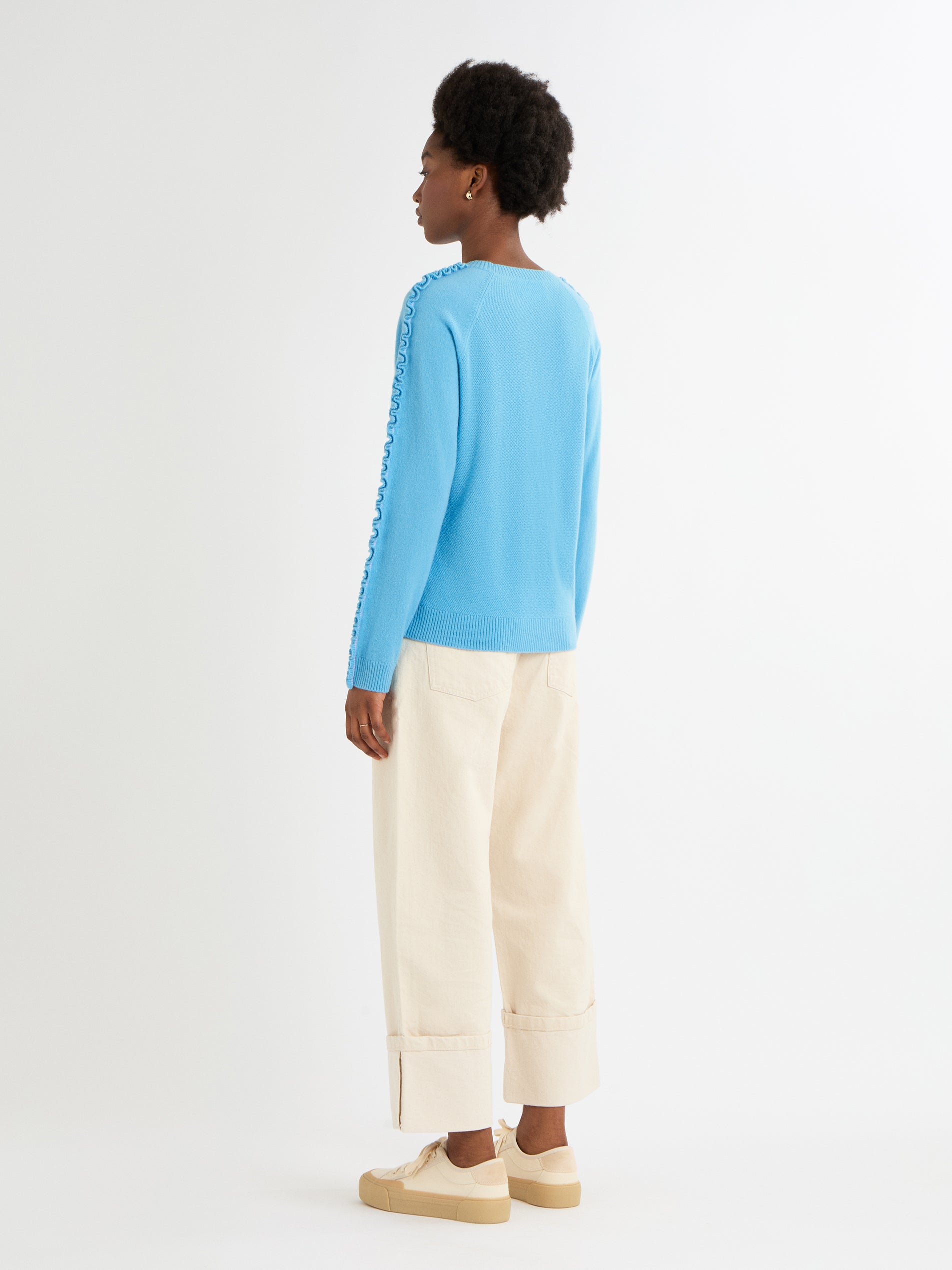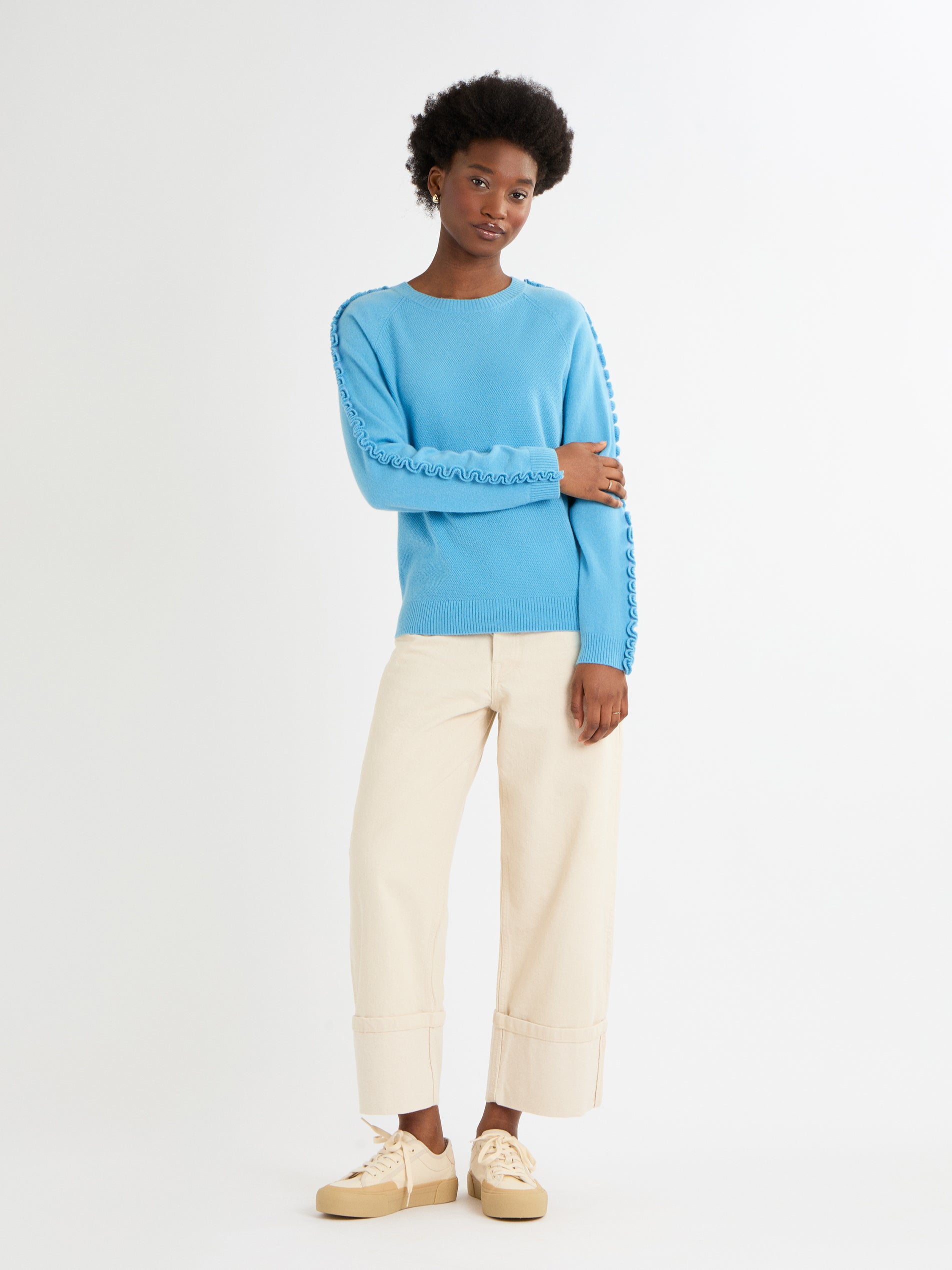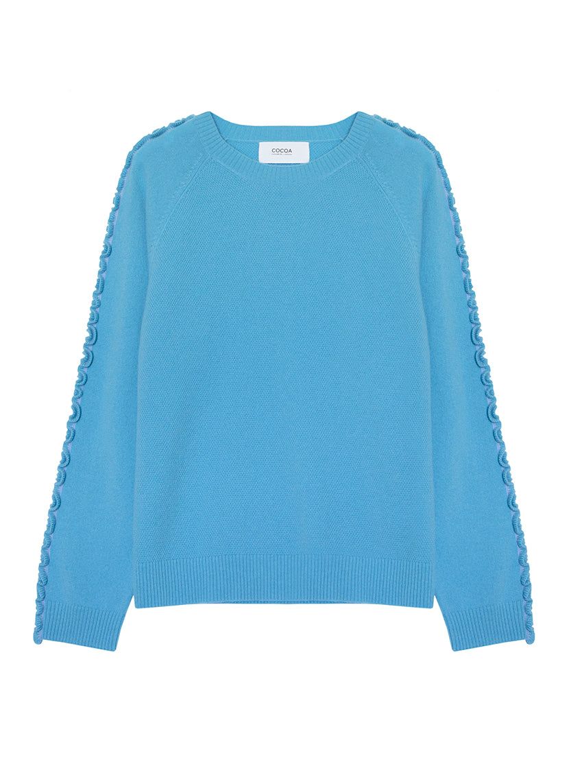 The Katelyn Jumper is a fun, effortless knit that adds a touch of personality to your everyday style. Its relaxed, boxy shape and raglan sleeves make it easy to wear, while the soft contrast-colour ruffles along the top of the sleeves bring a playful, modern twist. Made from 100% cashmere in Boating Blue, French Navy or soft Grey Mist, this medium-weight jumper is luxuriously soft and perfect for layering, adding a cheerful, pop of detail to any outfit.