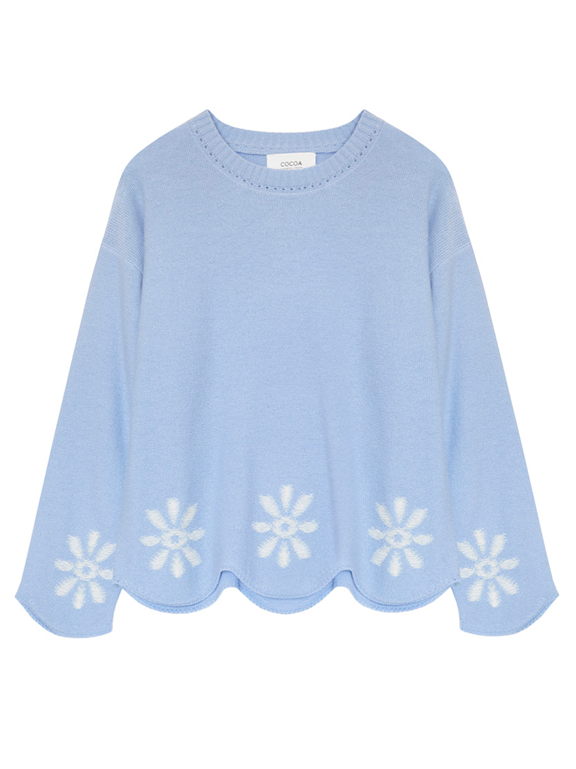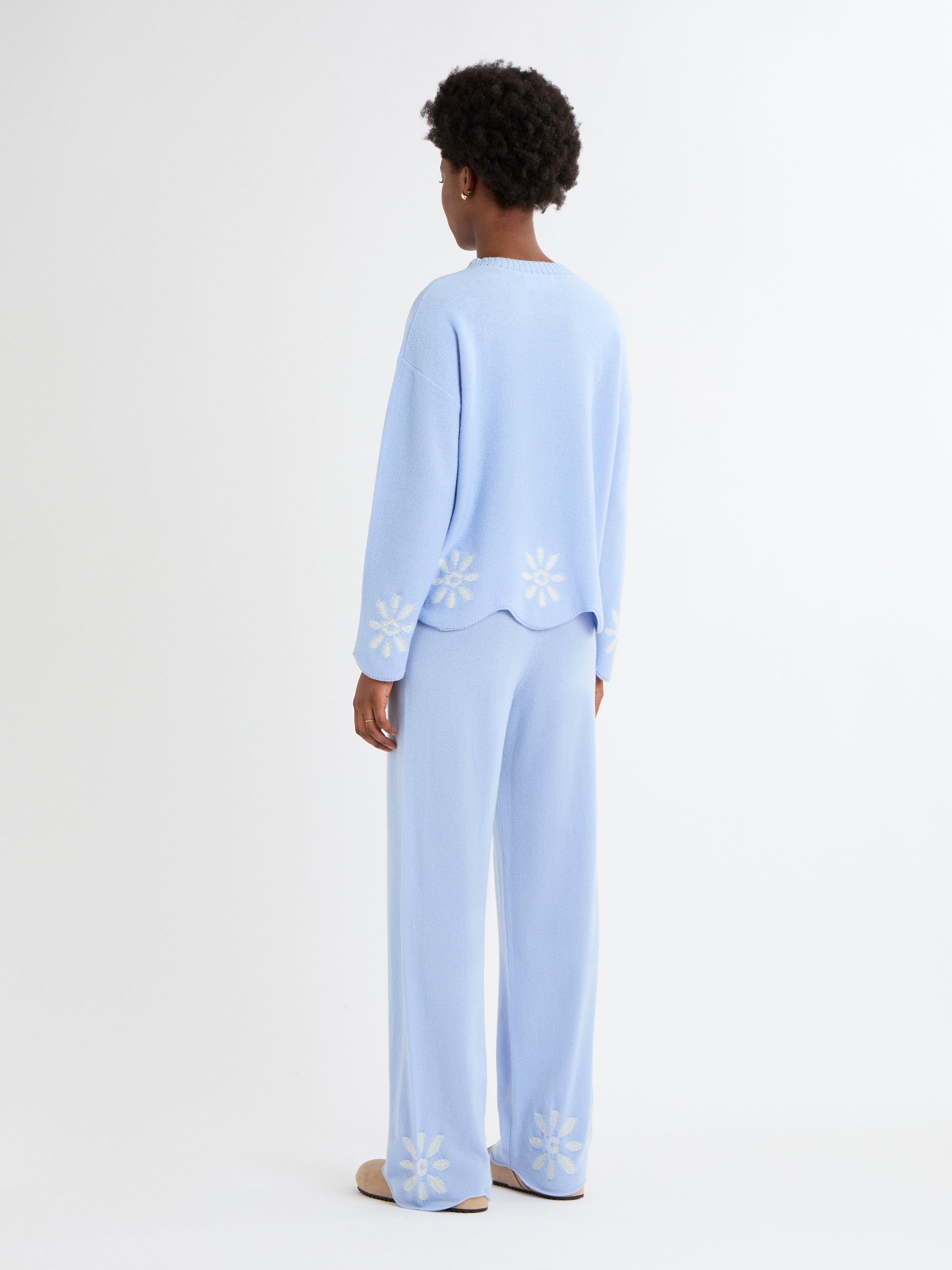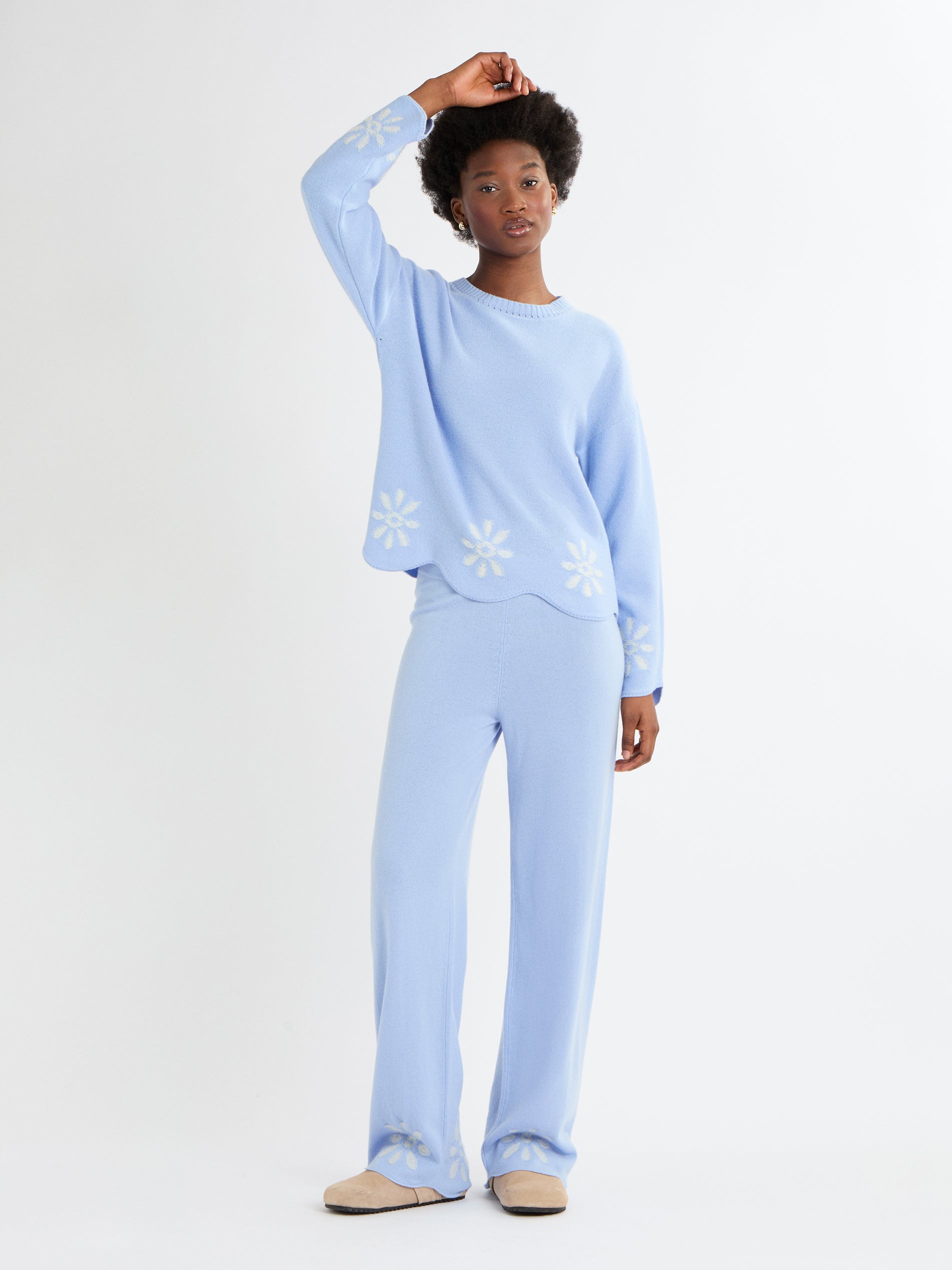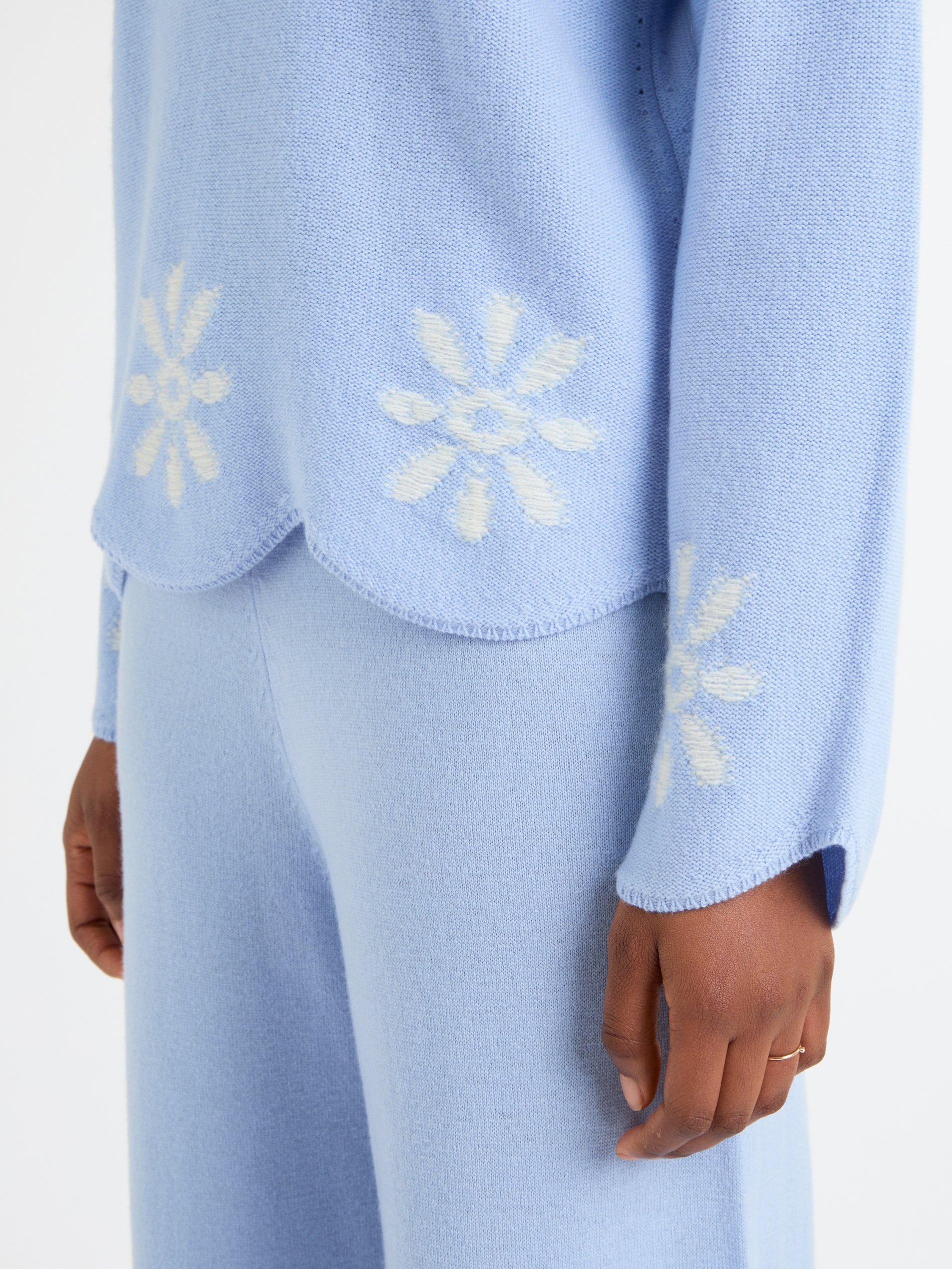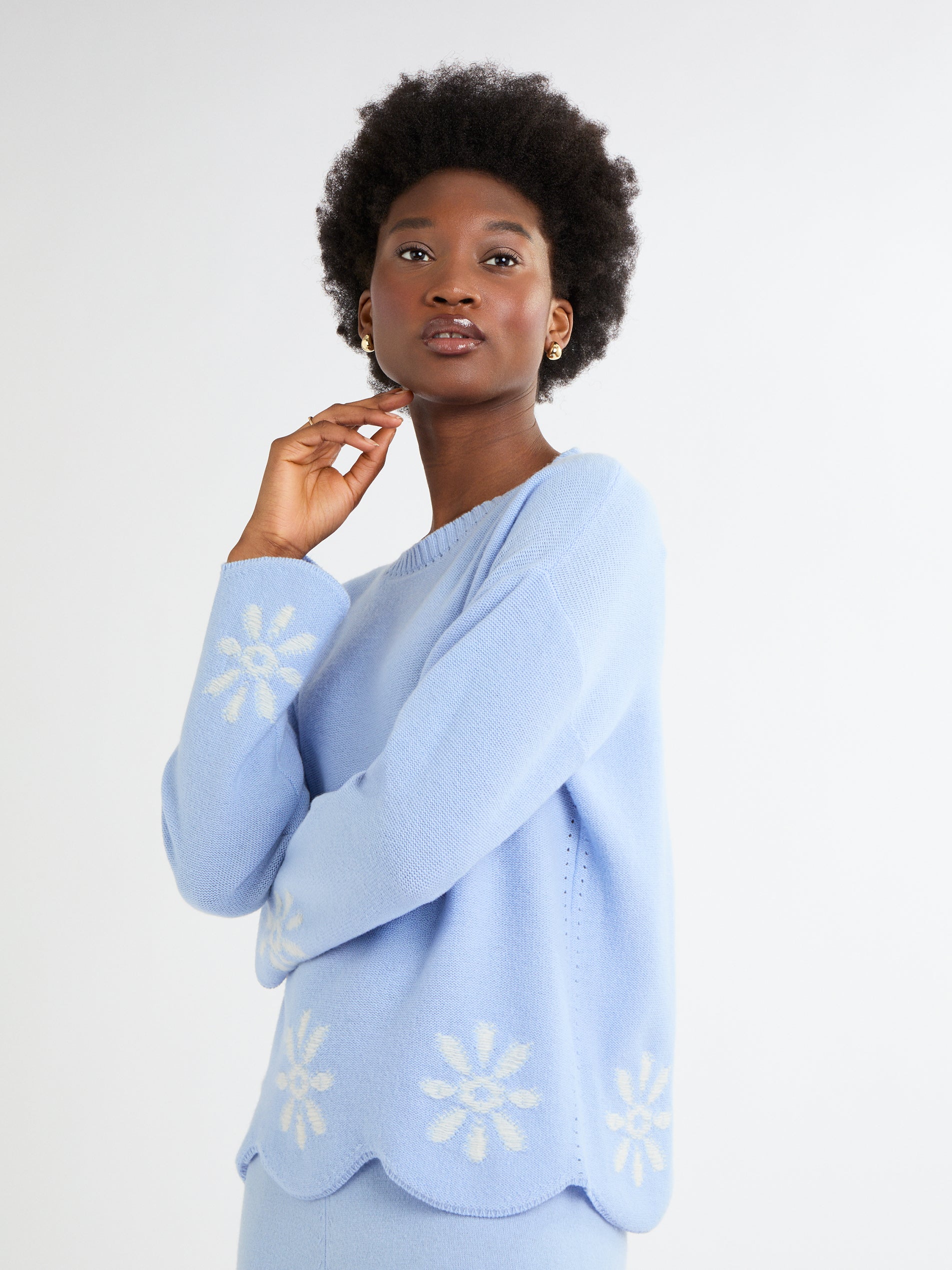 The Rosalina Jumper is a relaxed, easy-to-wear knit with a boxy shape and softly dropped shoulders. Its classic crew neck and delicate floral pattern give it a refined, feminine touch. Finished with a scalloped hem and cuffs in a pointelle pattern, this 100% cashmere jumper is luxuriously soft and perfect for layering in style. Available in soft Cornflower or warm Roasted Almond, it brings gentle colour and texture to any wardrobe.