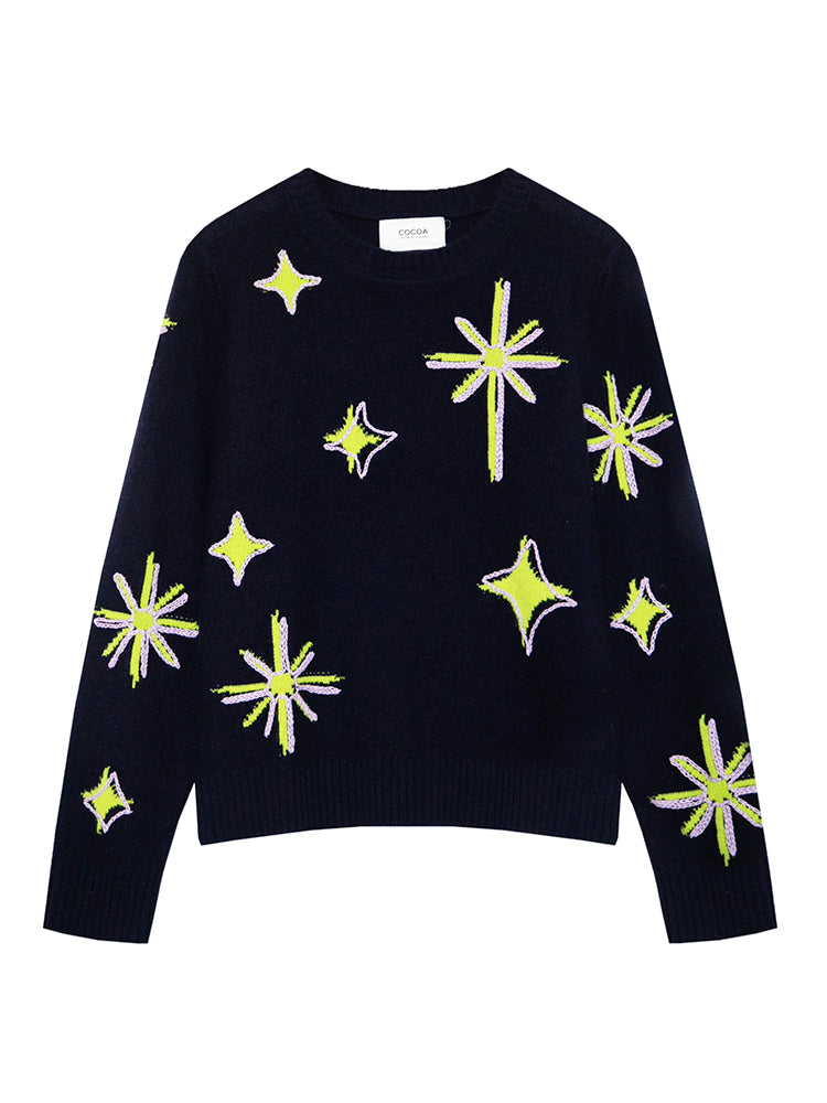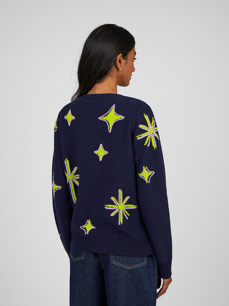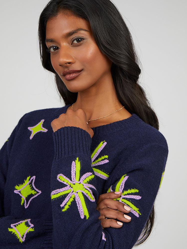 The relaxed, boxy Aili jumper blends soft wool-cashmere with bold neon accents for a fresh take on classic knitwear. Featuring intricate jacquard patterns and delicate chain-stitch embroidery, it’s finished with set-in sleeves and a timeless crew neck for effortless style and comfort.