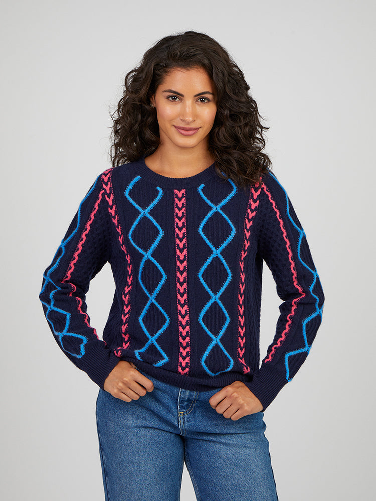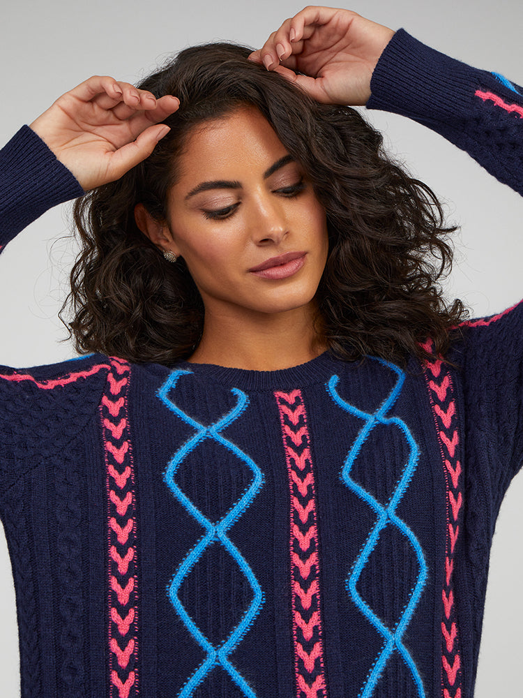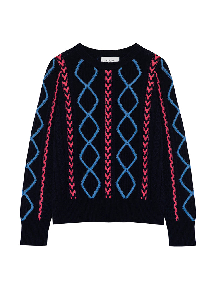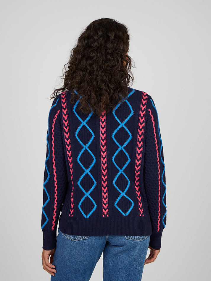 A cosy classic with a twist, the soft wool-cashmere Ensley jumper features chunky cable knit and a pop of contrast colour woven into the design. With a relaxed, boxy fit, drop shoulders and a crew neckline, it’s an easy-to-wear piece that adds warmth and texture to everyday dressing.