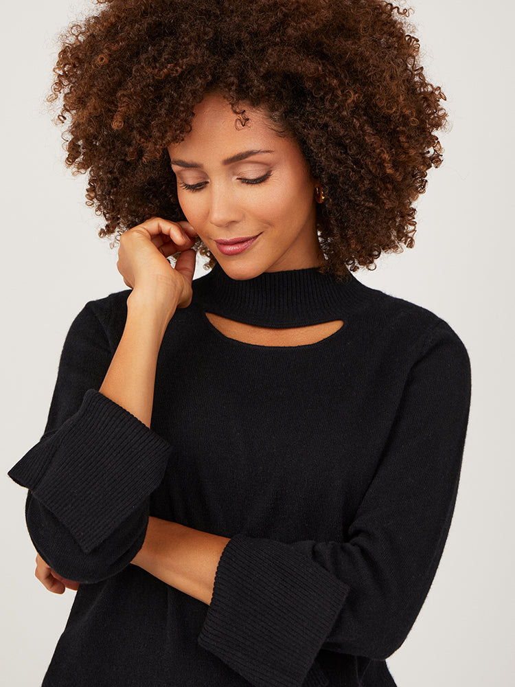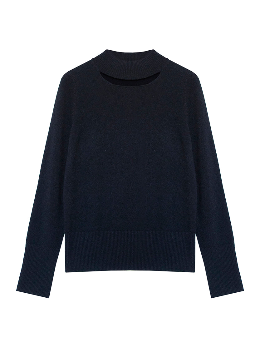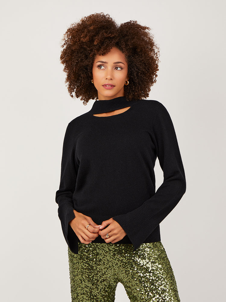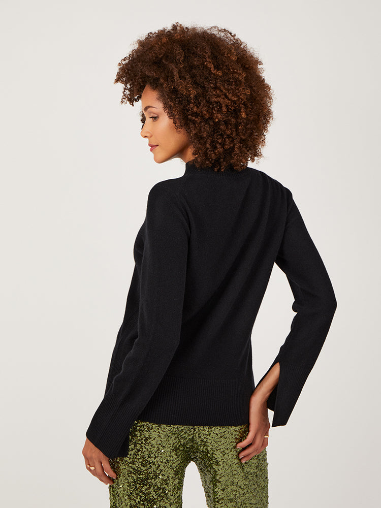 A neater fitting style knitted in our 100% cashmere yarn, this super soft jumper has a flattering high neck, cut out detail and slits on the cuff. Pair with sequin or leather trousers for a night out.