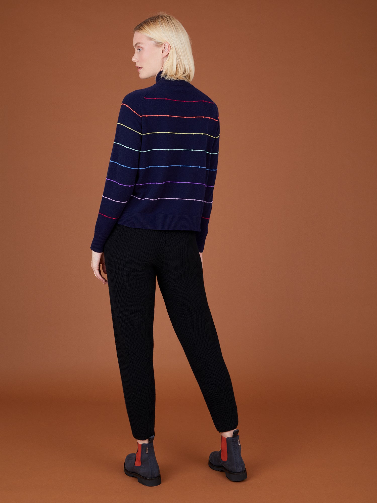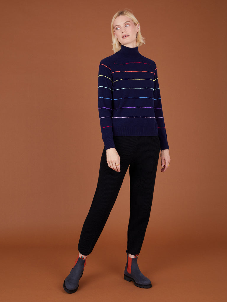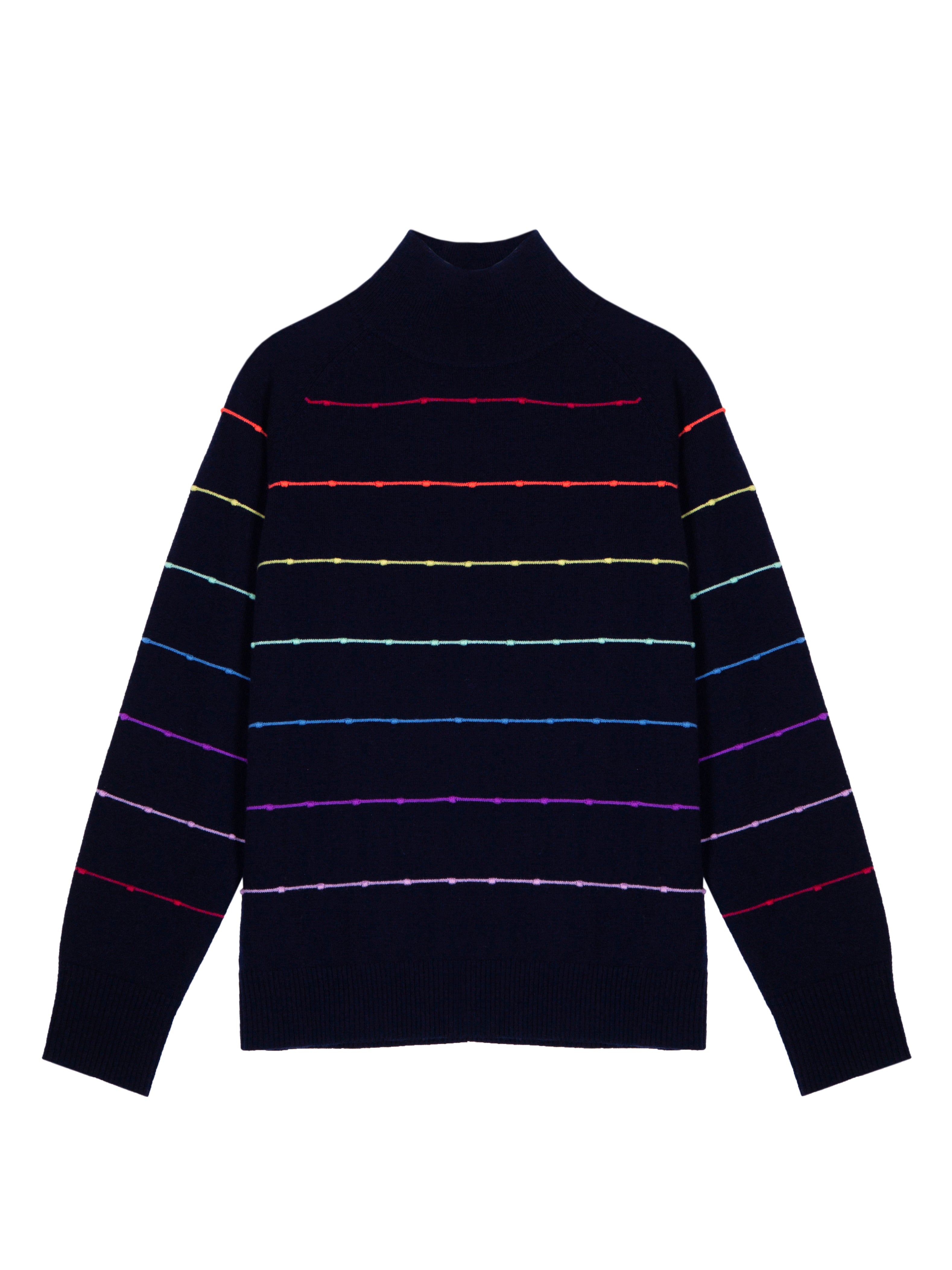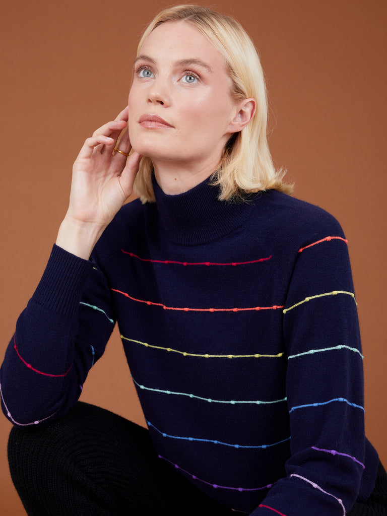 The Eloise Jumper features unique knitted-in bobble stripes across the body and sleeves. The raglan sleeves, and mock neck make the silhouette a really flattering shape.