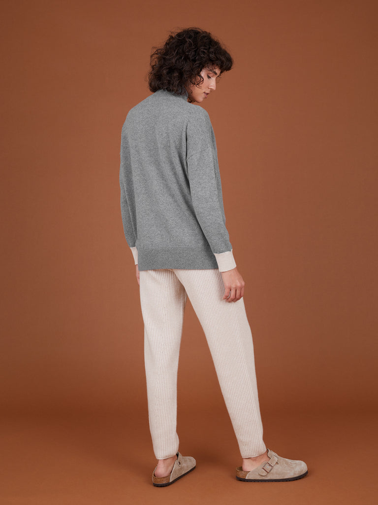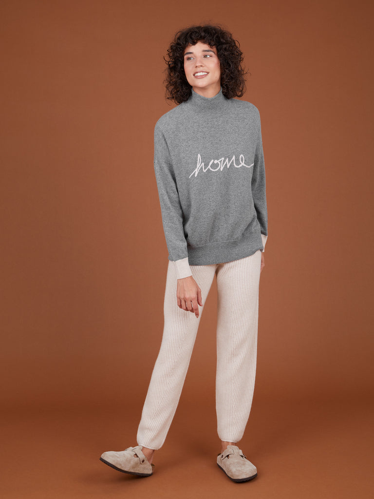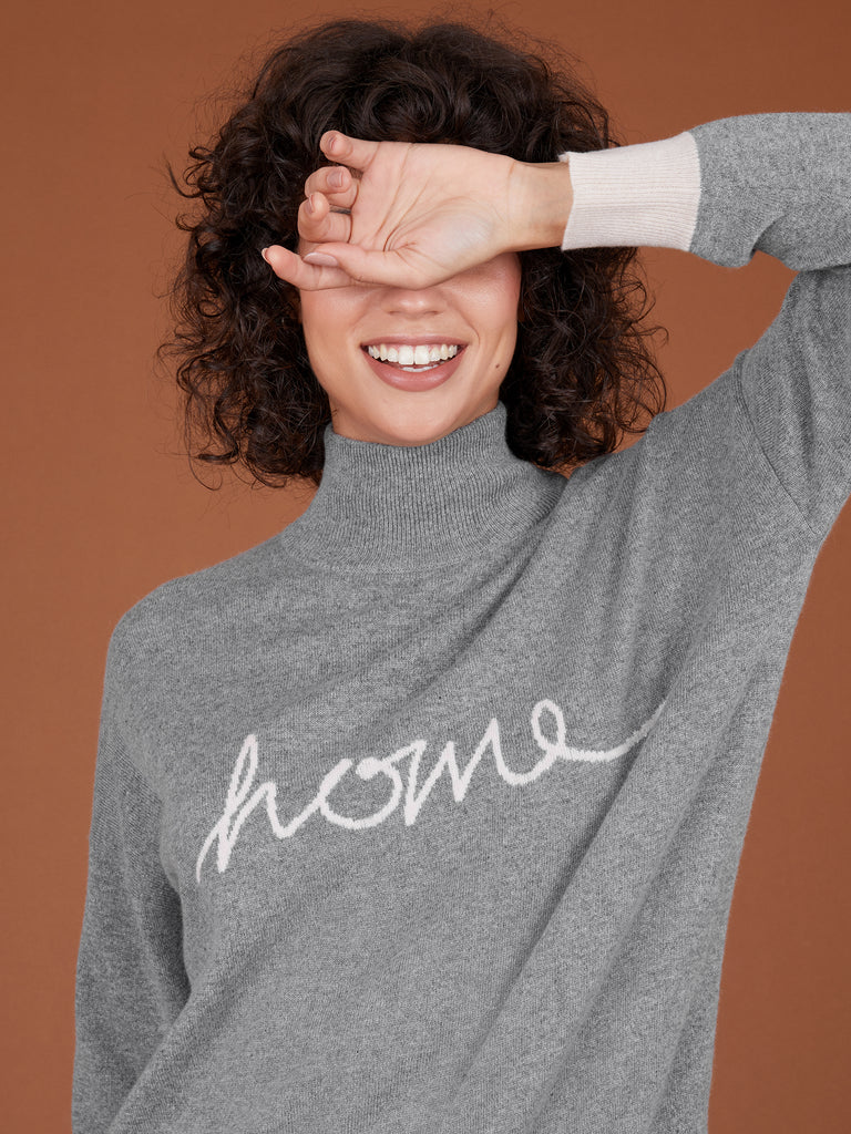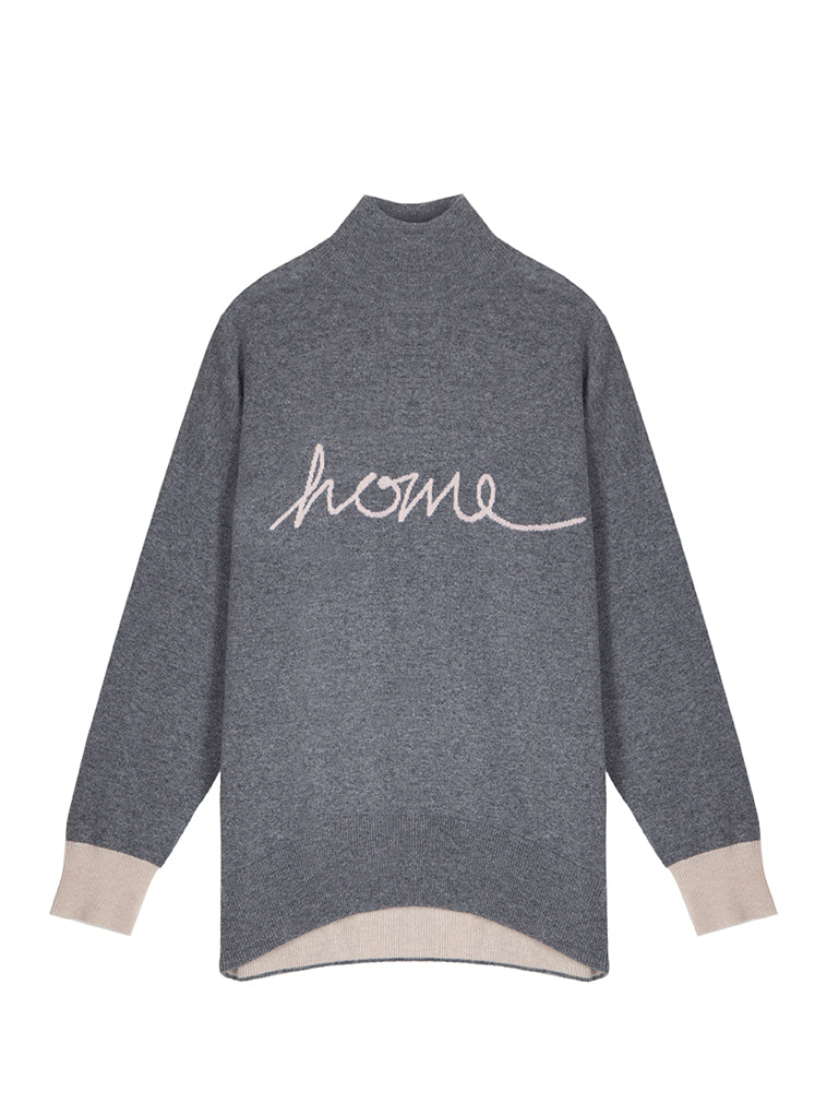 The Home Jumper is a relaxed style with dropped sleeves in our standard lightweight cashmere. The jumper has a high mock high neck and ‘Home’ written across the centre front in our Gossamer Pink yarn. The longer back is one of our most popular jumper styles, achieving a really flattering shape. The double thickness of the ribs at the neck and hem creates a truly luxury feel.
