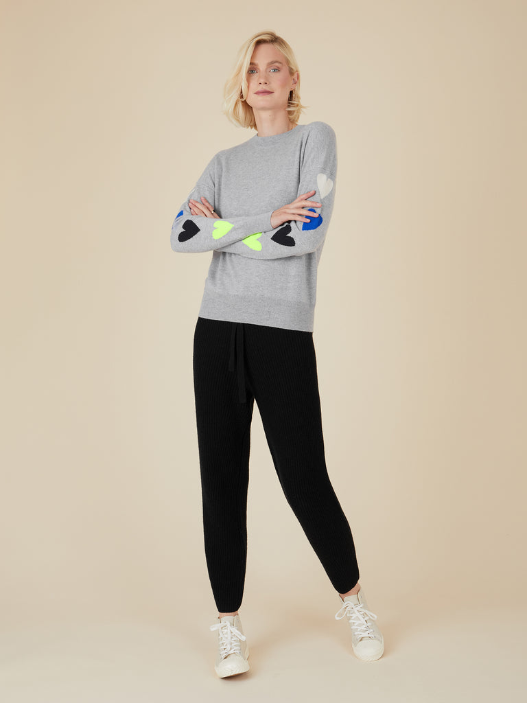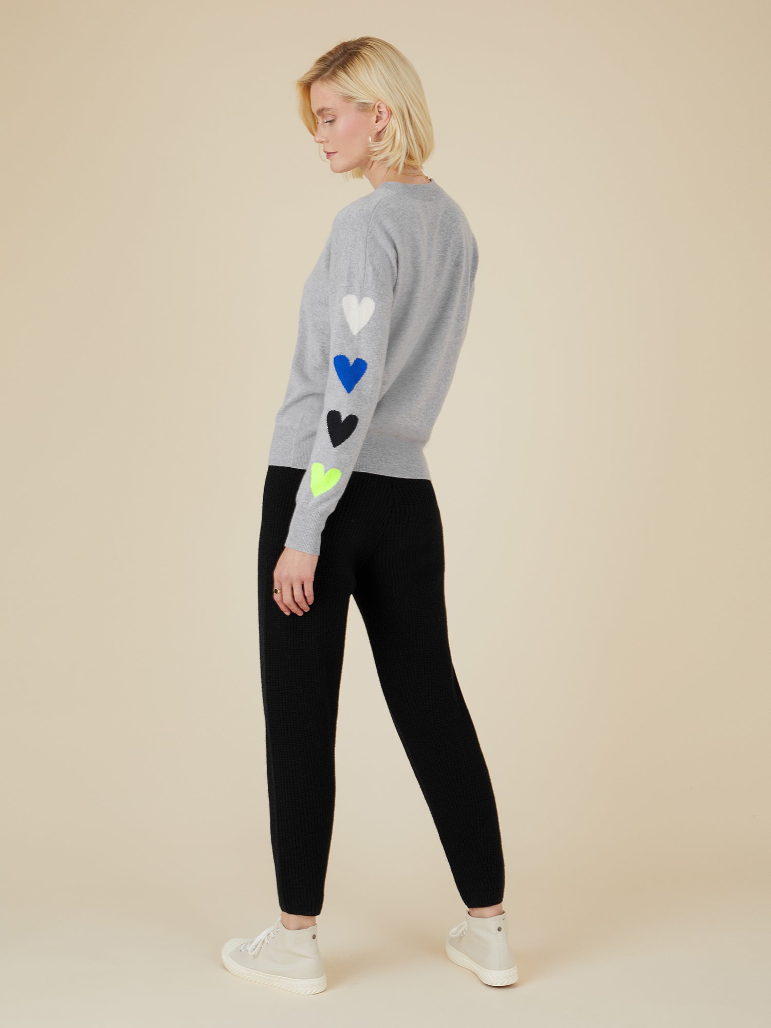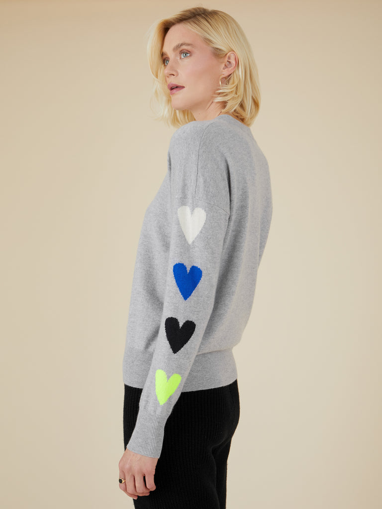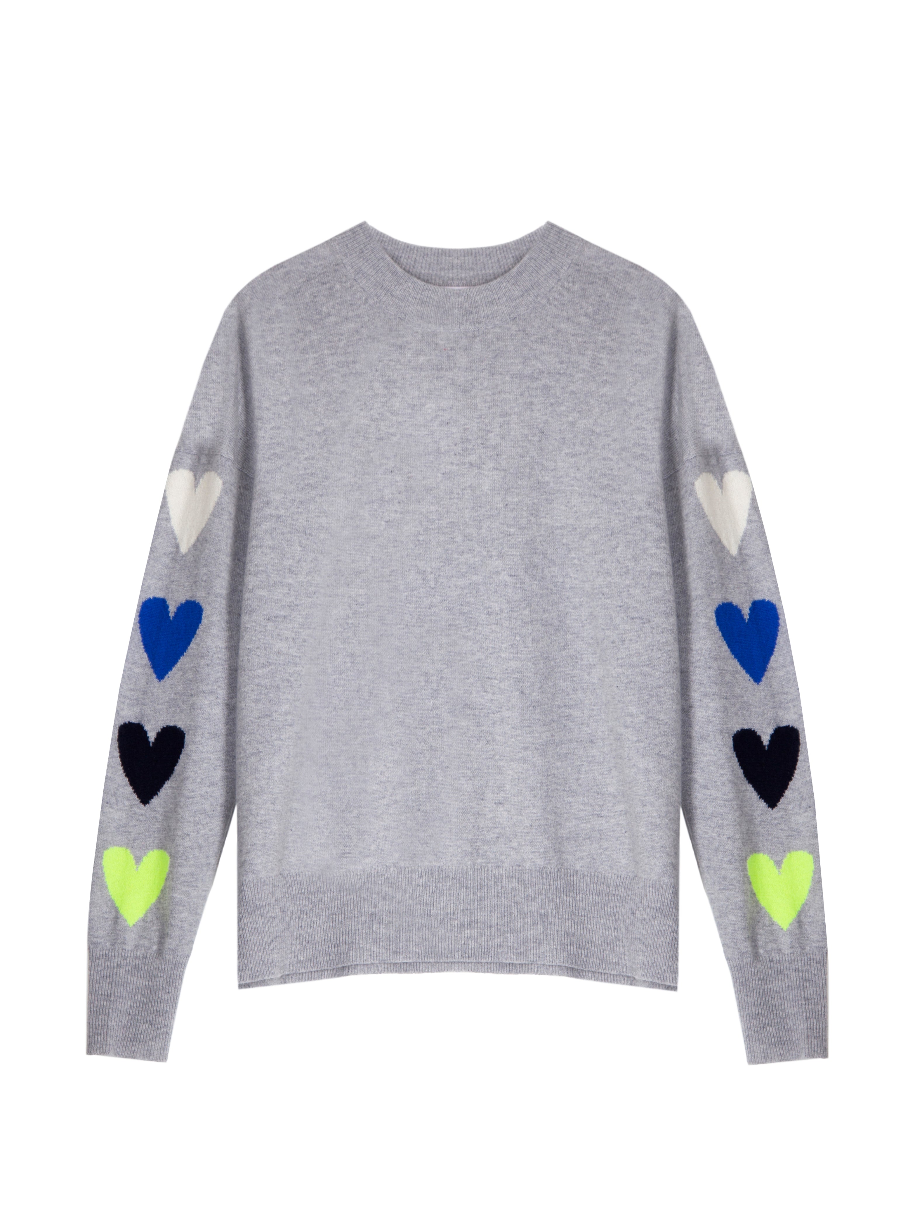 The contrast contrasting coloured intarsia hearts along the top of the sleeves give the jumper a fun and classically Cocoa twist.