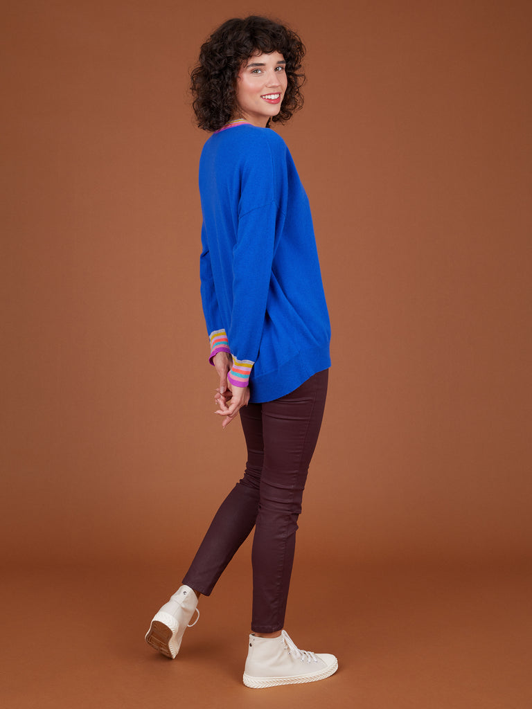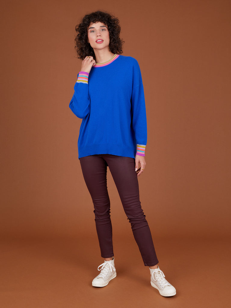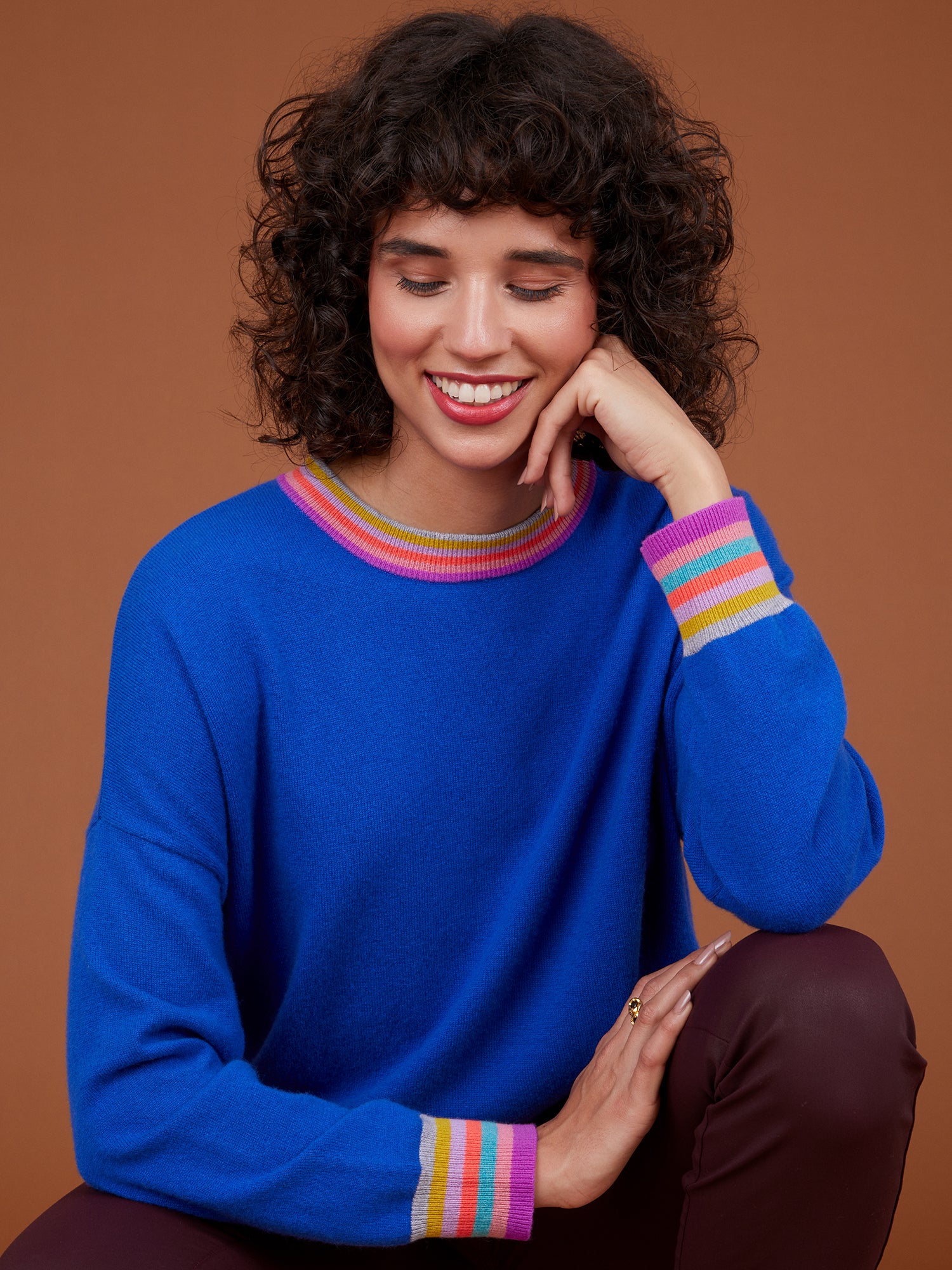 The Samara Jumper is knitted in our standard cashmere, a plain knit with a dropped sleeve creating a more relaxed fit. This jumper is a longer line style, with stripes at the rib cuffs and crew neck.