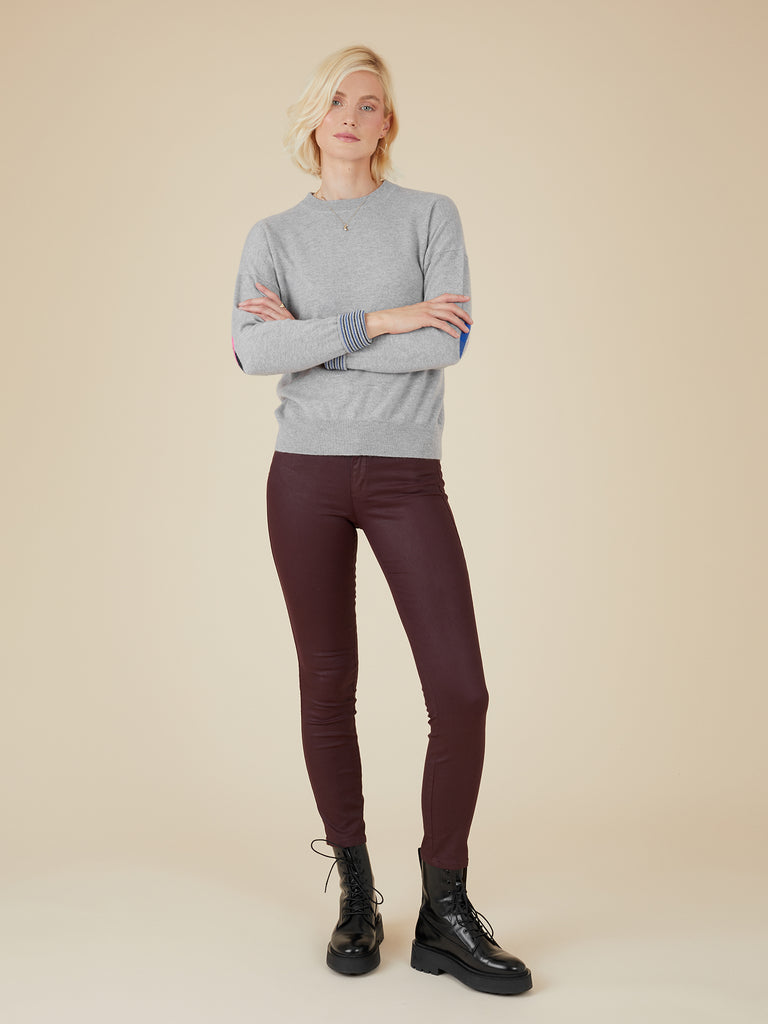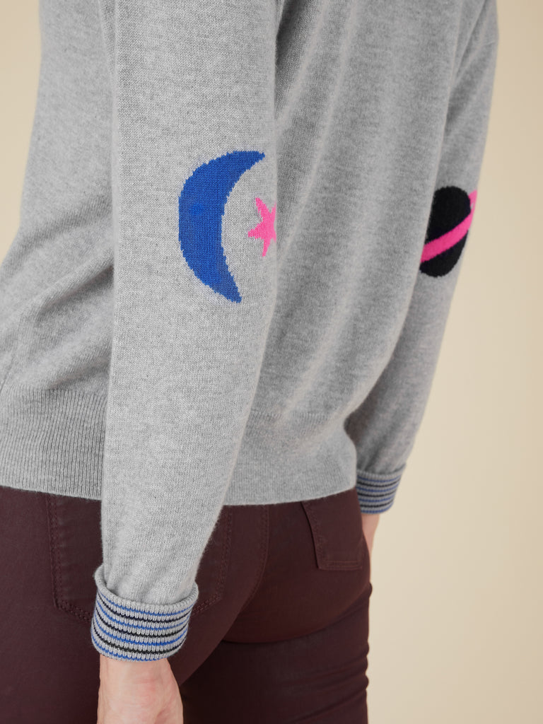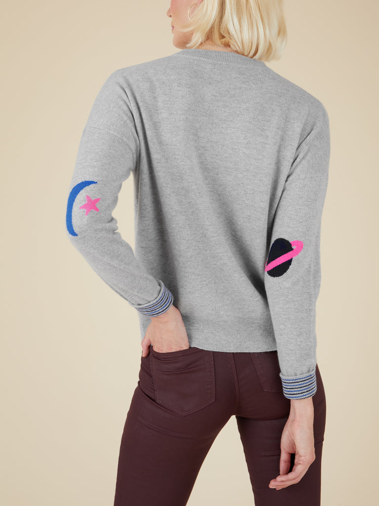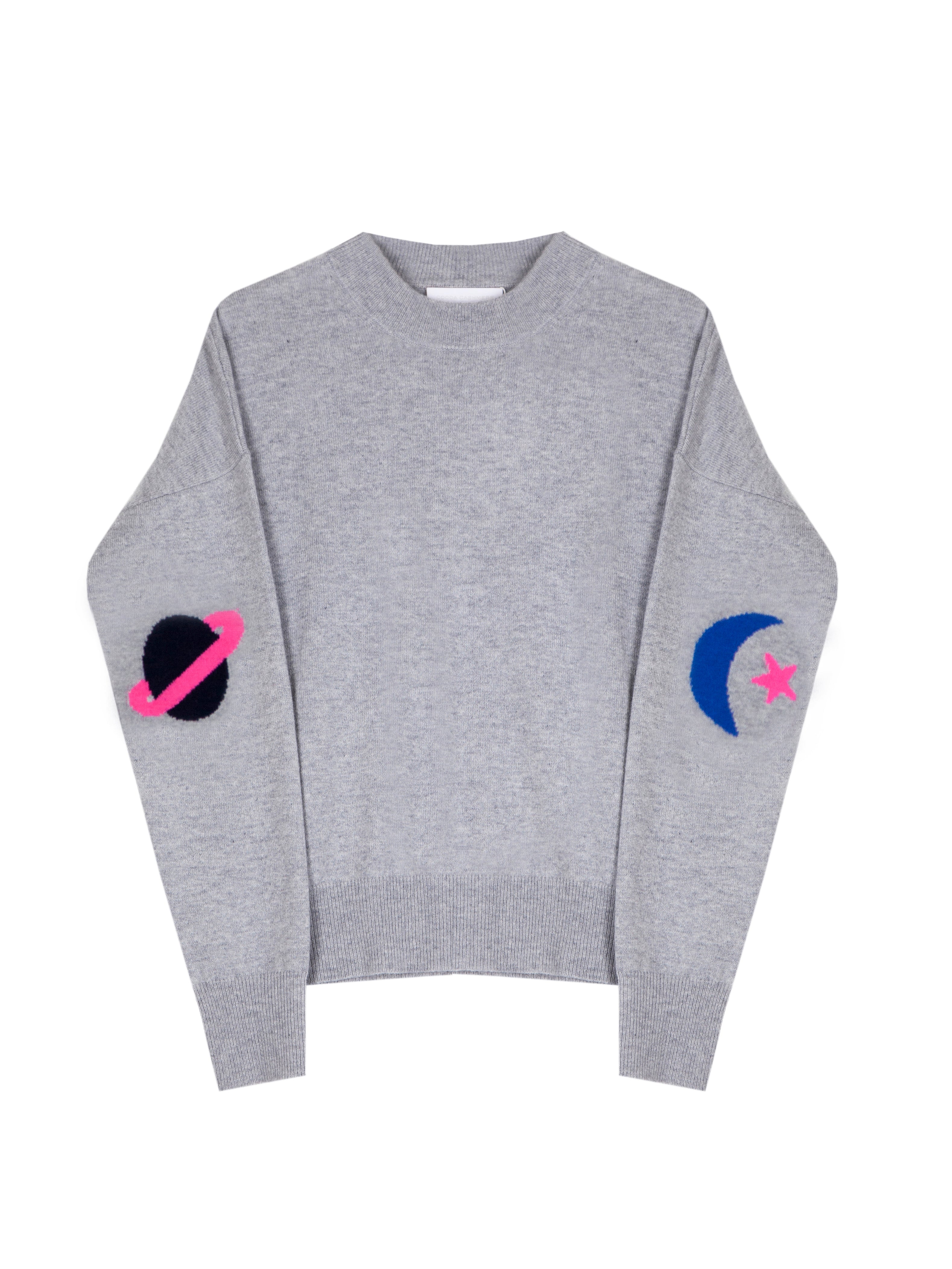 The Sissy Jumper in 100% Cashmere is a more relaxed silhouette featuring a moon/star and a planet on the elbows for something unique.