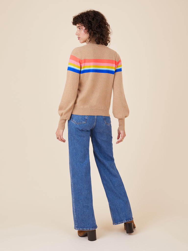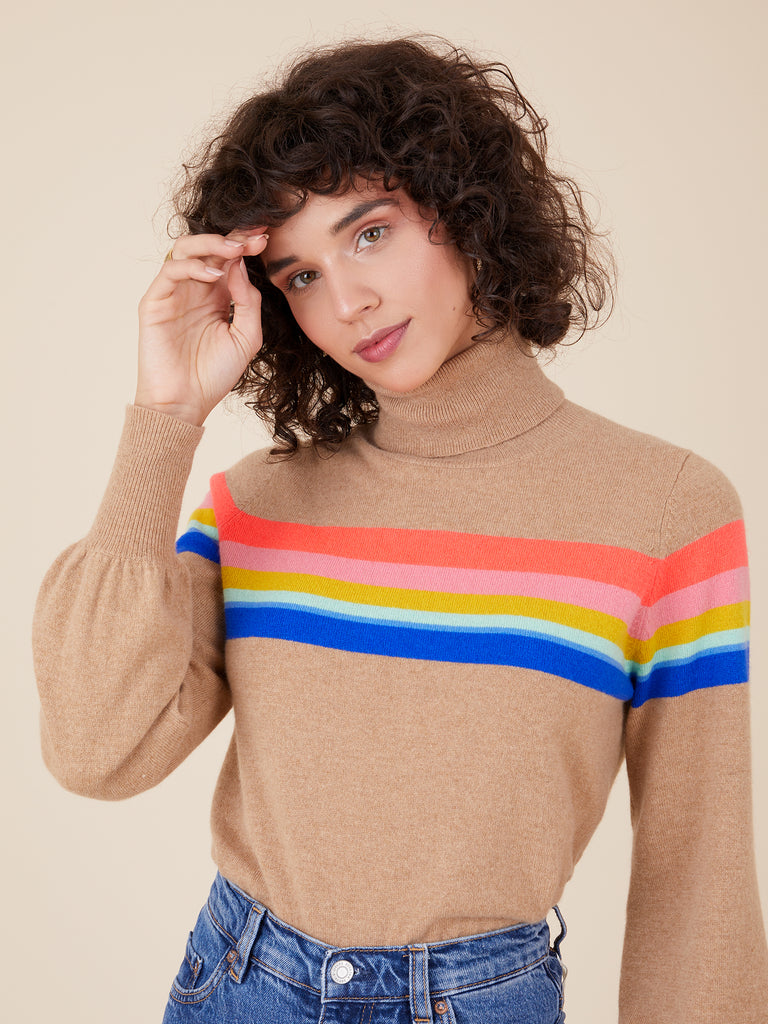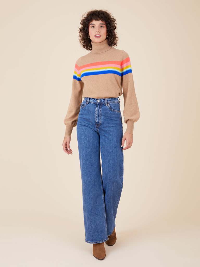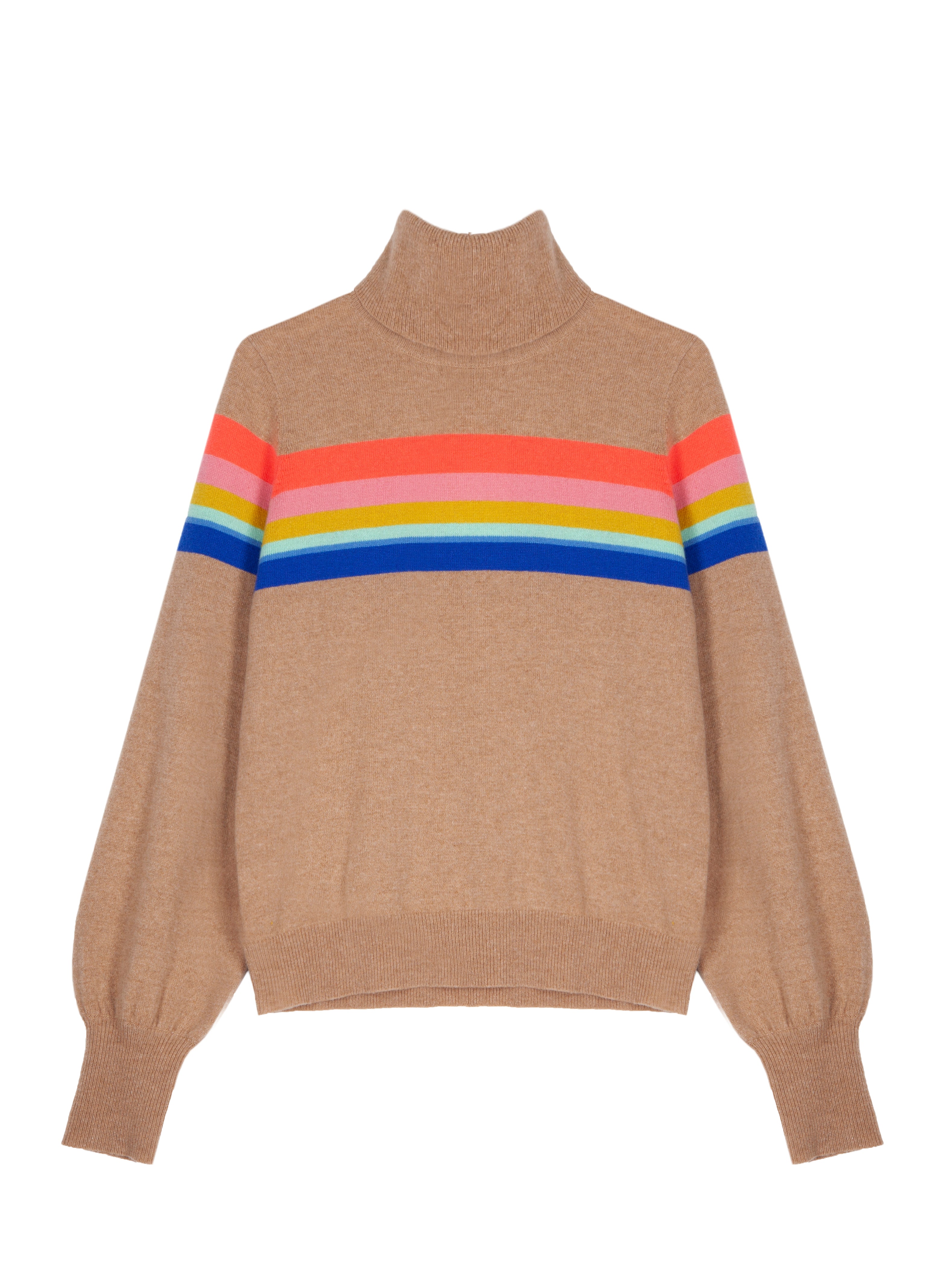 The Soraya Jumper is knitted in our lightweight cashmere yarn. A set-in sleeve design, with a roll neck and slight gathers into the rib cuffs. The stripes across the chest add the perfect pop of colour, whist the Camel base is the perfect neutral to go with anything and everything in your wardrobe.