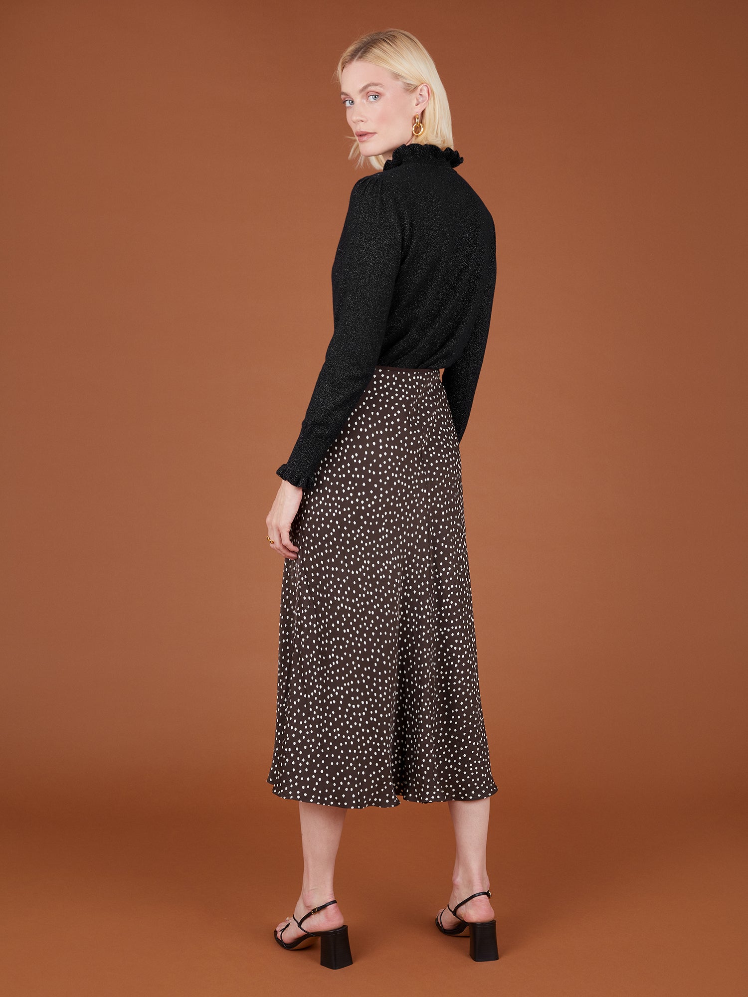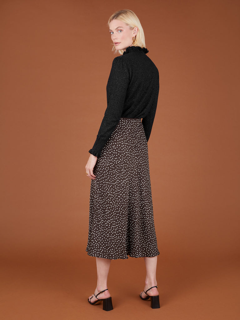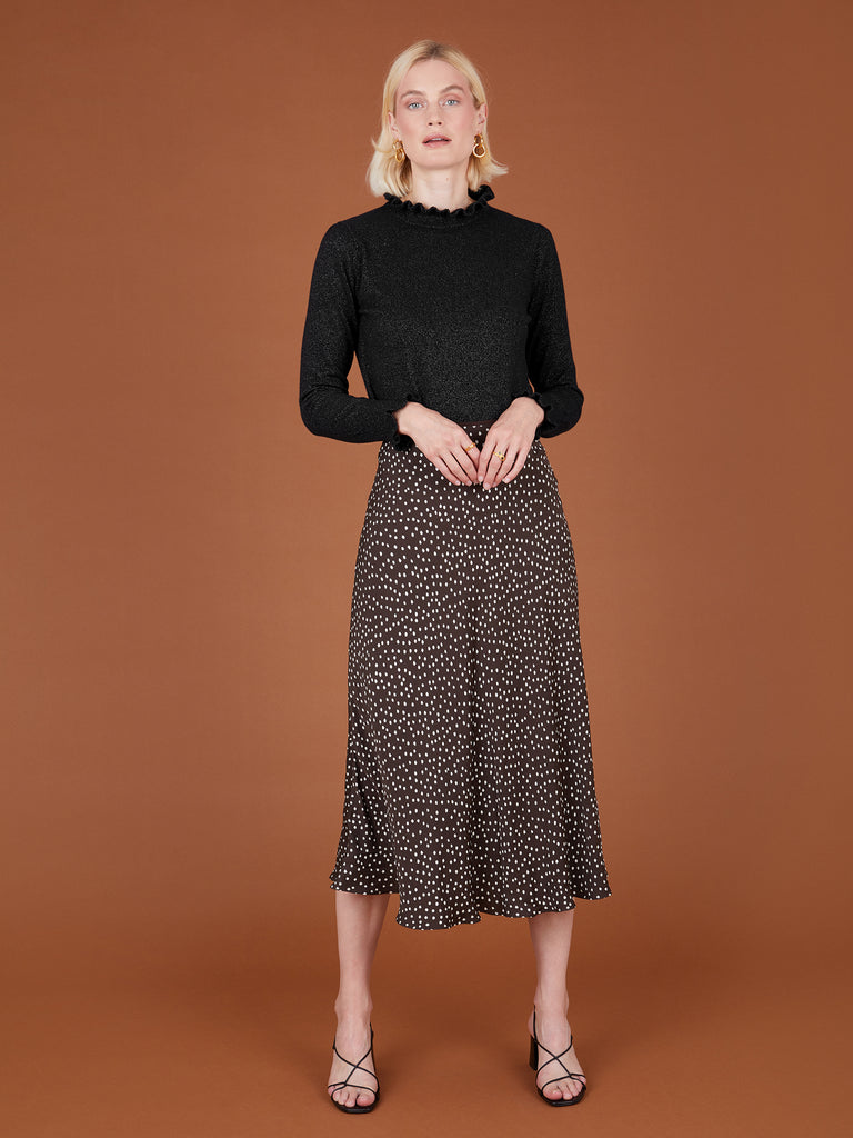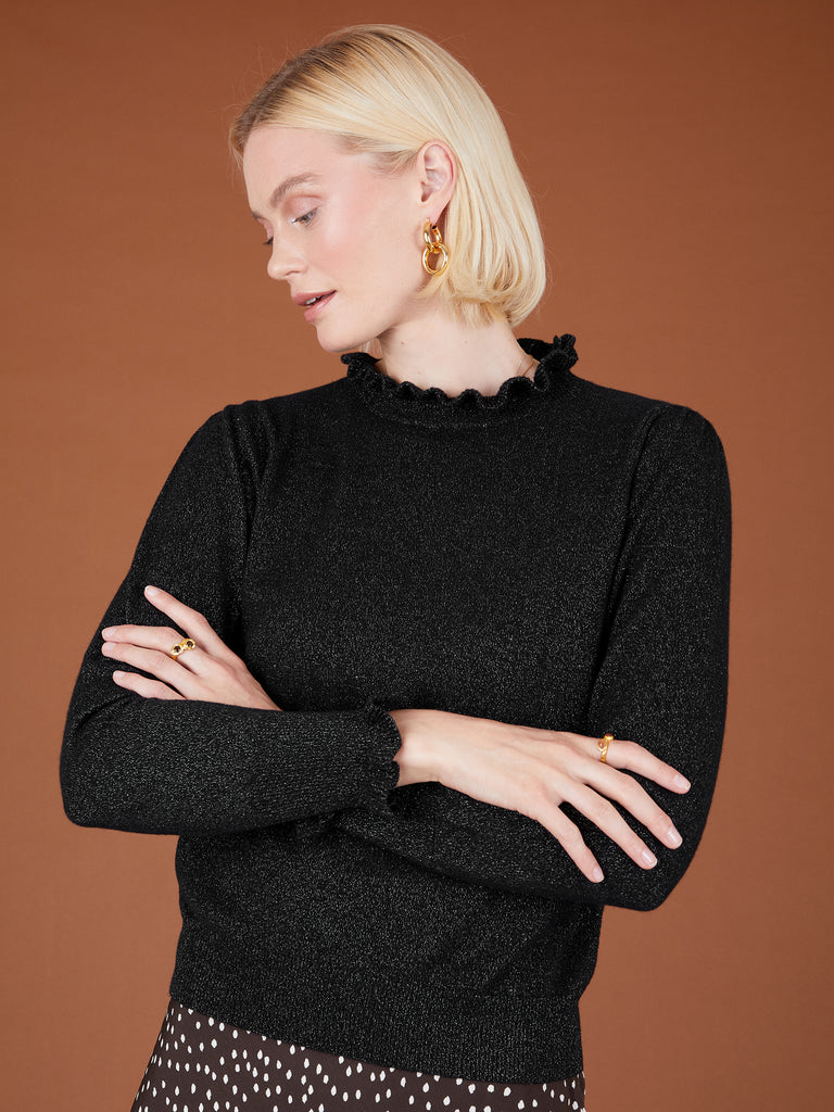 The Carrie is a beautiful black jumper featuring a feminine frill detail at the neck and cuffs. The black cashmere is teamed with silver lurex, a great way to add some sparkle to your outfit.