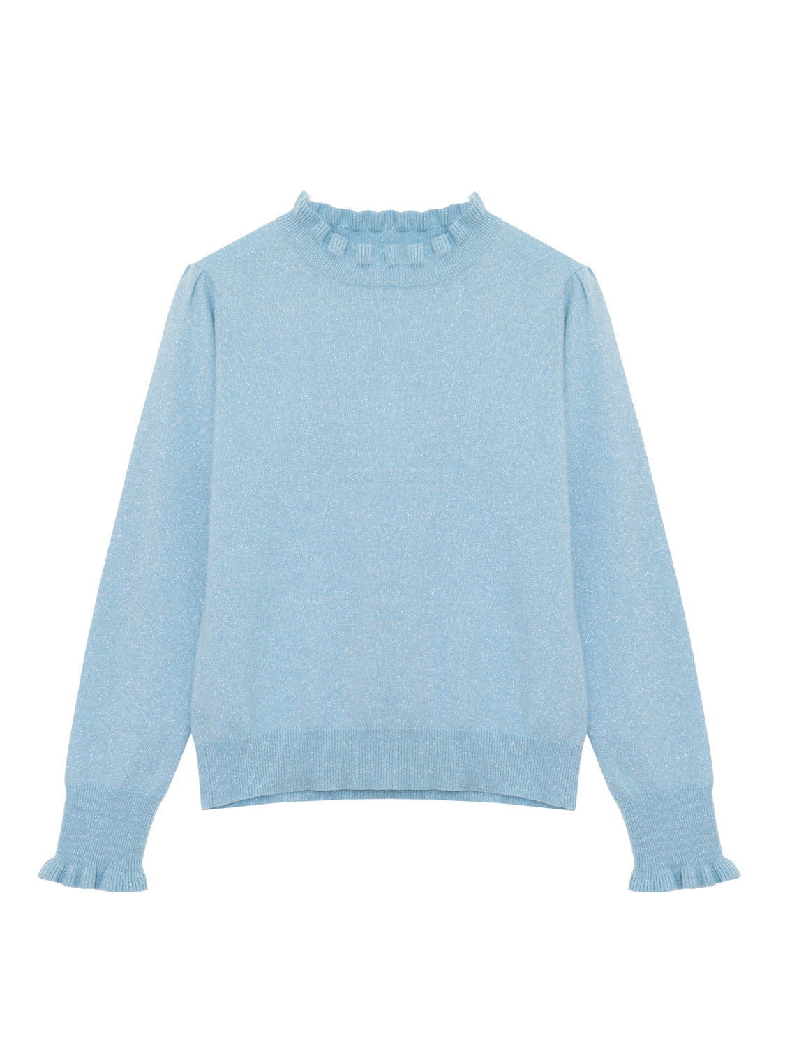 Elevate your winter wardrobe with our Carrie sparkly knit. A neater fitting jumper with frills at the collar and cuffs, and a subtle sparkle all over. Pair with jeans or dress up with a pleated maxi skirt and heels.