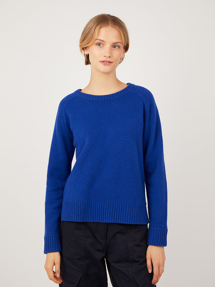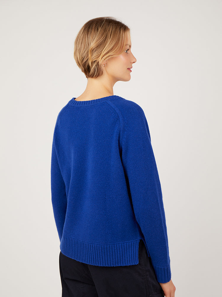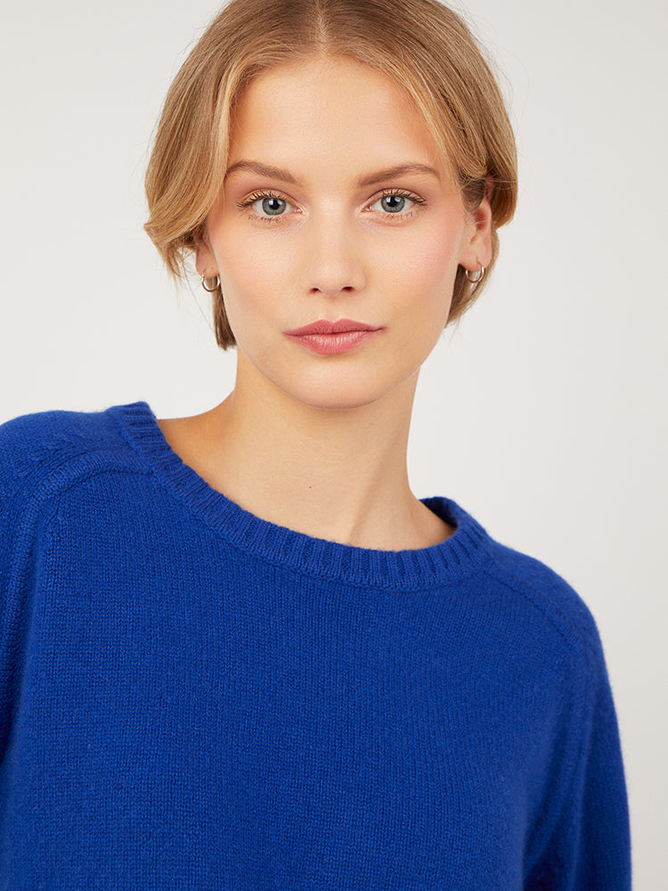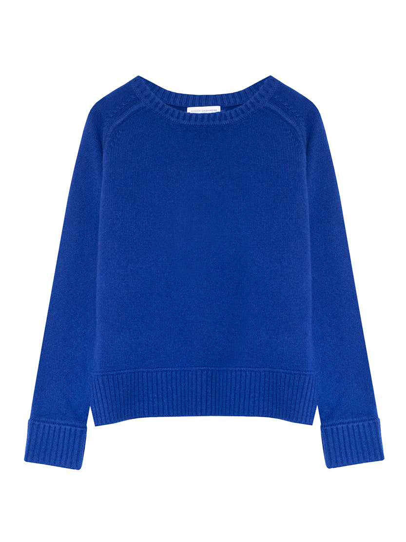 Standout in the bold Chiara knit in Blue Star. Made of 100% cashmere, this heavier weight knit is the epitome of luxury. A relaxed fit, crew neck with tubular details make this the perfect statement jumper. Also available in neon Cerise colourway.