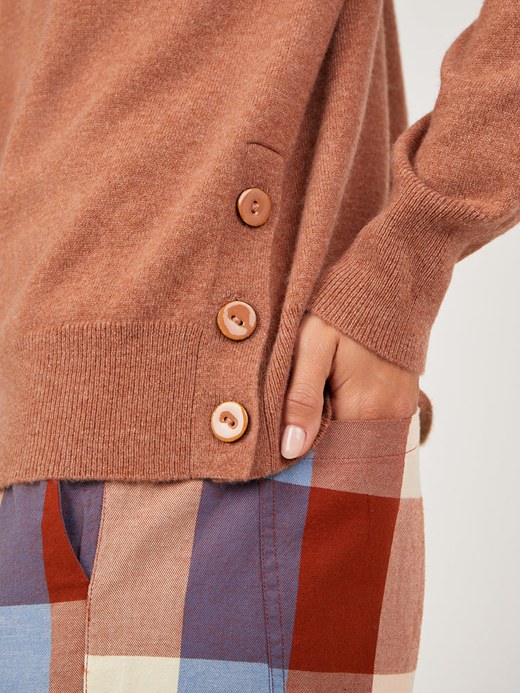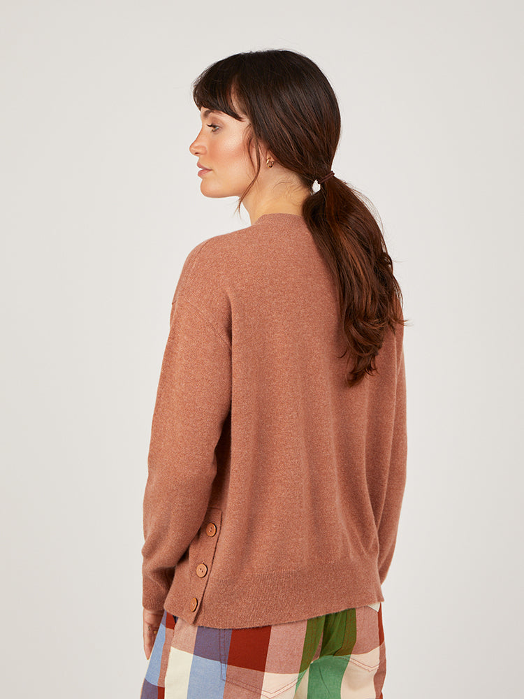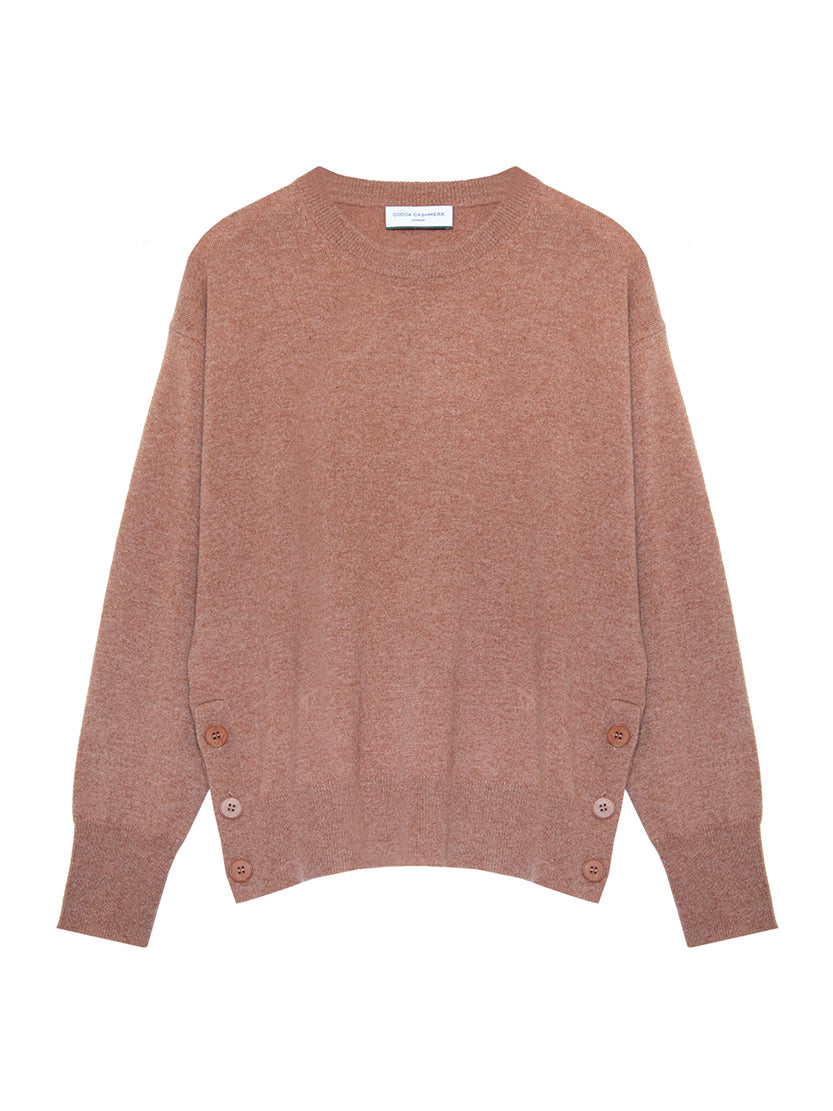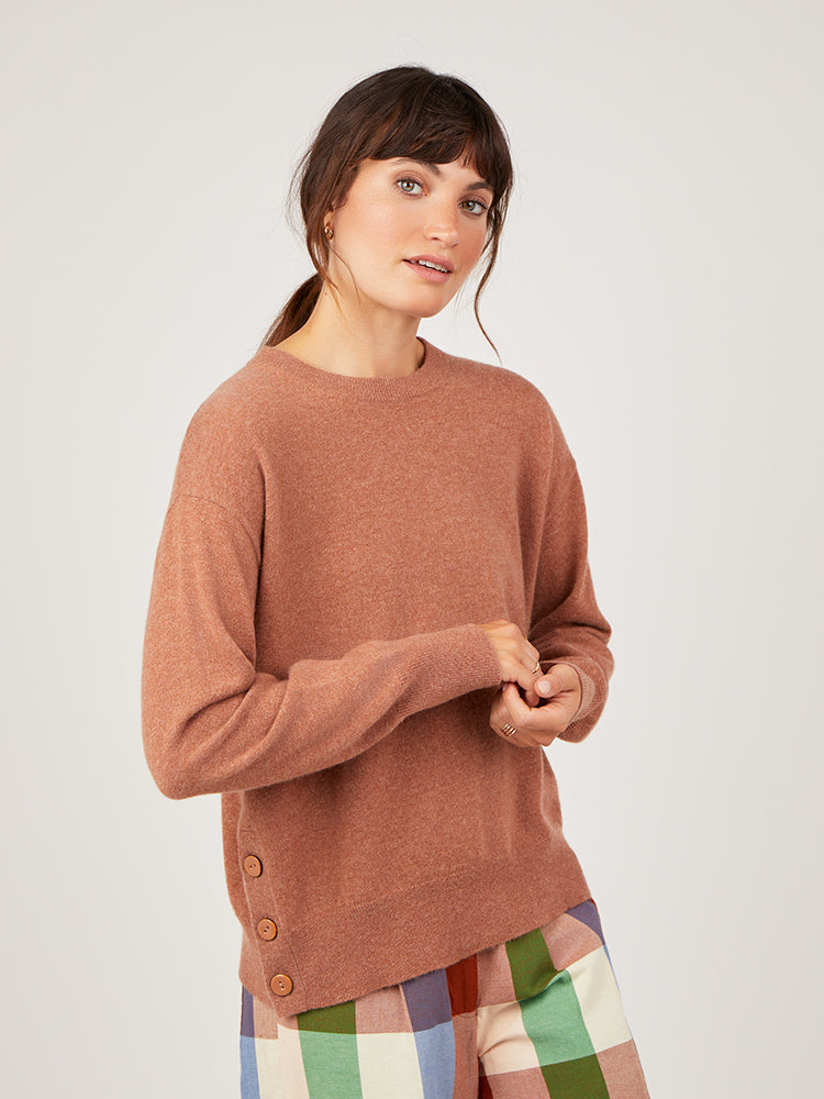 Made from 100% cashmere yarn, Claire is a versatile wide neck crew, with set-in sleeves and button up side slits to create a flattering shape, perfect for pairing with block colour bottoms or jeans.