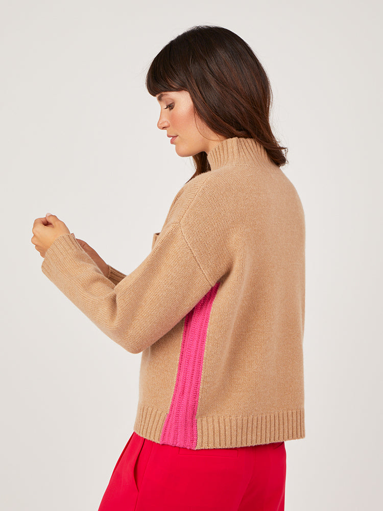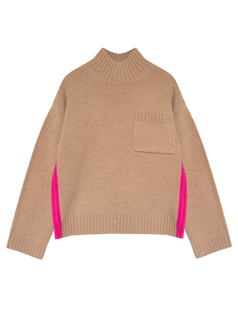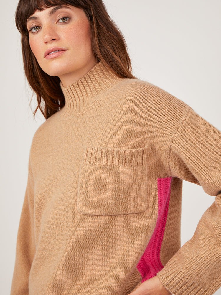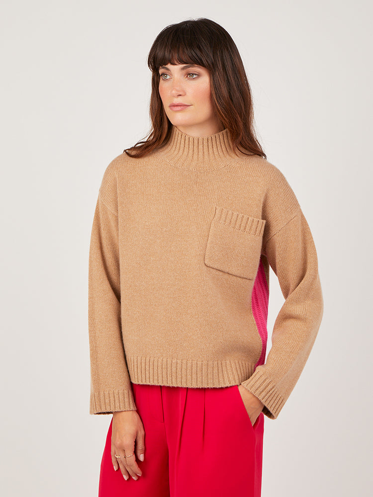 Made from a soft merino wool and cashmere blend yarn, this heavier weight jumper features a high mock neck, front pocket and contrasting rib details at the seam. The boxy relaxed shape and high neck create a flattering shape, perfect for pairing with block colour bottoms or jeans.