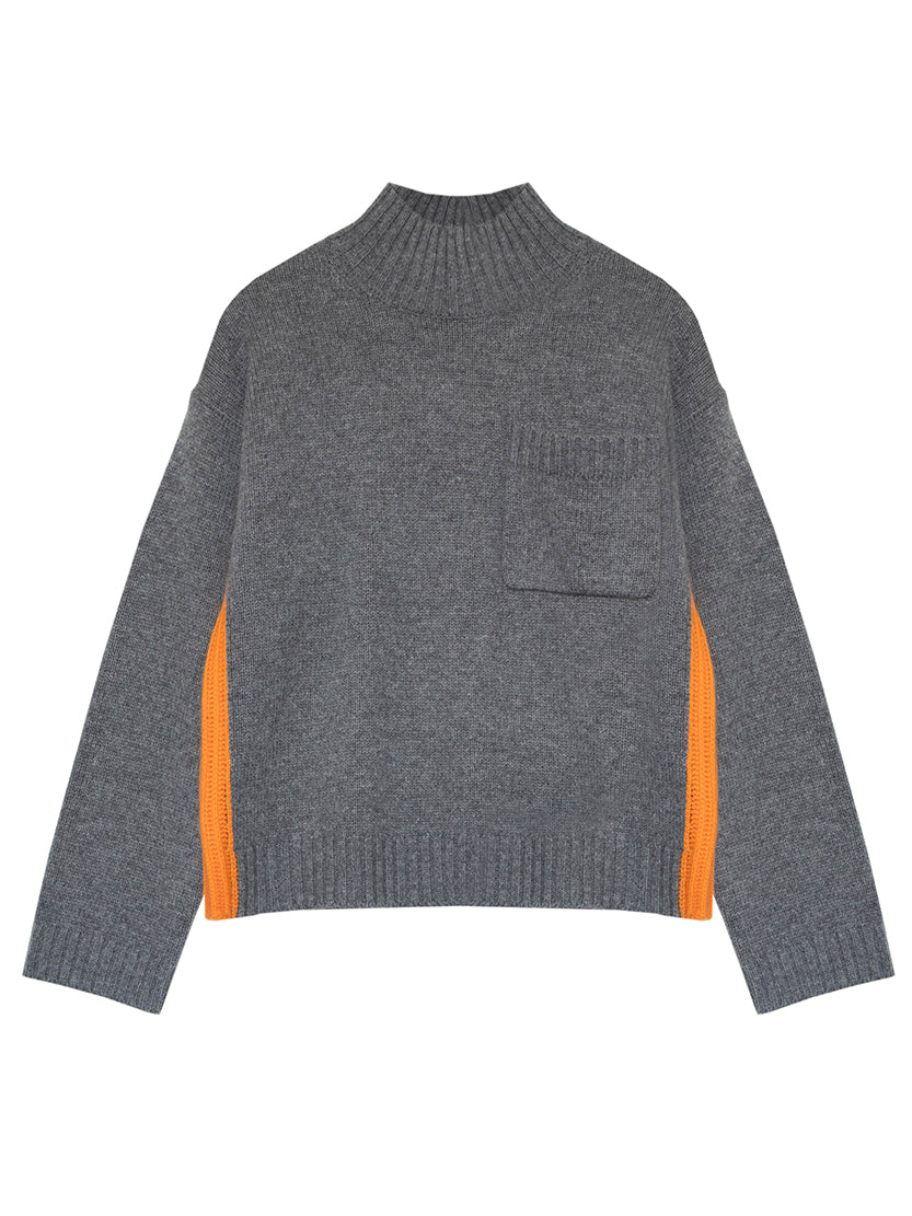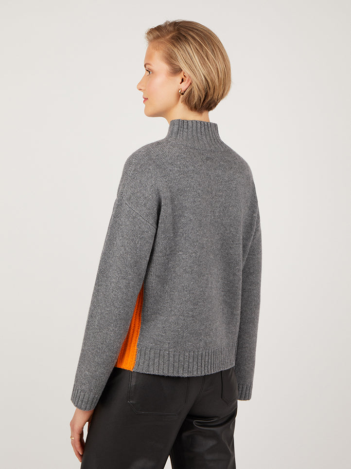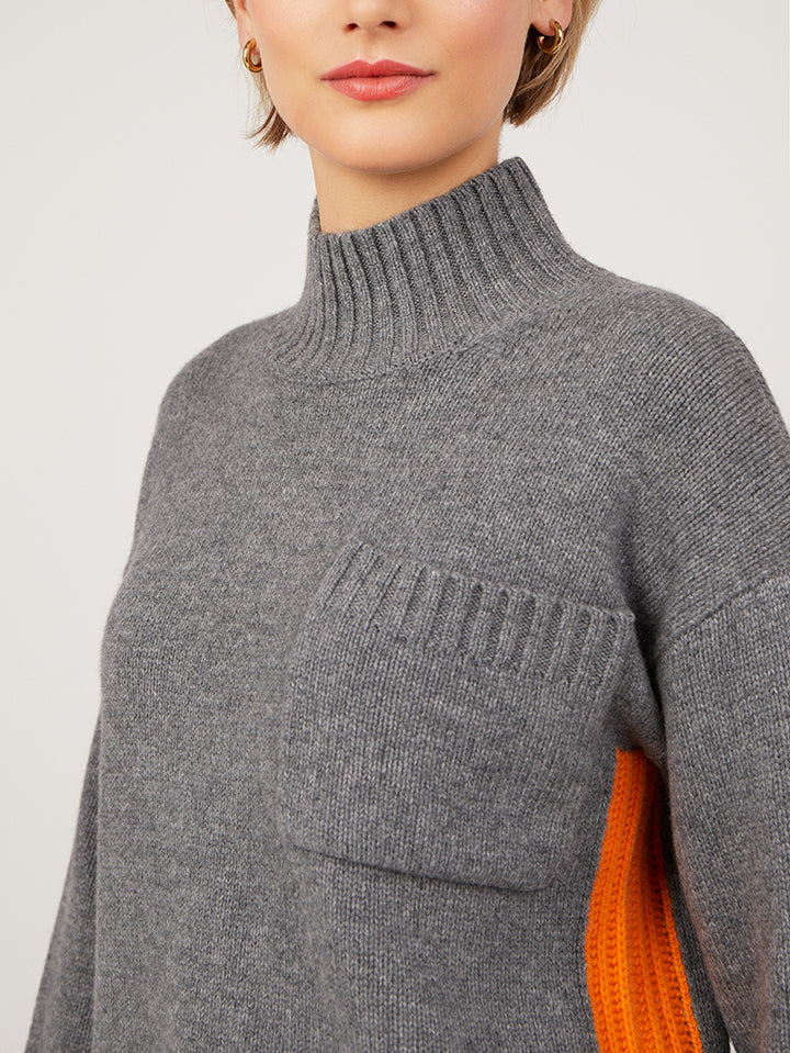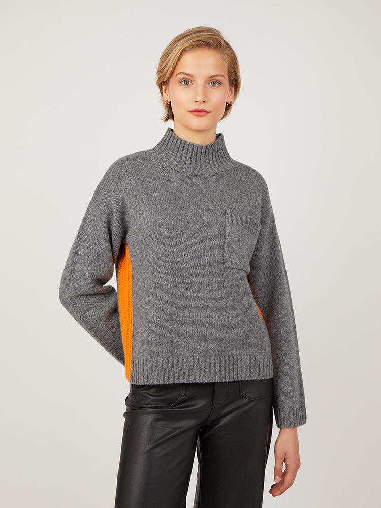 Made from a soft merino wool and cashmere blend yarn, this heavier weight jumper features a high mock neck, front pocket and contrasting rib details at the seam. The boxy relaxed shape and high neck create a flattering shape, perfect for pairing with block colour bottoms or jeans. Also available in Fudge and Noir.