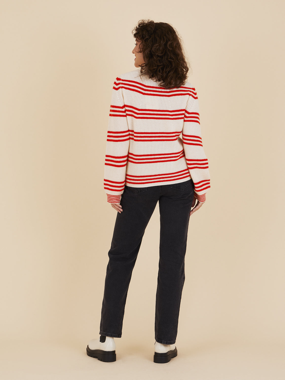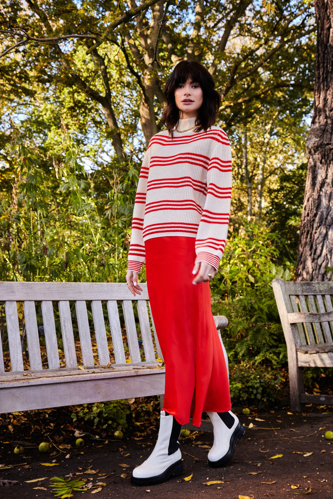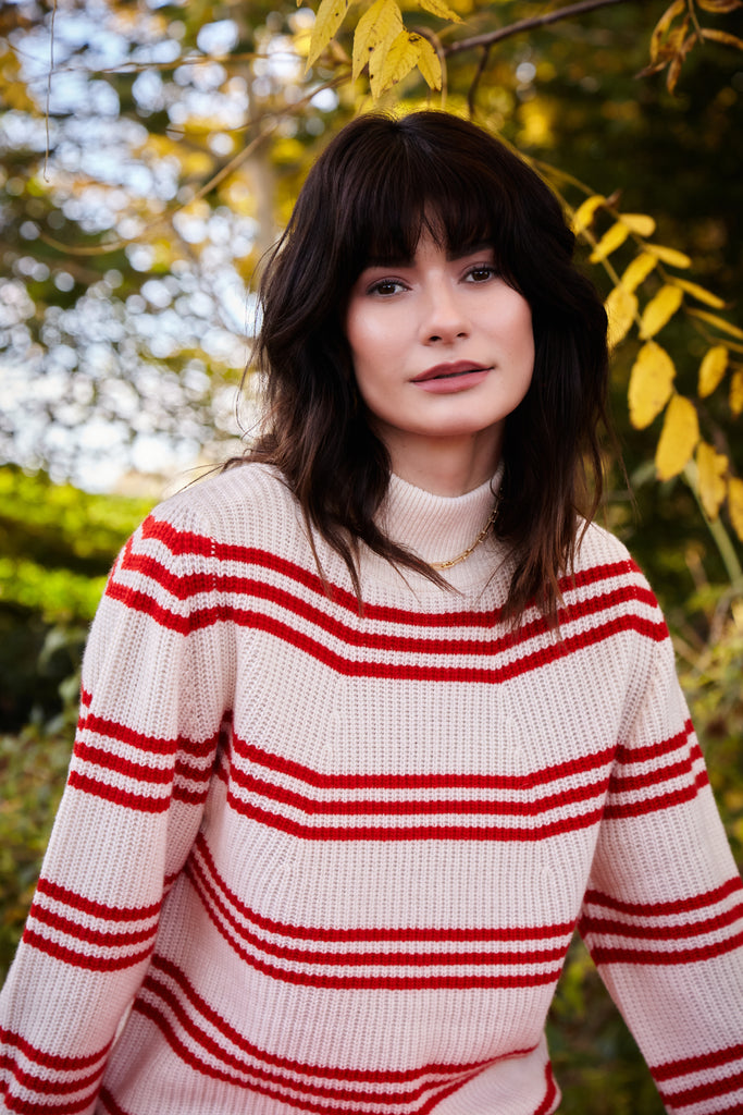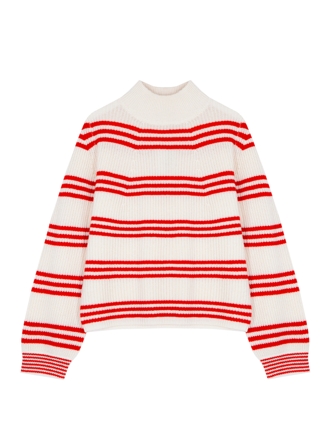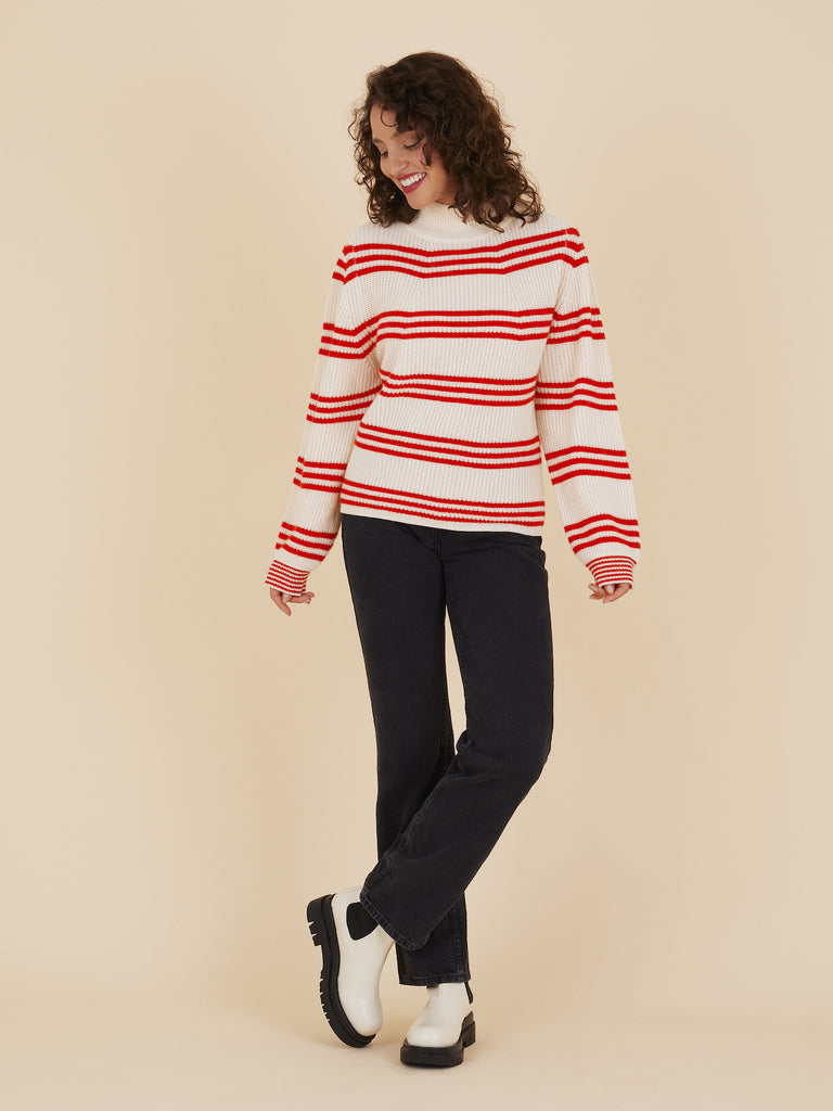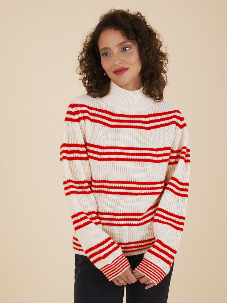 A Cocoa favourite – Koko is a unique take on a classic stripe jumper, elevated with a rib stitch, high neck, and smaller stripe detailing at the cuffs.