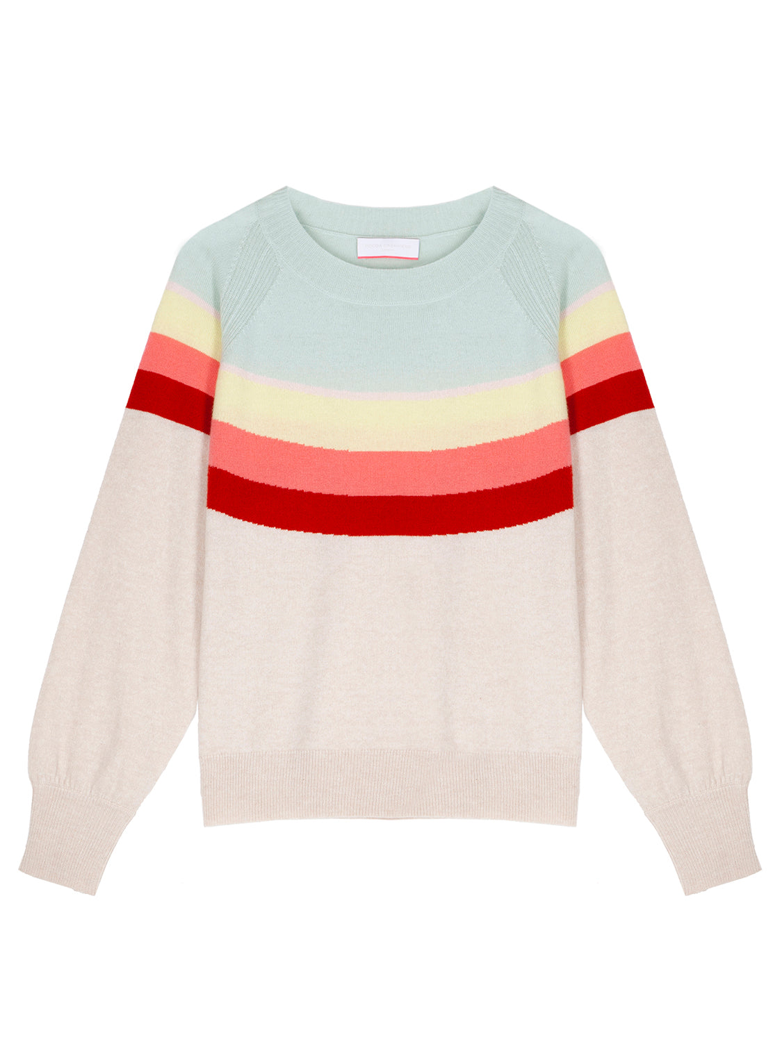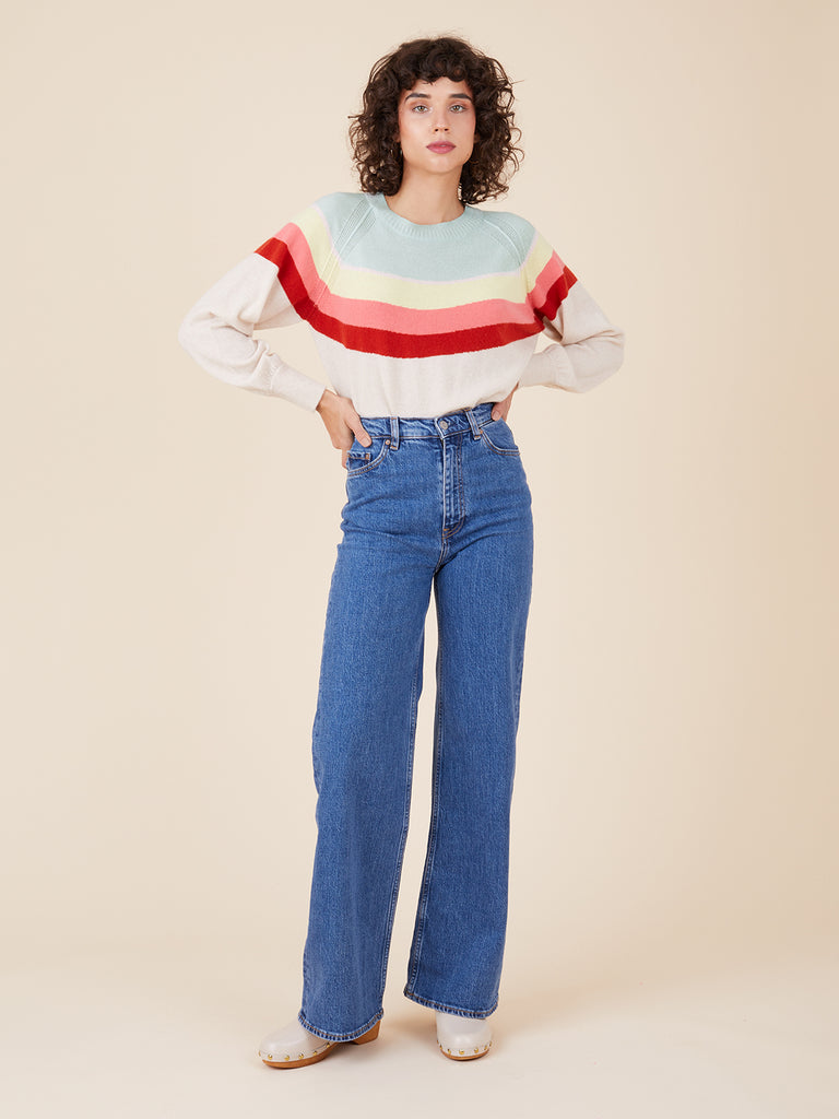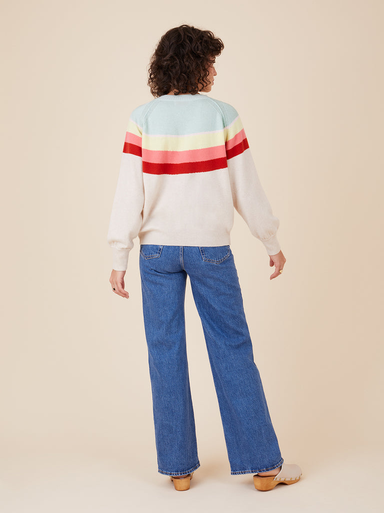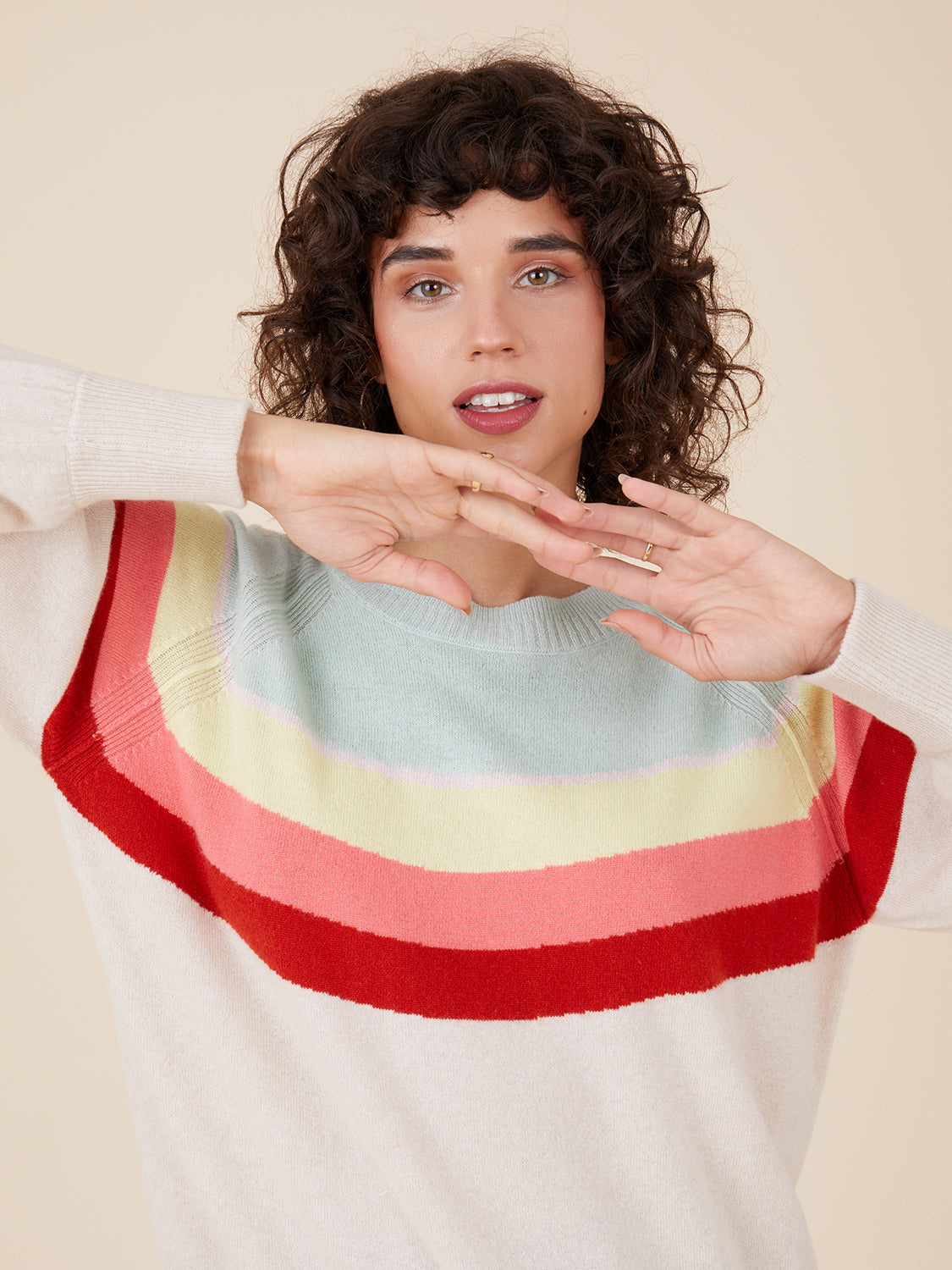 The Lila Jumper in Bone features a striking curved stripe across the body and sleeves. A relaxed shaped jumper with raglan sleeves and a rib detail crew neck.