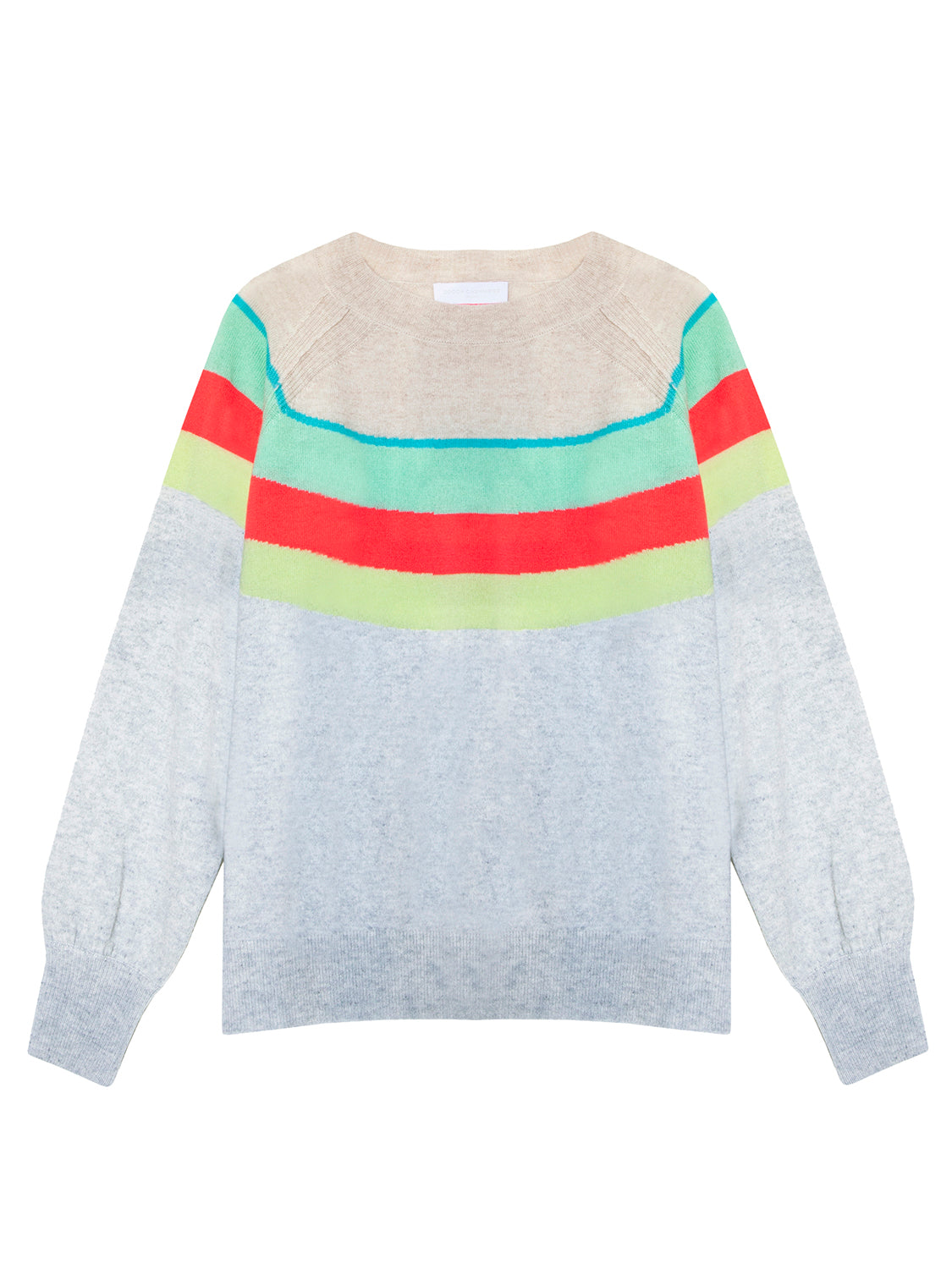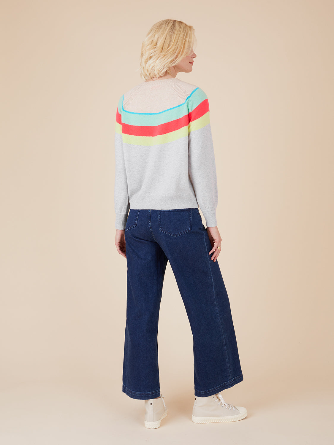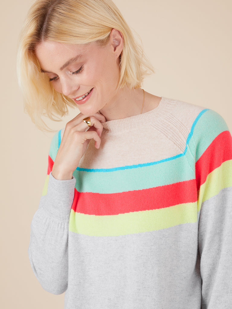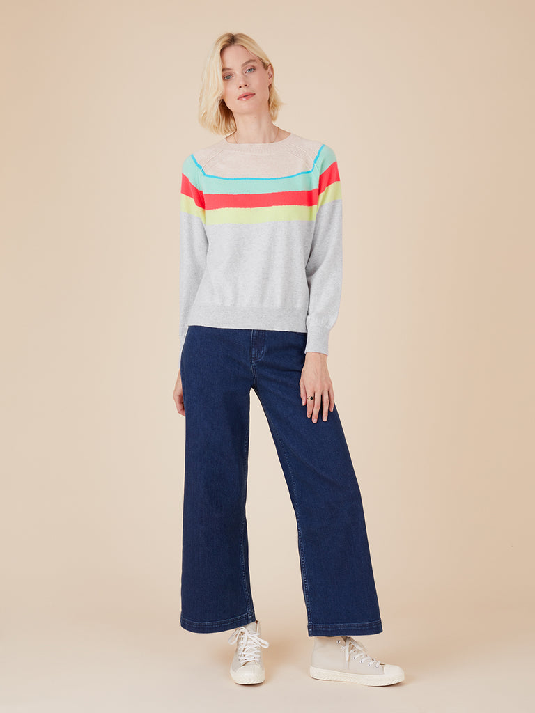 The Lila Jumper in Cloud Grey features a striking curved stripe across the body and sleeves. A relaxed shaped jumper with raglan sleeves and a rib detail crew neck.