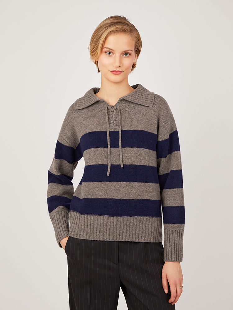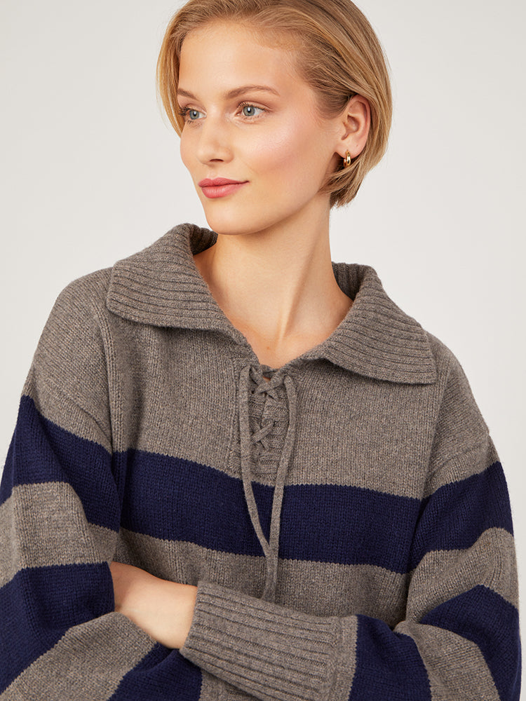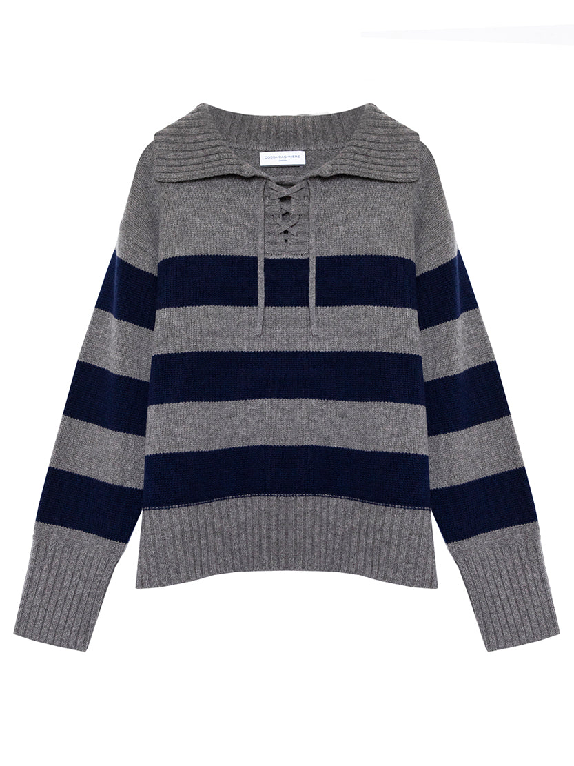 Every wardrobe needs a classic stripe piece. Lydia features a wide stripe in Mole Grey and Heritage Navy. Made from a soft merino wool and cashmere blend yarn, this heavier weight jumper features an open collar with ties. The boxy relaxed shape and open neck create a flattering shape. Also available in a Heritage Navy/Pearl stripe.