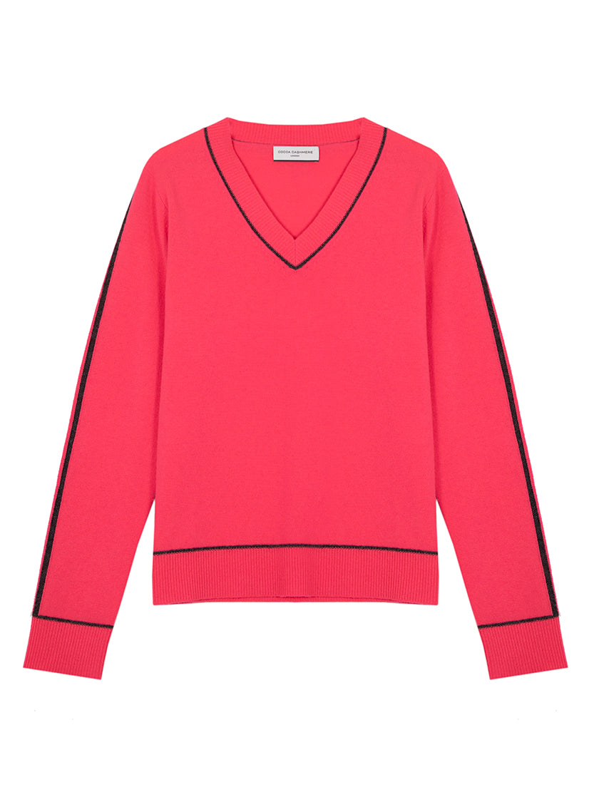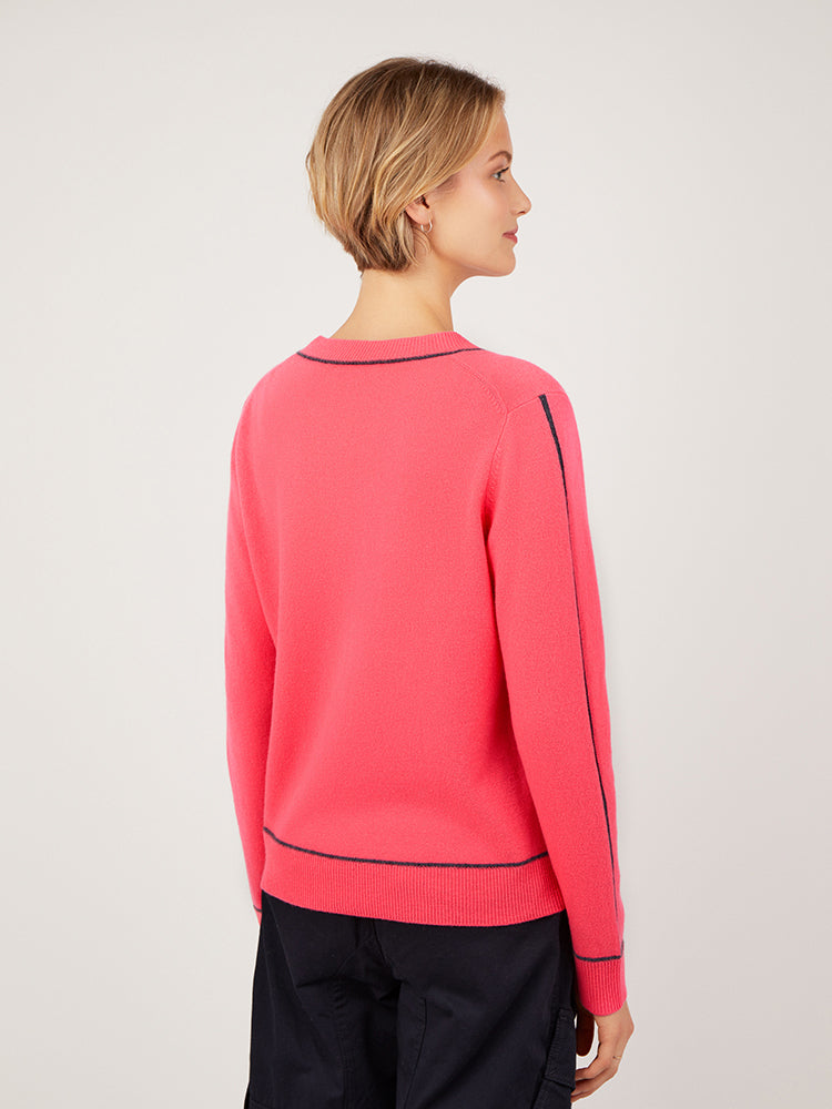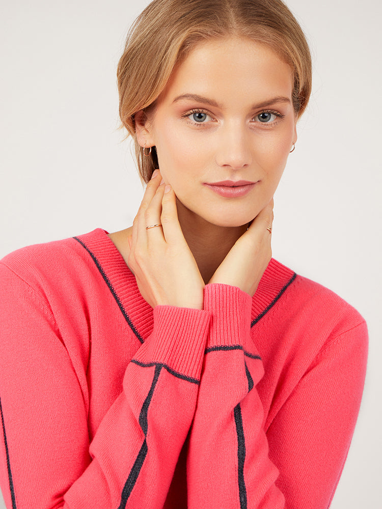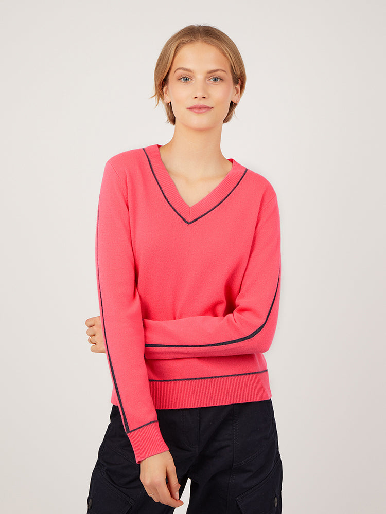 The Madison jumper in neon Bowie is a popular Cocoa shape, a neater fitting style with set-in sleeves, v neck and a contrast coloured stripe on the neckline and sleeves. Wear with jeans and classic white trainers for a casual look, or echo a colour within the stripes for a bold colour block outfit. Also available in Grape and Cosmos