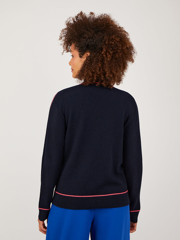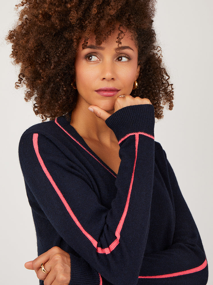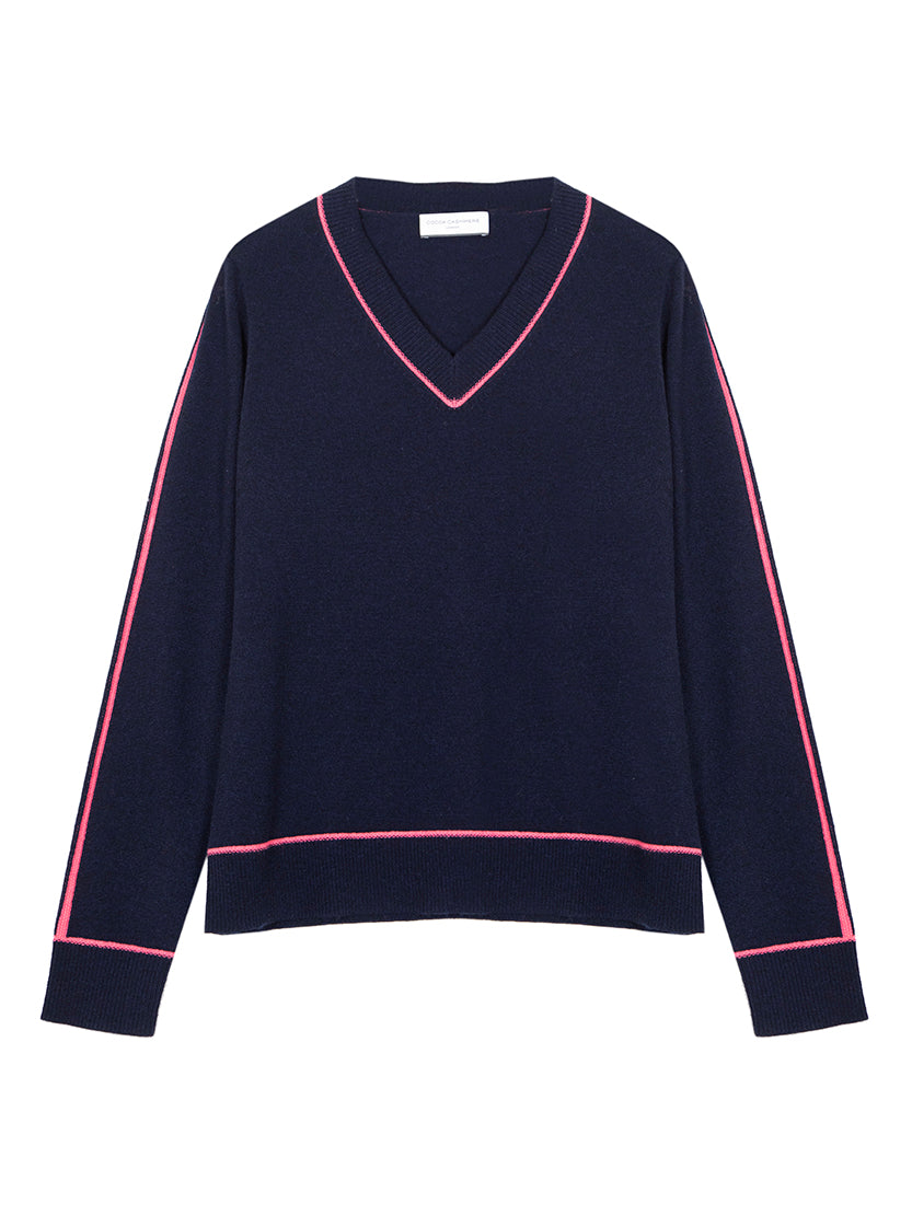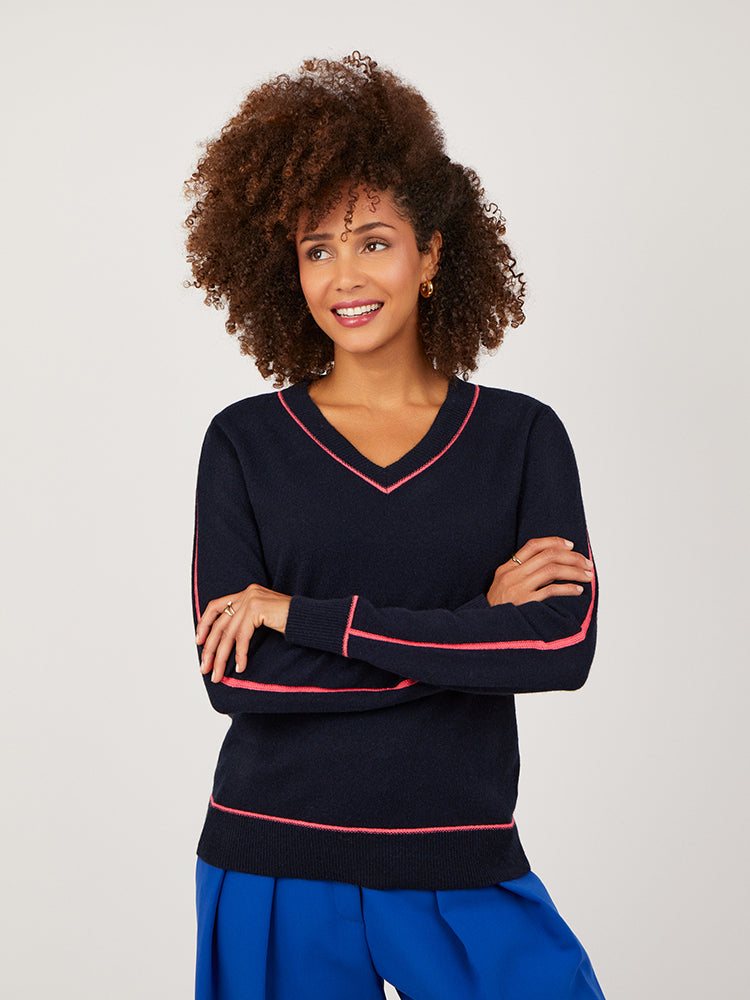 The Madison jumper in Cosmos is a popular Cocoa shape, a neater fit style with set-in sleeves, v neck and contrasting coloured stripe on the neckline and sleeves. Wear with jeans and classic white trainers for a casual look, or echo a colour within the stripes for a bold colour block outfit. Also available in neon Bowie and Grape.