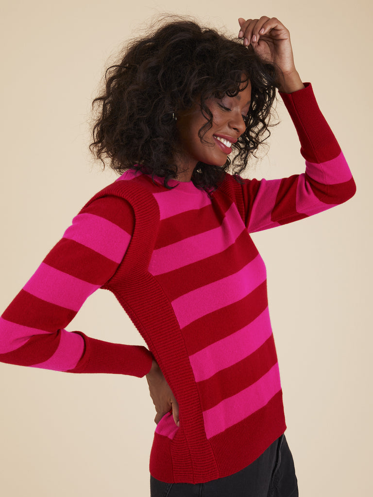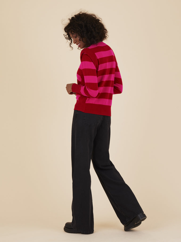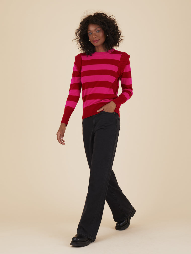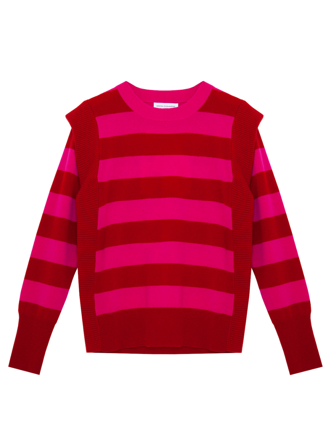 Featuring extended shoulder detail and contrasting coloured stripes create a unique piece. Pair with wide leg trousers or jeans to create a flattering and balanced silhouette.