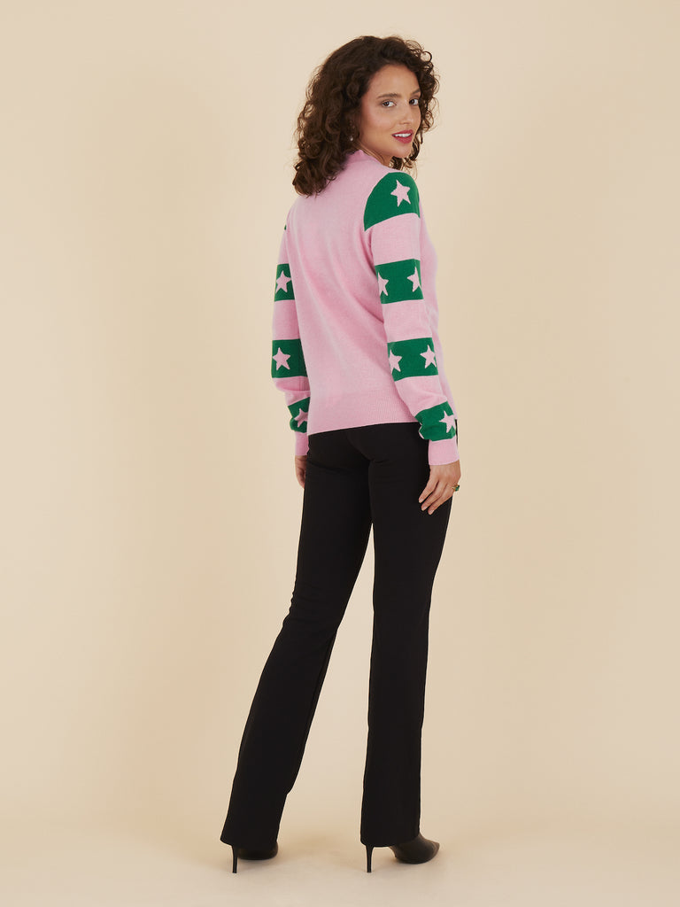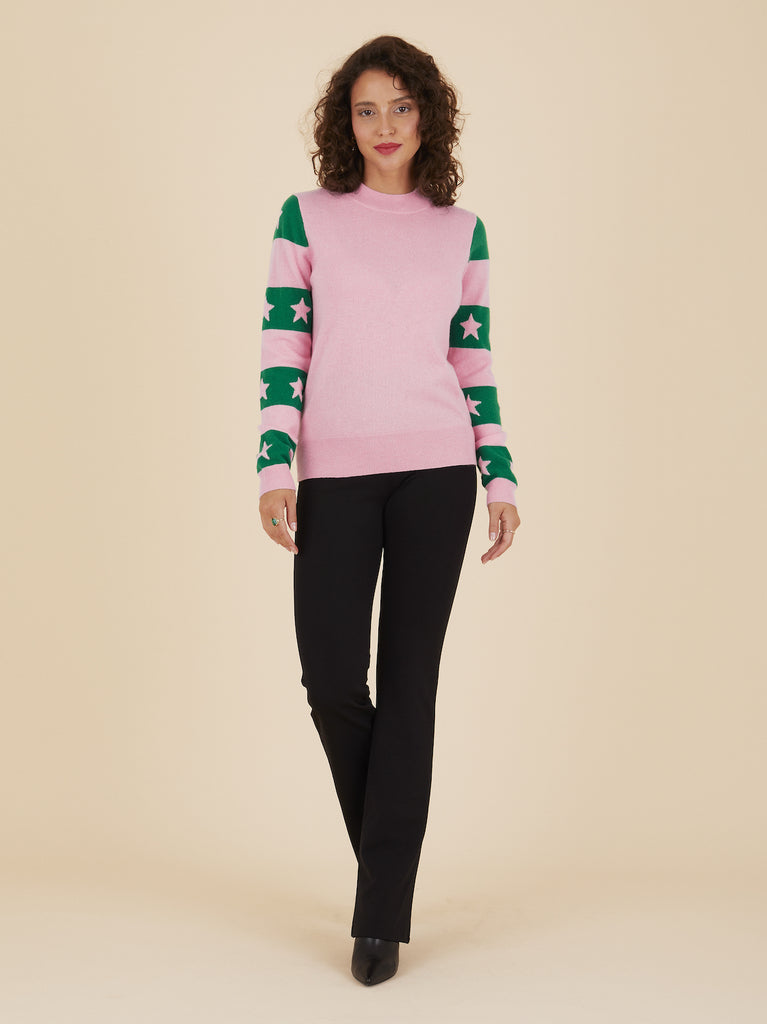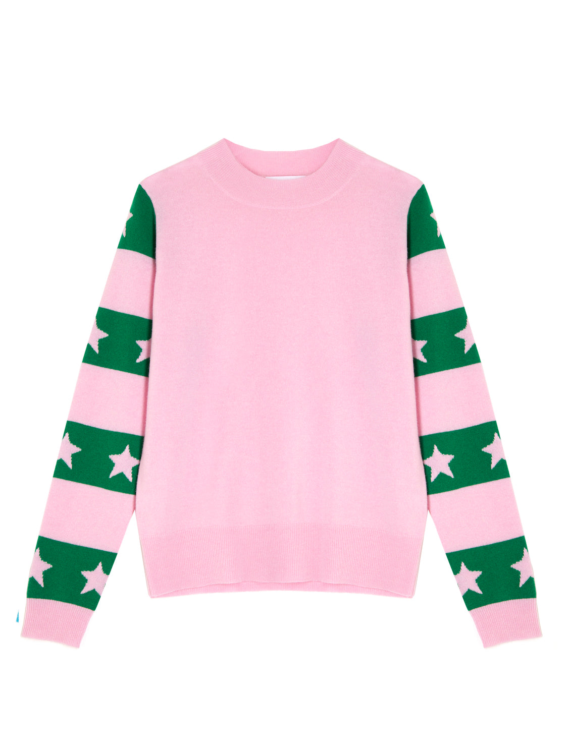 The Mika Jumper in Lolita Pink is a classic neater fitting crew neck featuring a vibrant green star and stripe pattern on each sleeve. Pair with tailored trouser and trainers for a chic, casual look.