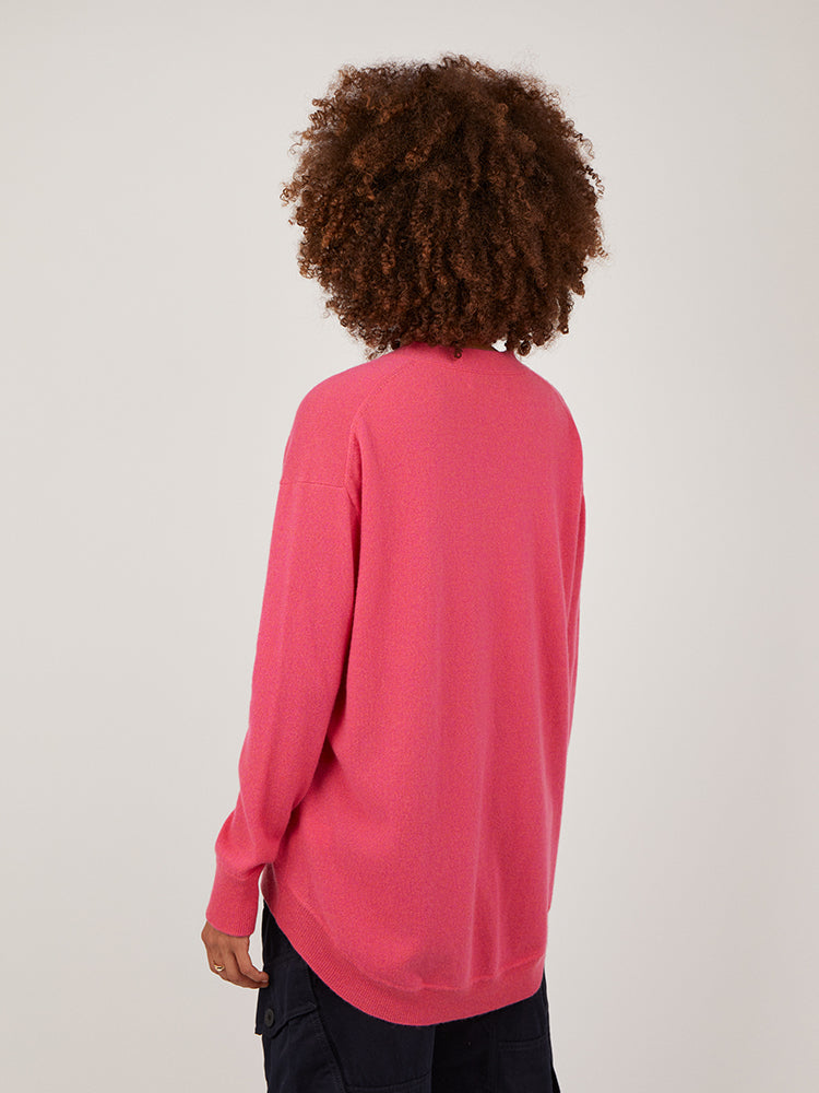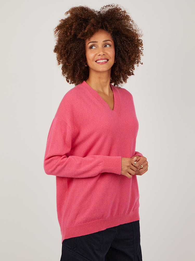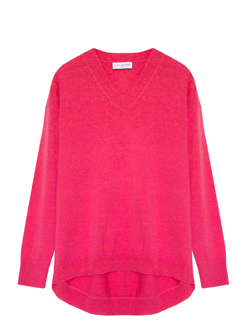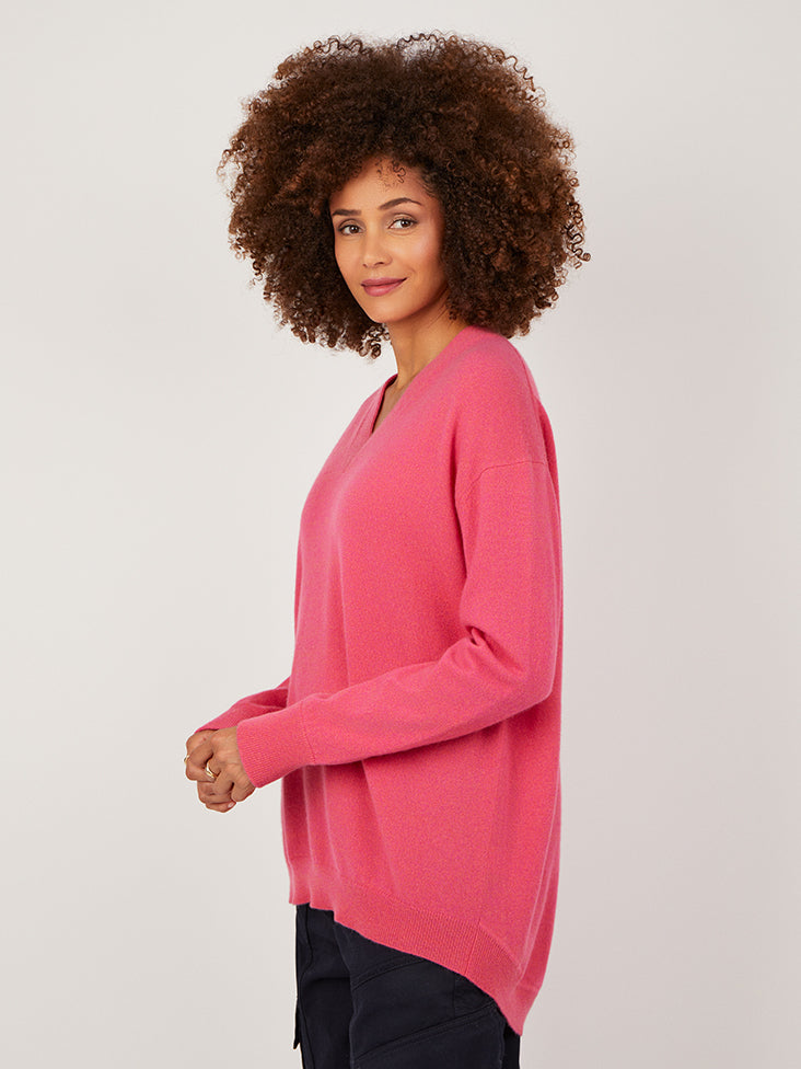 A classic Cocoa shape, the Natasha jumper is a well loved style. Knitted in our super soft cashmere yarn, the shape is boxy and relaxed with a v neck. The Natasha features a distinctive dipped hem, longer at the back.