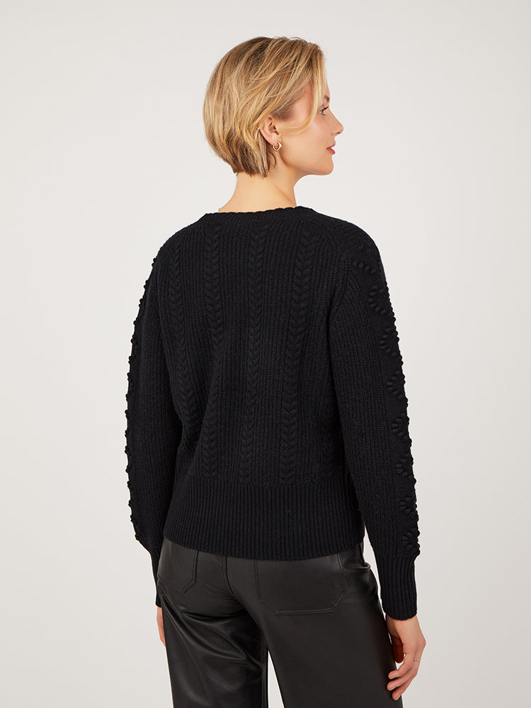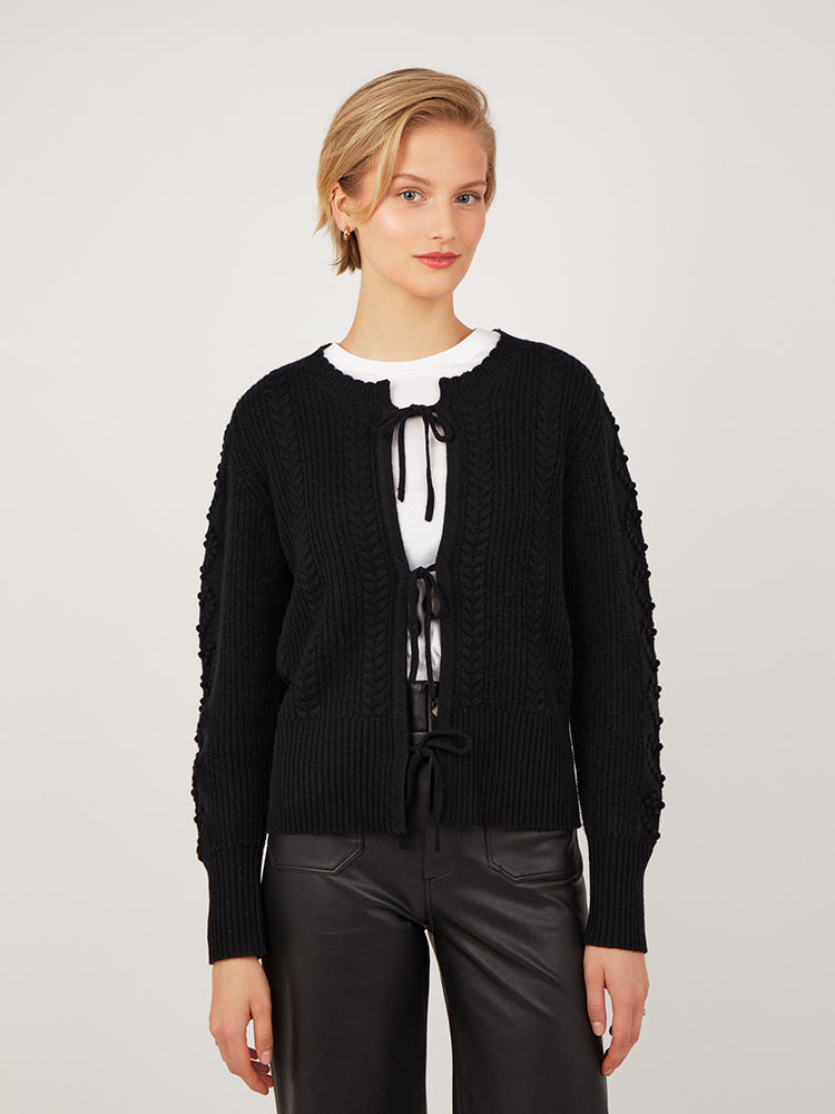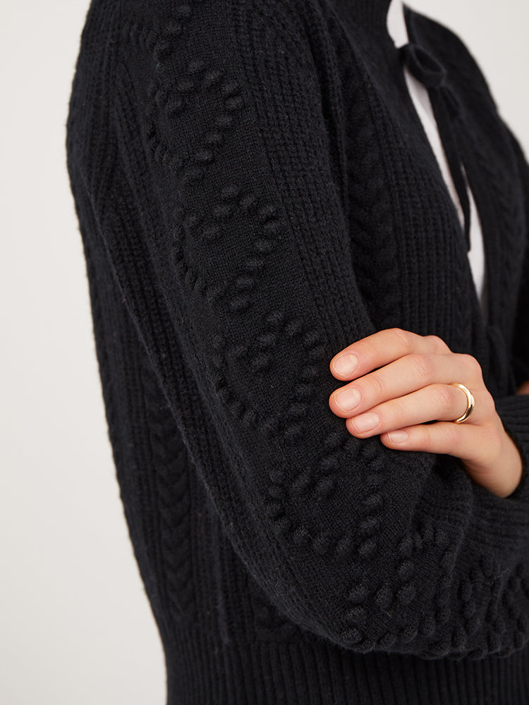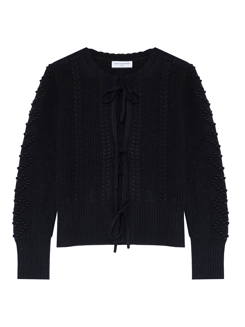 Made from a soft merino wool and cashmere blend yarn, this cardigan is knitted using a combination of cable and bobble stitches finished with a pretty scallop detail at the neck and a trio of tie fastenings. Also available in Pearl.