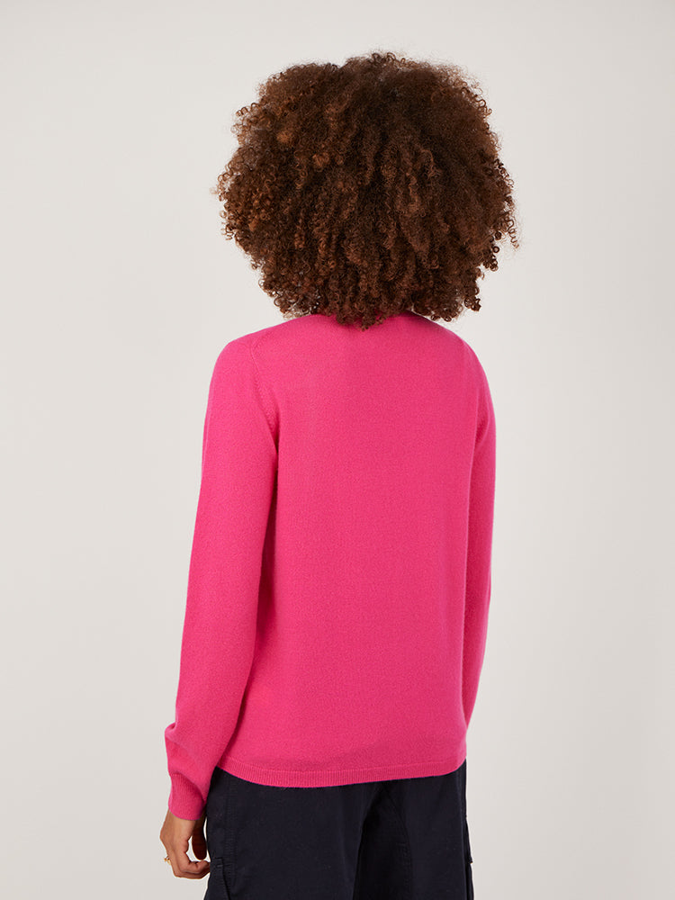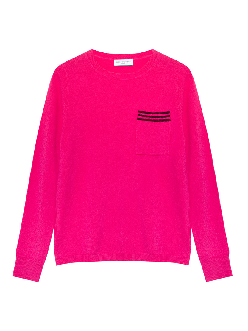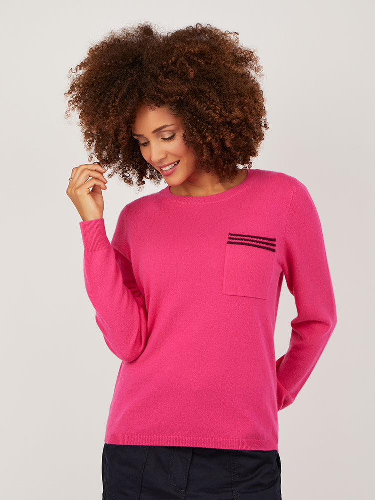 A Cocoa favourite, Sachelle features a front pocket detail on a classic set-in sleeve crew neck shape. Knitted in our 100% cashmere the jumper comes in a vibrant Cabaret hue with a contrasting stripe on the pocket. Also available in Lagoon and Green Lake.