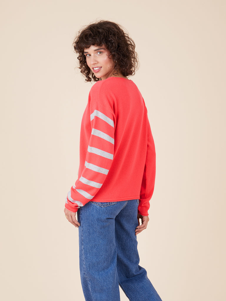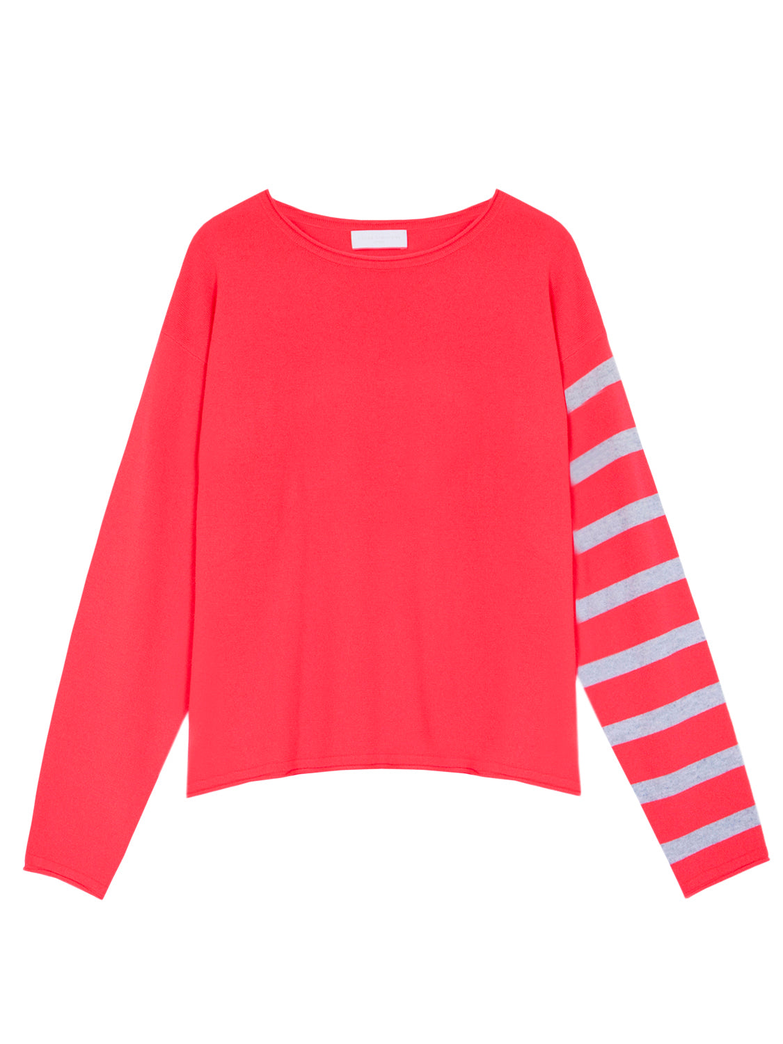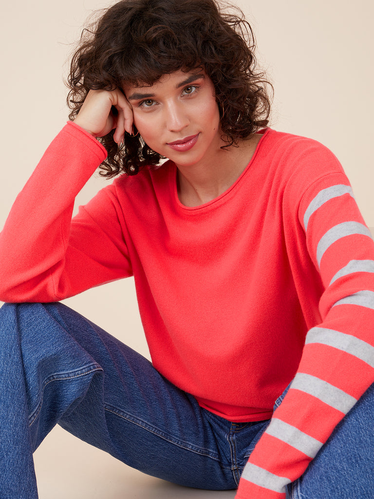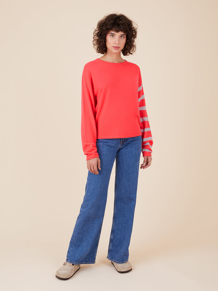 The Sara Jumper in neon Bowie is a relaxed style in our standard 100% lightweight cashmere featuring contrasting Cloud Grey stripes along one sleeve.