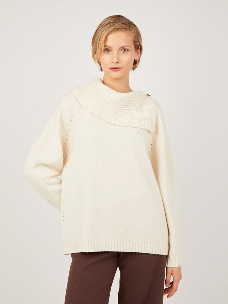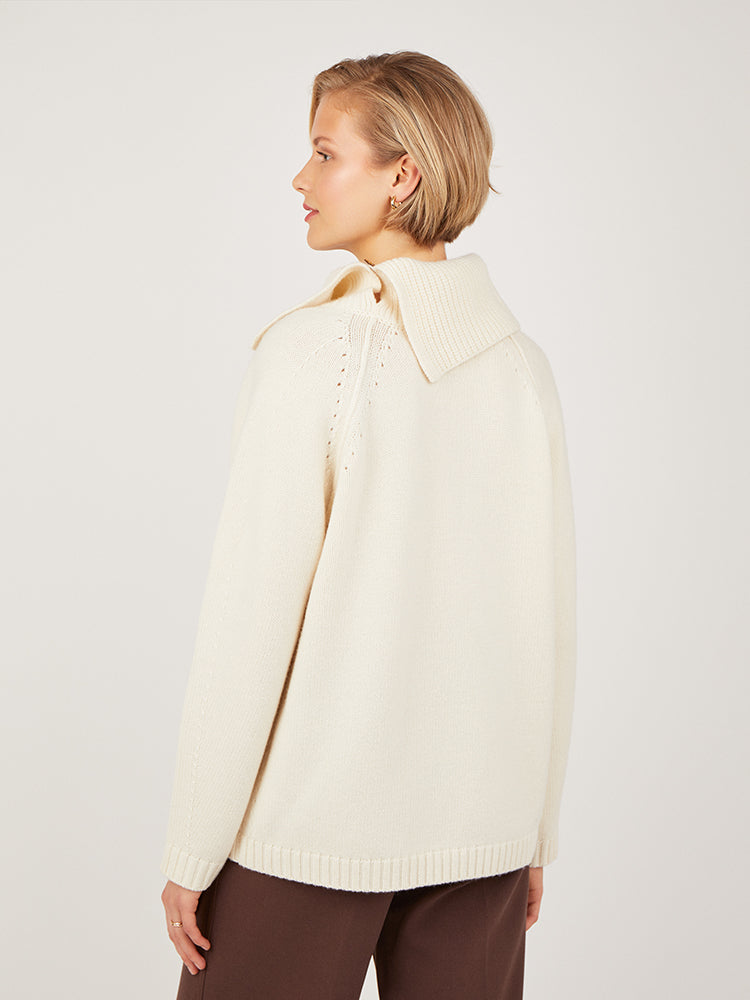 The Saylor Jumper features a flattering relaxed shape with an oversized ribbed collar that can be worn two ways. Simply button up or leave open with an exaggerated collar. Featuring a subtle pointelle stitch detail to elevate the design, raglan bell sleeves, combined with the heavier weight makes this a truly luxurious wardrobe must-have this season. Also available in Storm Grey and Mulberry.