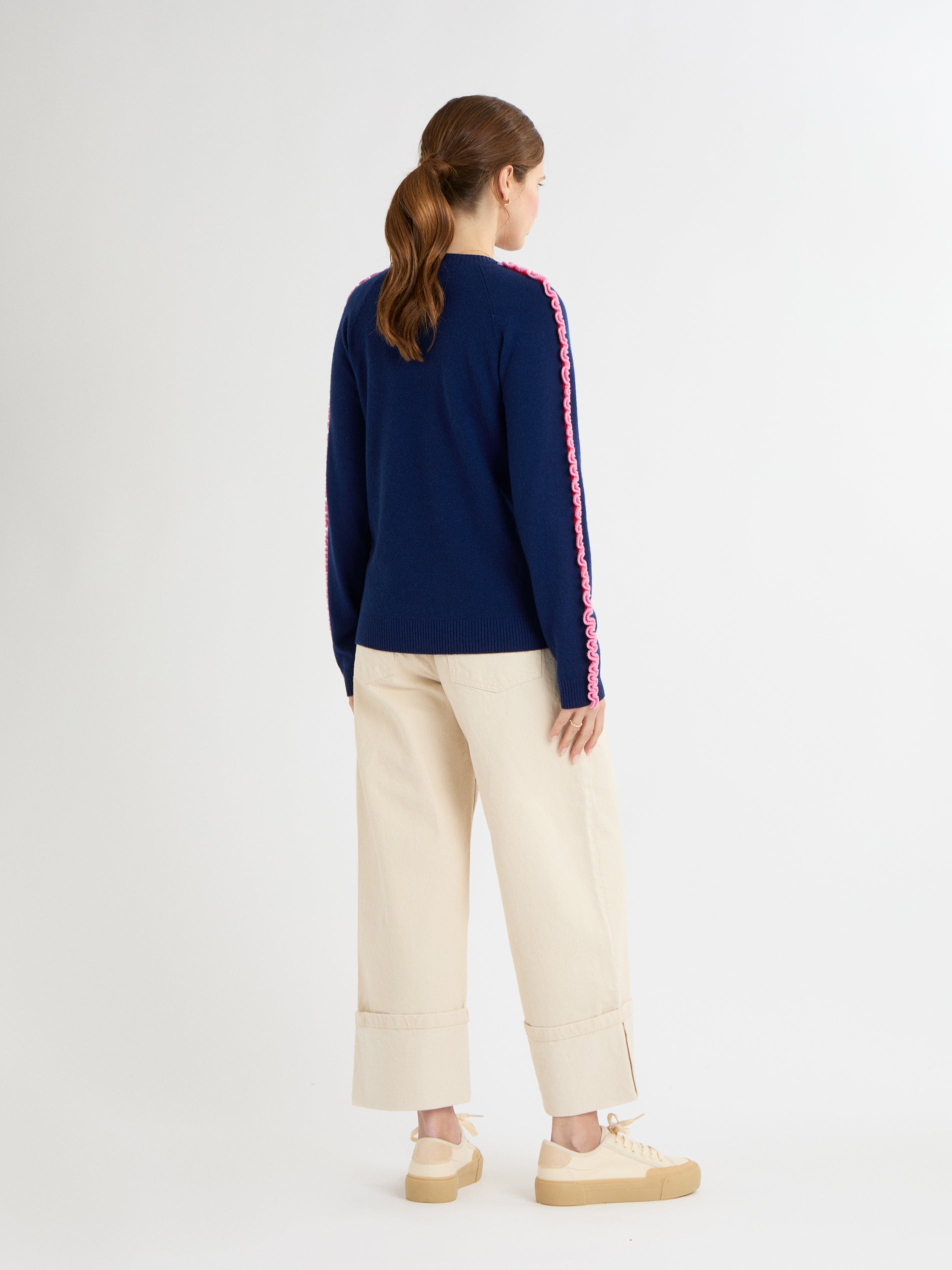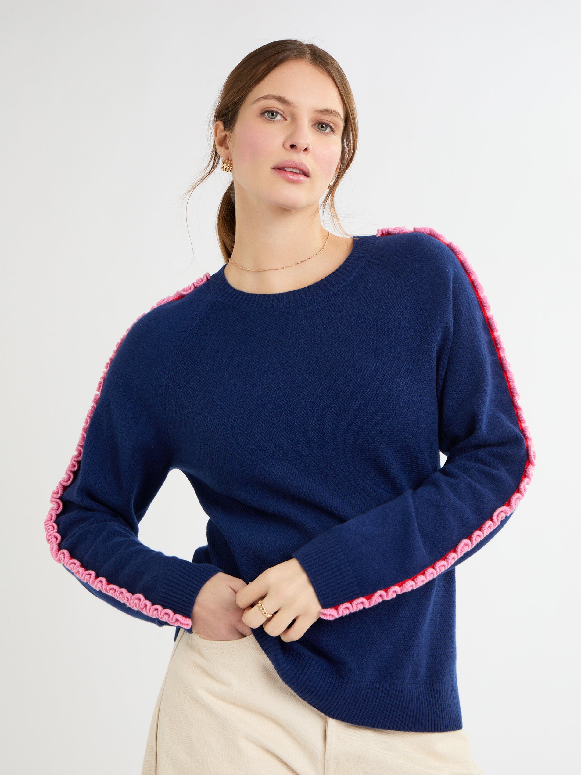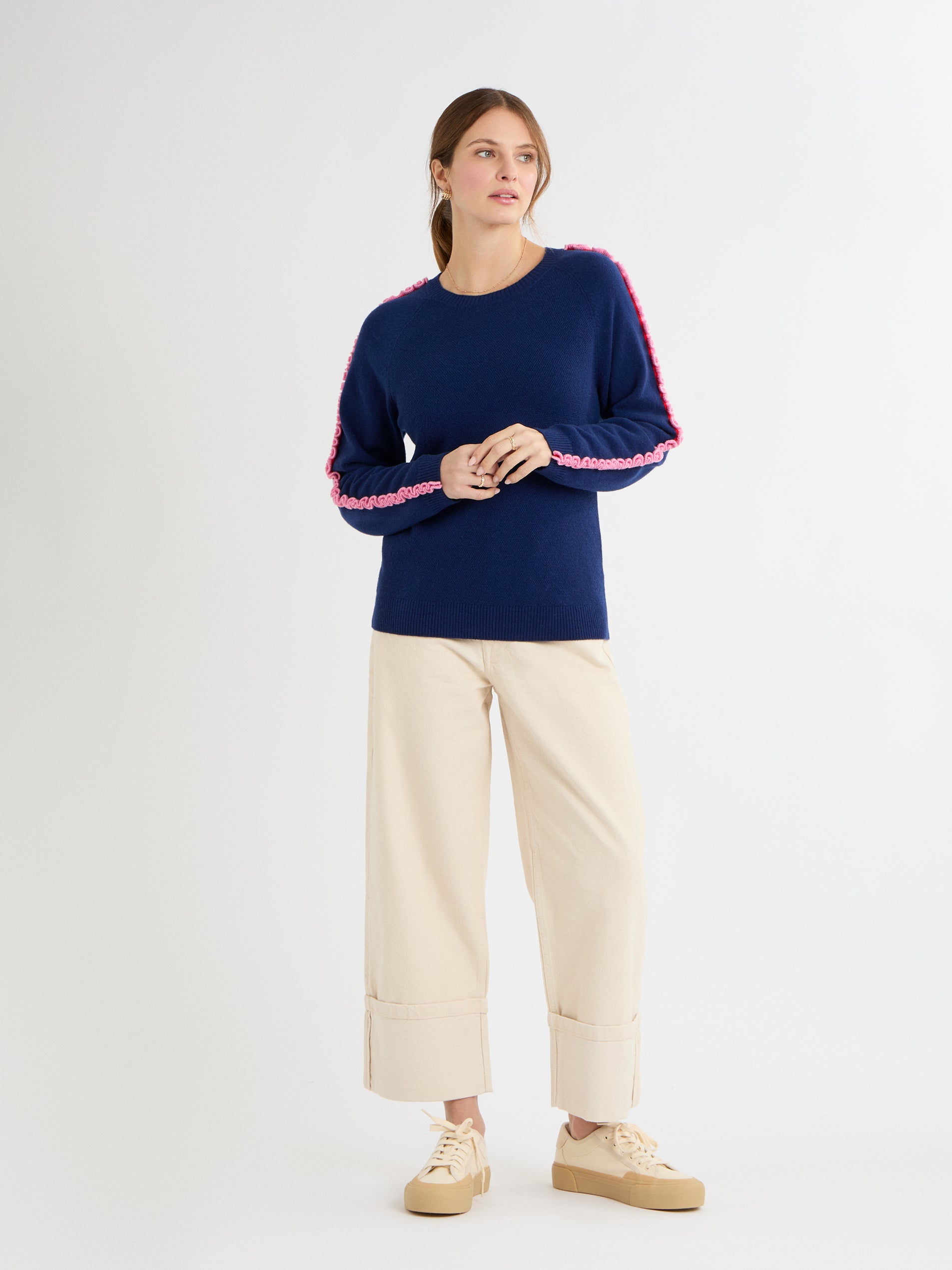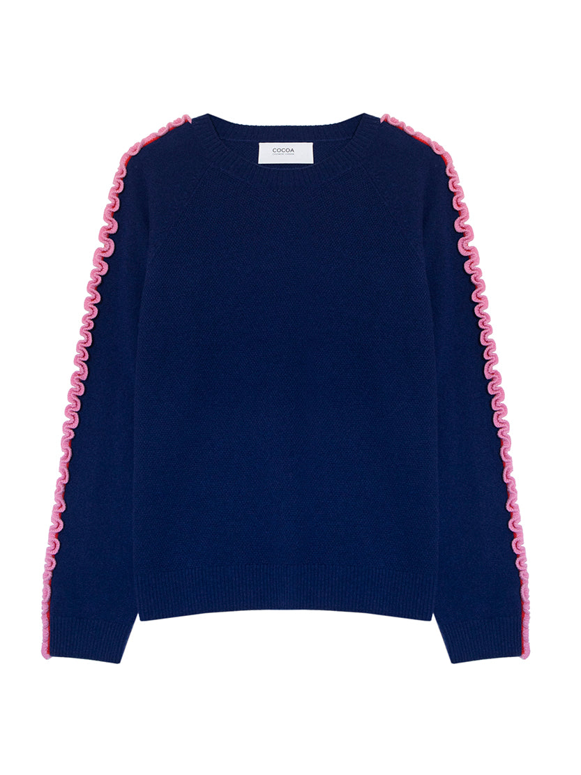 The Katelyn Jumper is a fun, effortless knit that adds a touch of personality to your everyday style. Its relaxed, boxy shape and raglan sleeves make it easy to wear, while the soft contrast-colour ruffles along the top of the sleeves bring a playful, modern twist. Made from 100% cashmere in Boating Blue, French Navy or soft Grey Mist, this medium-weight jumper is luxuriously soft and perfect for layering, adding a cheerful, pop of detail to any outfit.