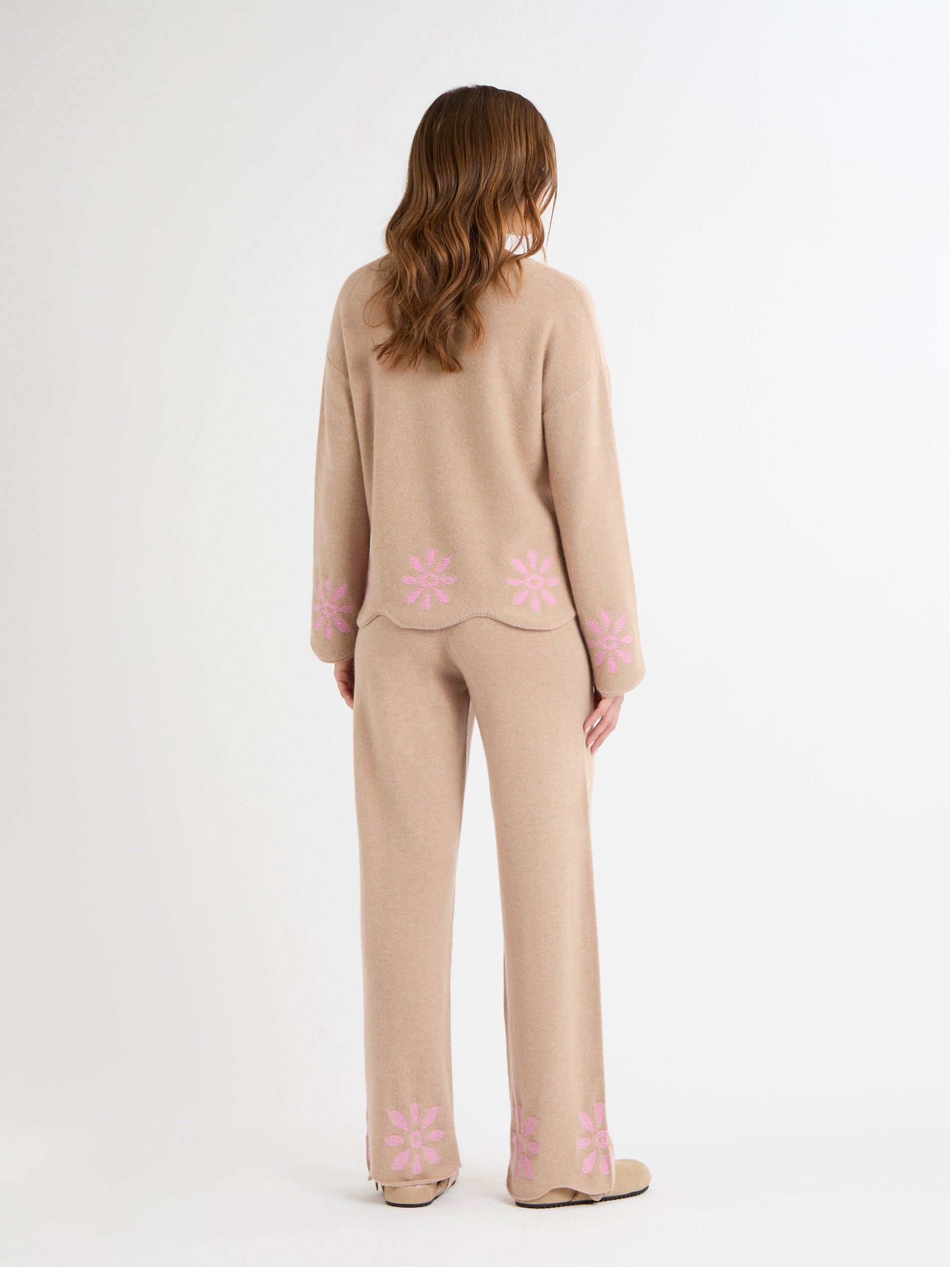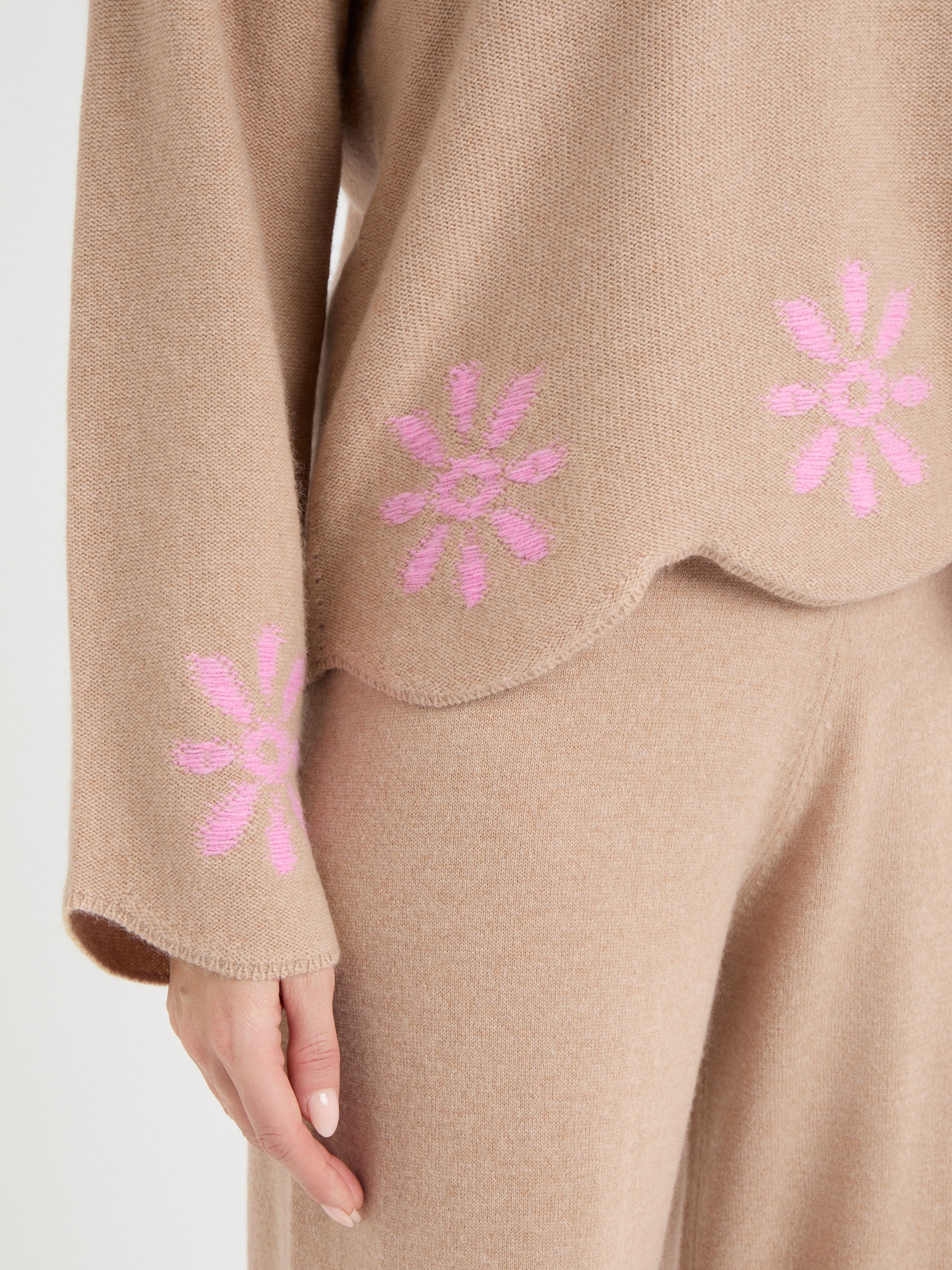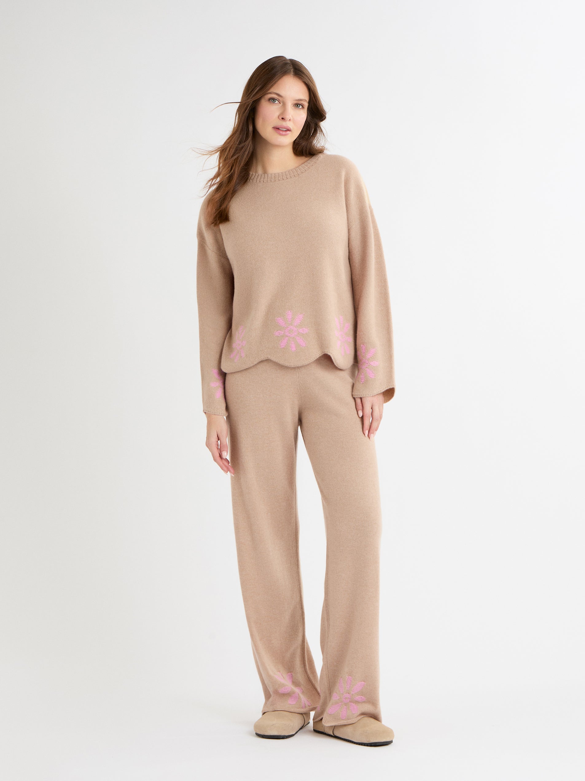 The Rosalina Jumper is a relaxed, easy-to-wear knit with a boxy shape and softly dropped shoulders. Its classic crew neck and delicate floral pattern give it a refined, feminine touch. Finished with a scalloped hem and cuffs in a pointelle pattern, this 100% cashmere jumper is luxuriously soft and perfect for layering in style. Available in soft Cornflower or warm Roasted Almond, it brings gentle colour and texture to any wardrobe.