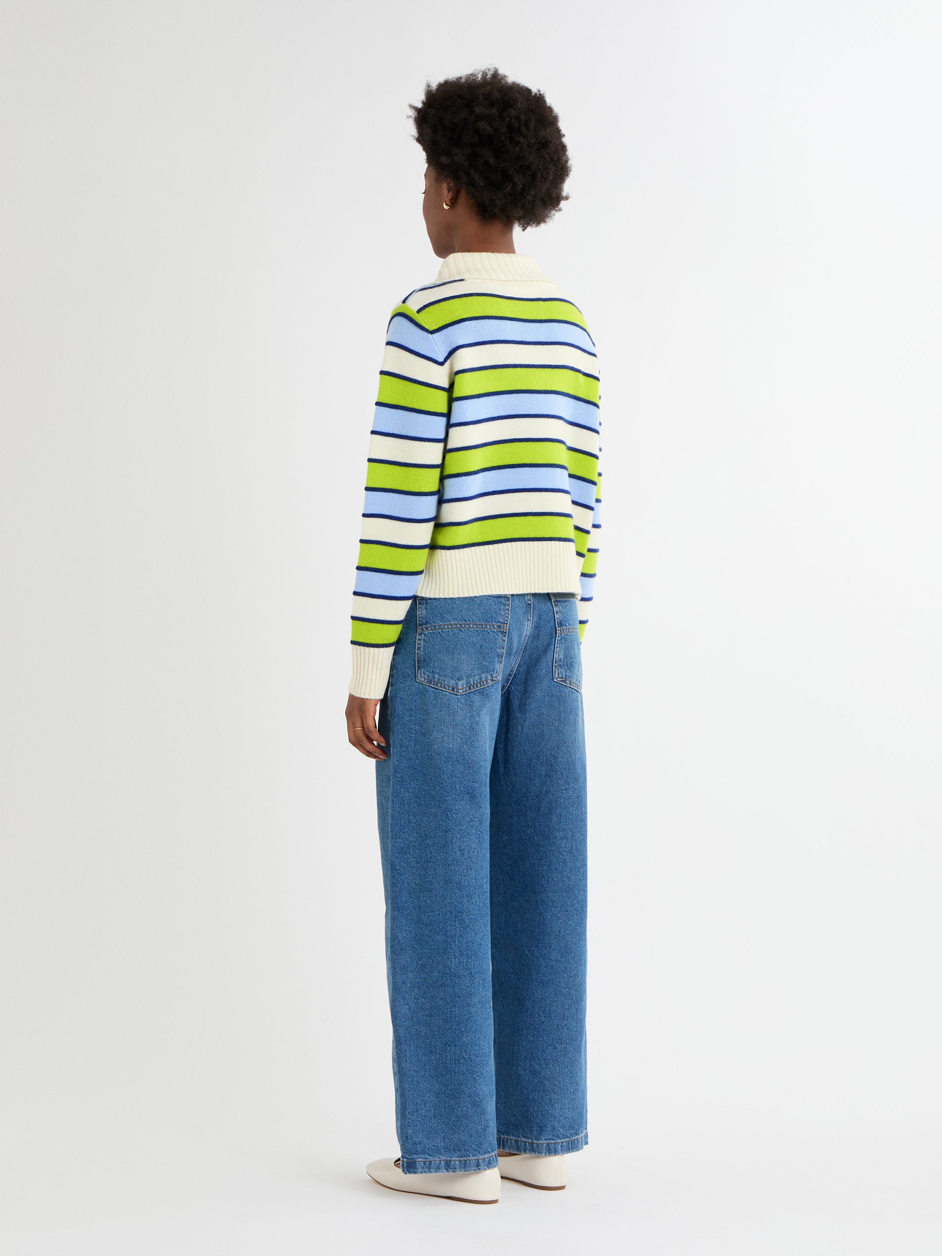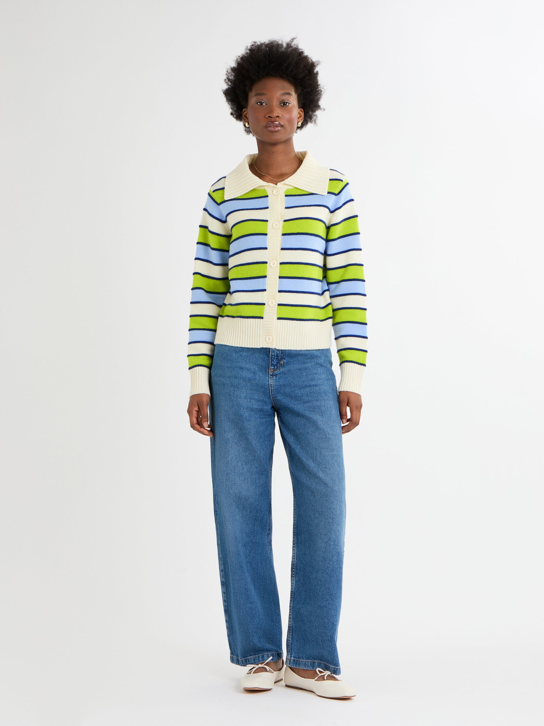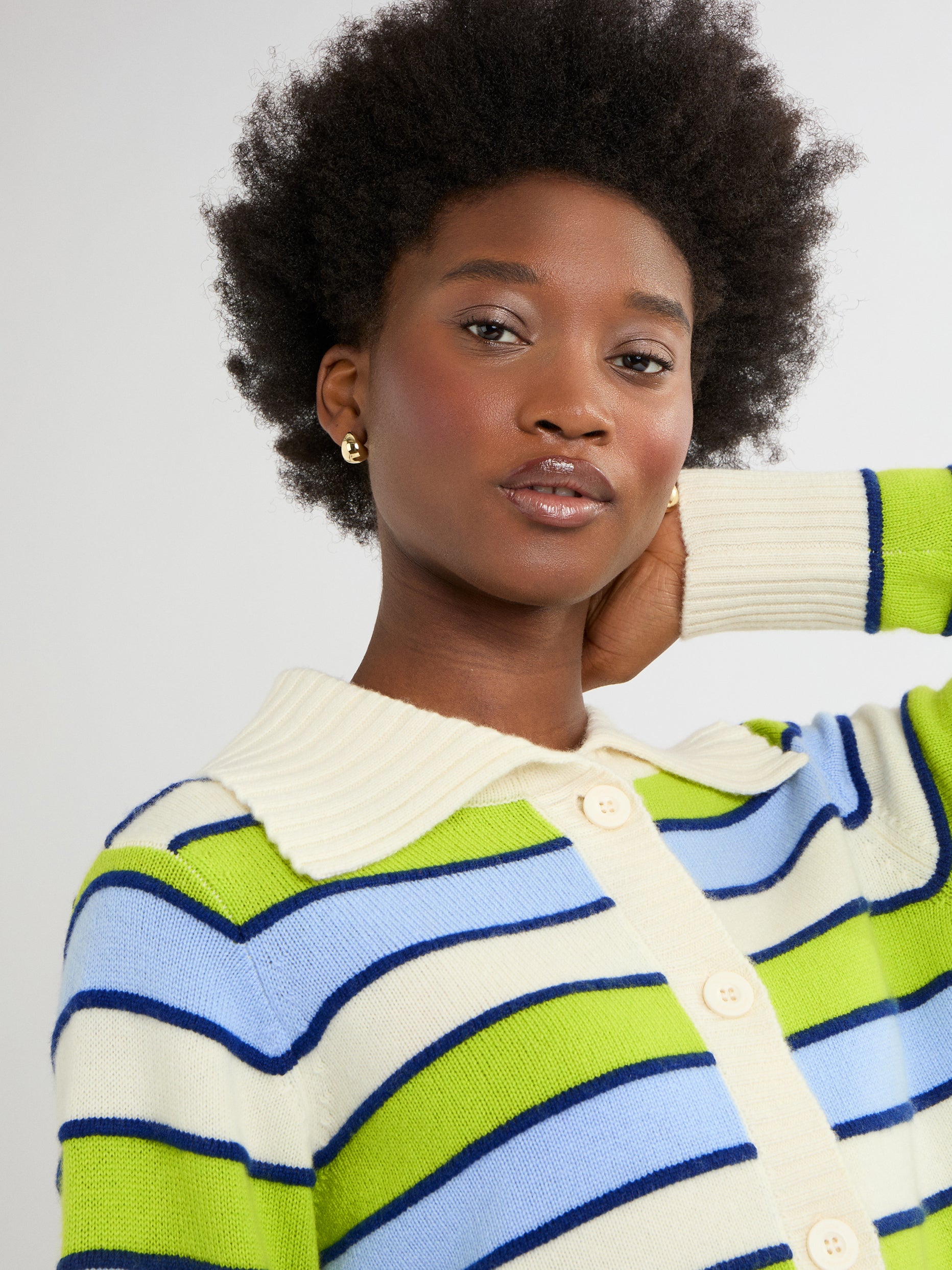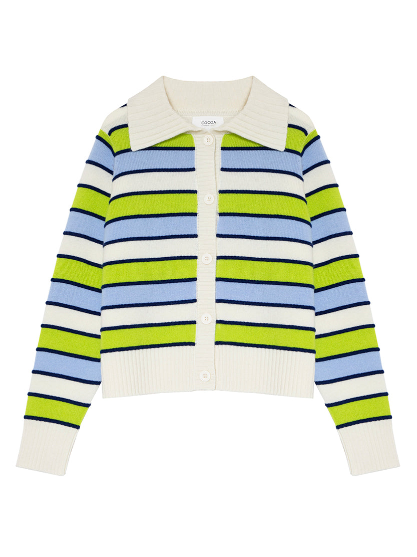 The Xena Cardigan is a fresh, easygoing layer that adds a pop of personality to any outfit. Its neat, flattering shape and set-in sleeves make it feel polished, while the classic collar and subtle stripe detail bring a modern, playful touch. Made from a luxuriously soft wool-cashmere blend in Pearl with a hint of bright Classic Lime, this medium-weight cardigan is perfect for layering over dresses, tops, or knits for effortless summer style.