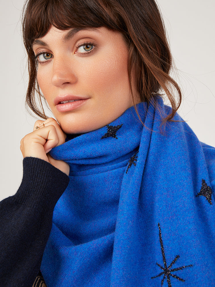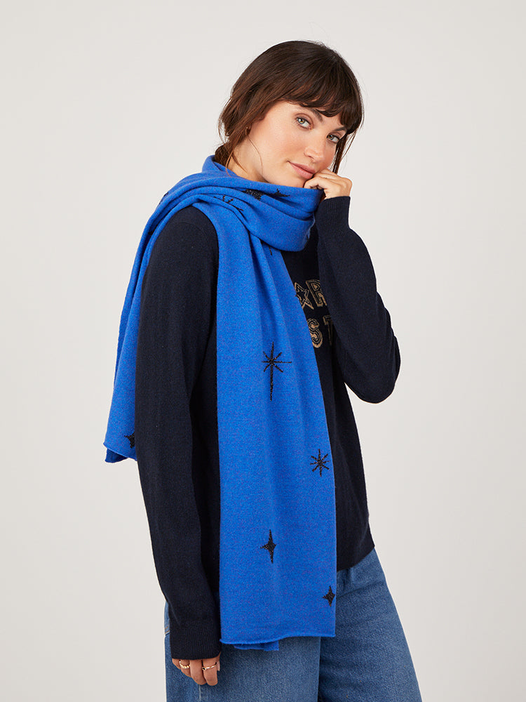 The Celeste Scarf features a beautiful star jacquard pattern in cosmos lurex on the front and back. A great piece to dress up your outfits this season.
