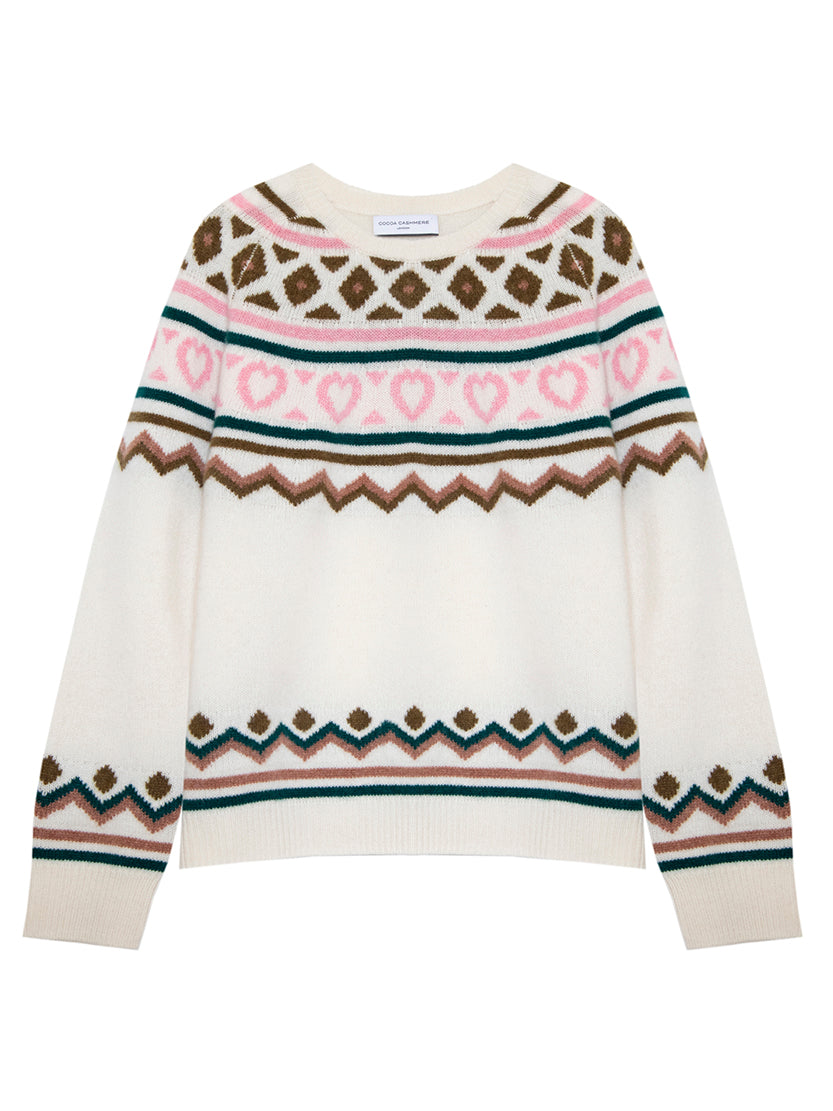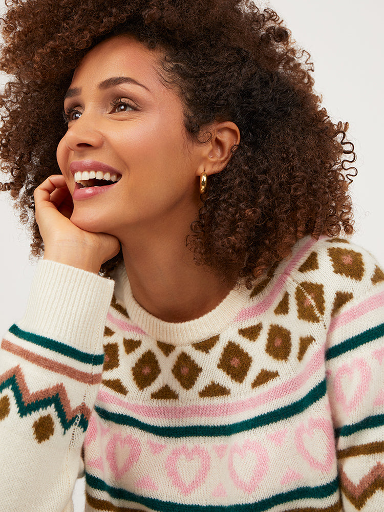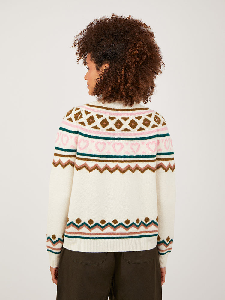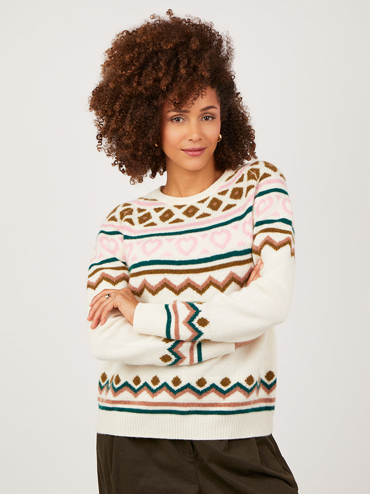 A classic knit perfect for the Holiday season. Kai features a distinctive fairisle placement pattern in a jacquard knit. Pair with a maxi skirt for a dressier look, or dark straight leg jeans for something a little more casual. Also available in a Mole colourway.