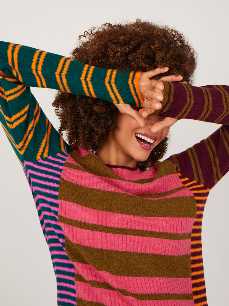 The Ximena Jumper features a unique, contrasting colourful pattern on the main body and sleeves. A neater fitting style knitted in our 100% cashmere yarn with thumb holes on the sleeve. Simply pair with your favourite blue or white jean for the ultimate day time look. Also available in a Toffee Stripe.